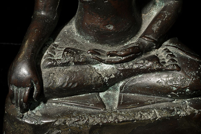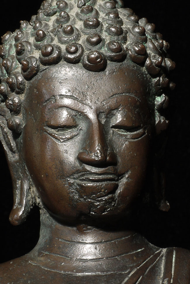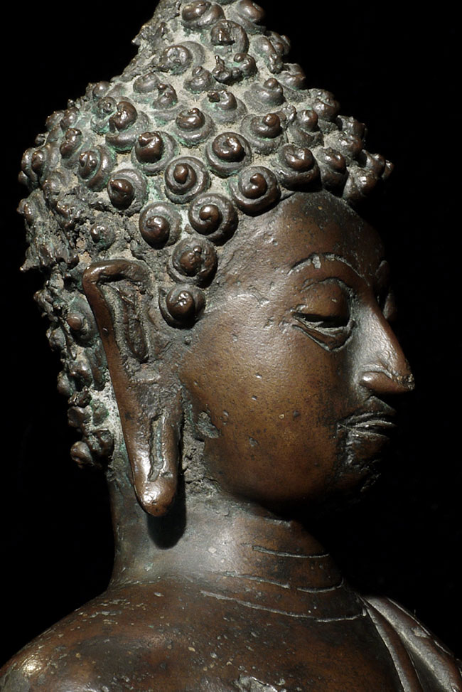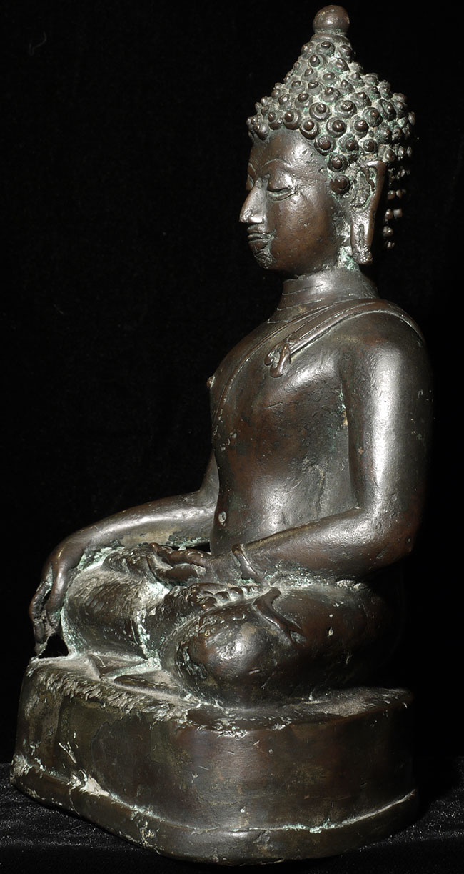 18/19thC Northern Thai Buddha. Numerous casting flaws- still, he radiates calm. Sit 8" tall, and heavy.