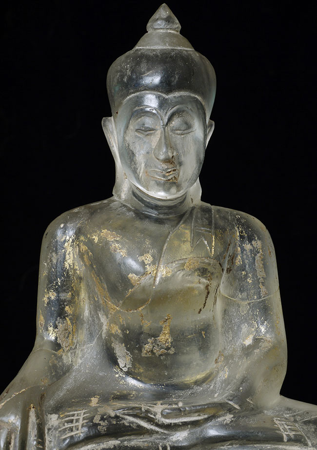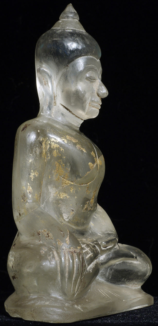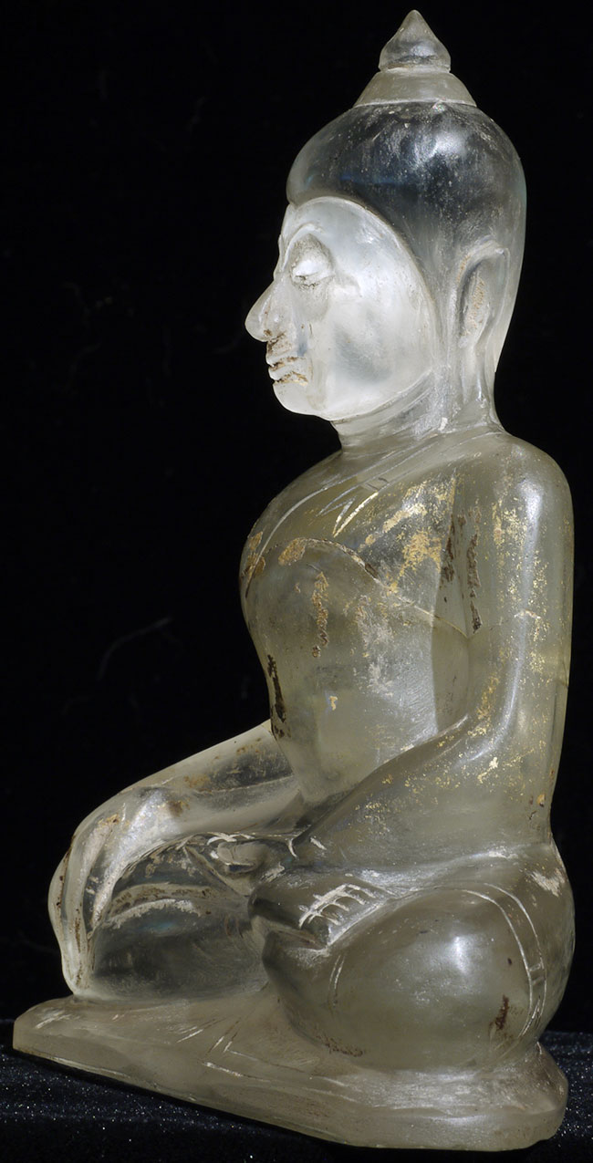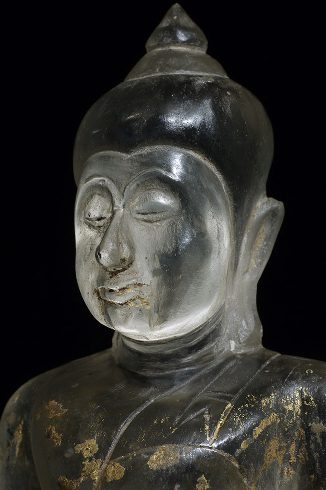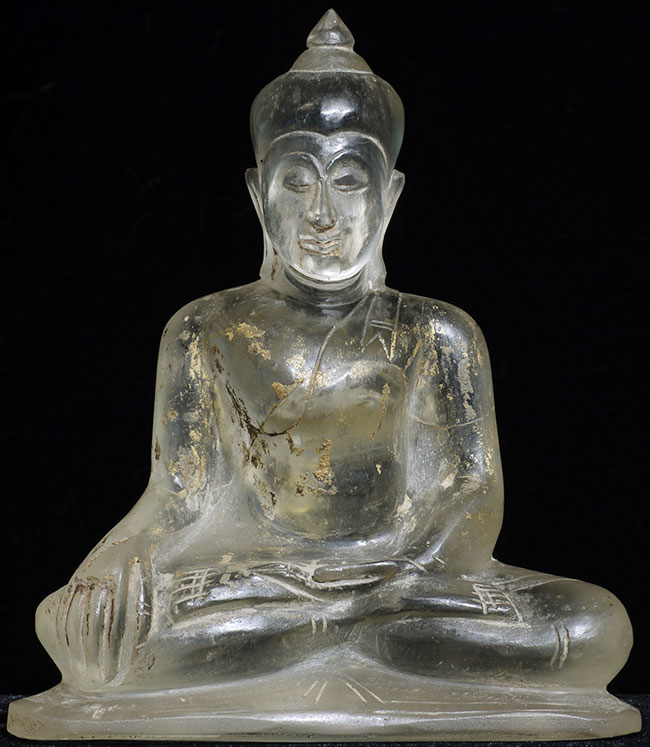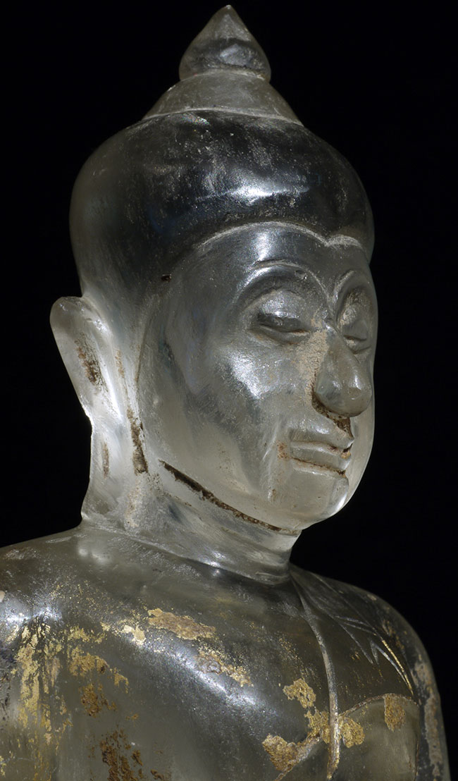 Beautiful 17/18thC Thai glass Buddha. Extremely heaby for its size- possibly precious metal mixed in to the glass. Probably the nicest face I have come accross on this type of Buddha. Sits 5.25" tall