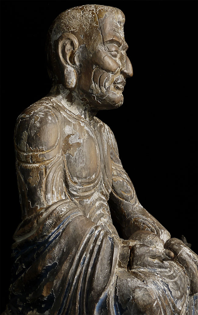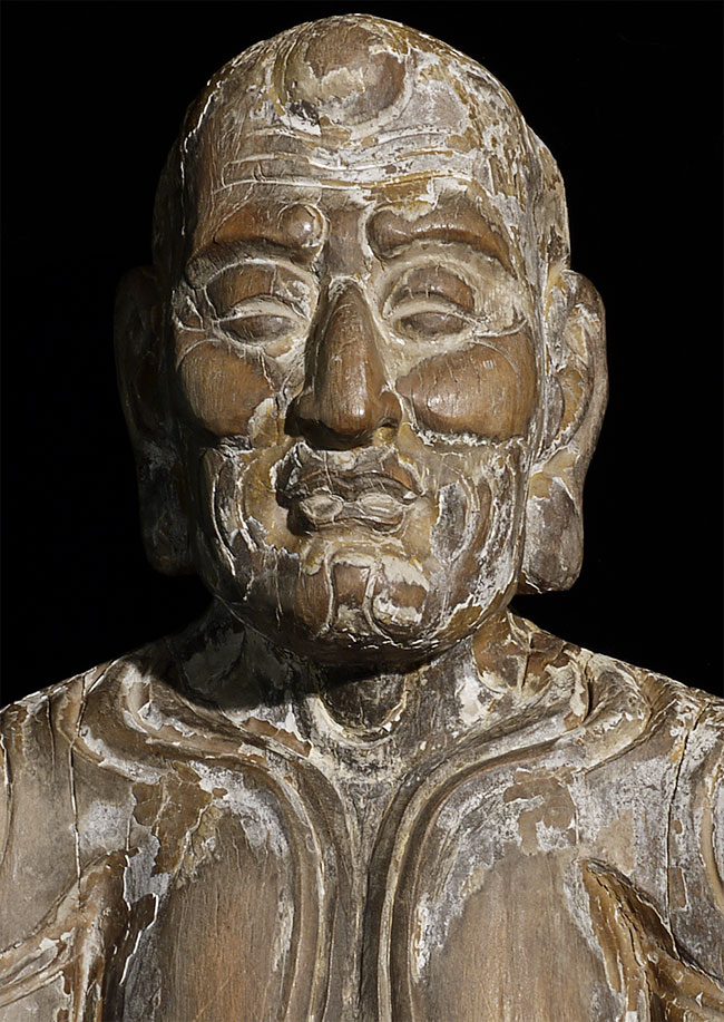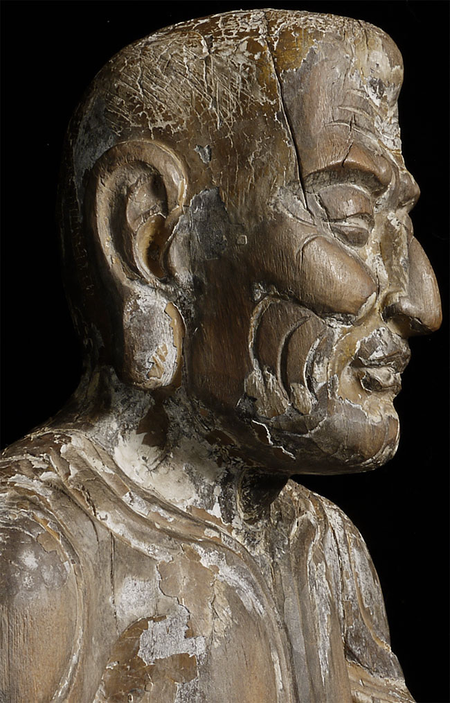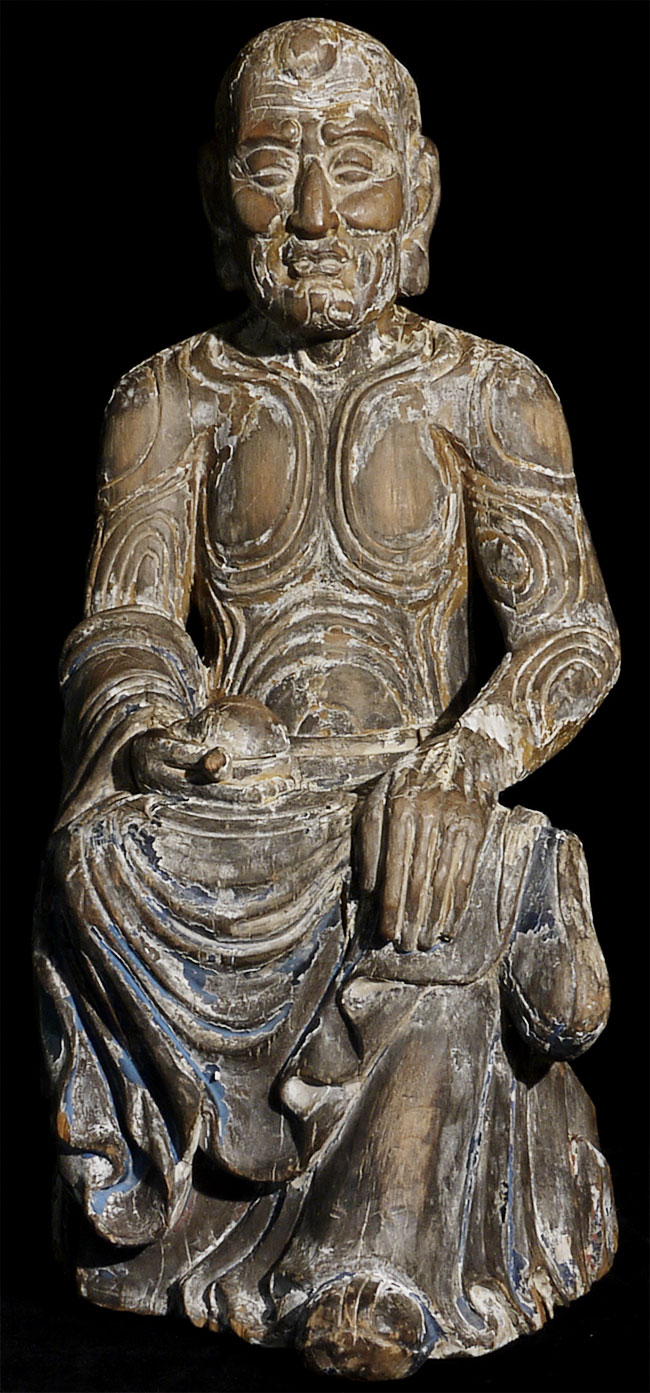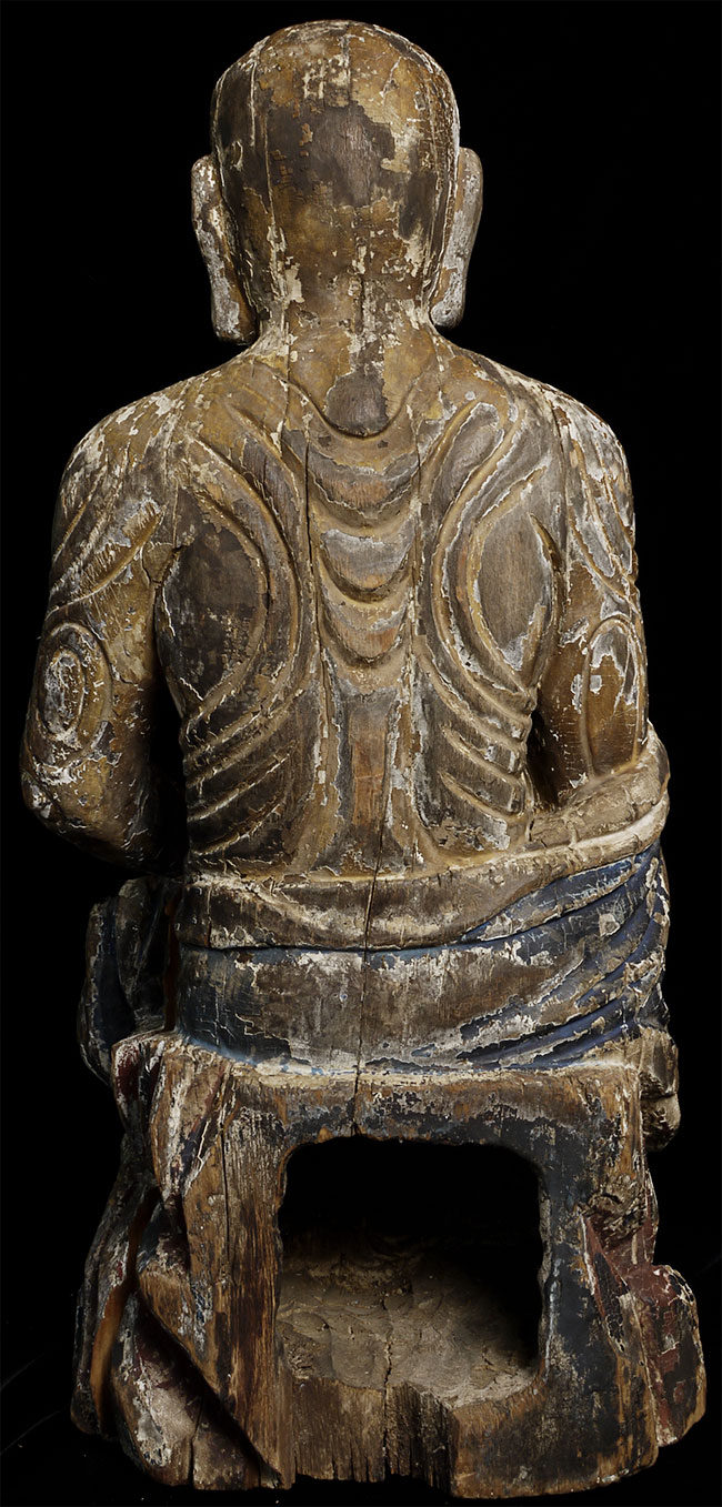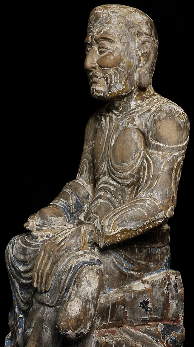 Ming/Ching Chinese Ascetic Monk sculpted in wood, sitting in deep contemplation. Beautiful interplay between the carved swirls and traces of original paint. Was originally consecrated. Extremely well carved. Large at 27.5"