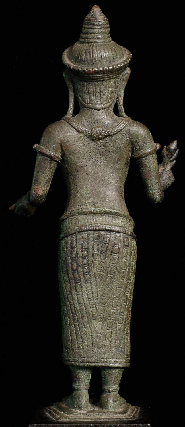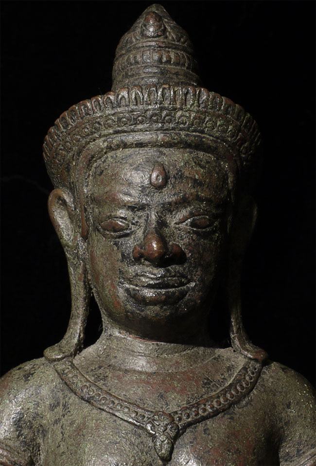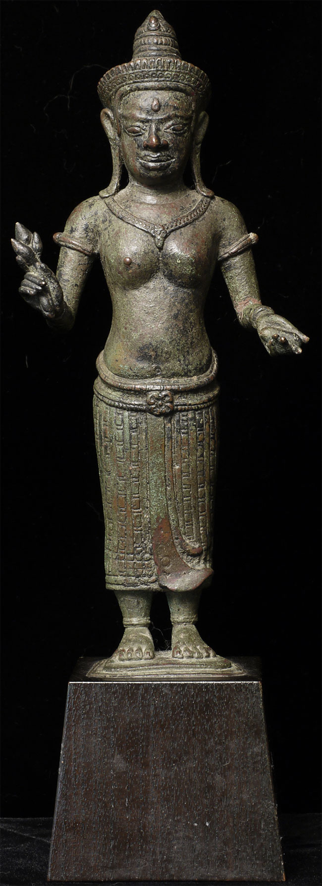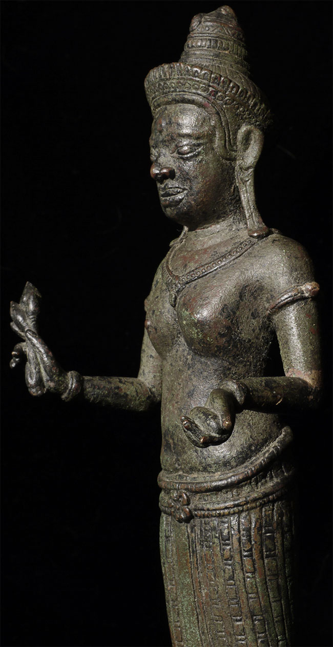 It is a superb original 11/12thC Cambodian Uma. At this quality it was probably made at one of the royal foundaries. The one issue is that the head appears re-attached. While very well done and extremely hard to tell from the front- upon close inspection it is obvious on the back of the next. Piece is 8.5" tall, base adds another 2.5" in height