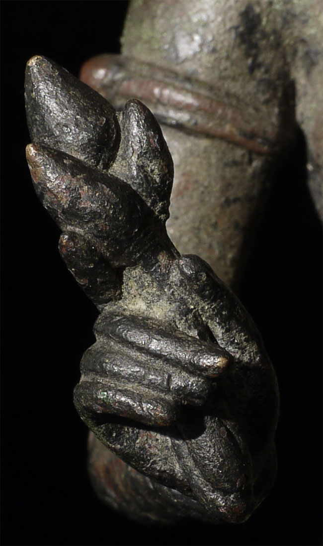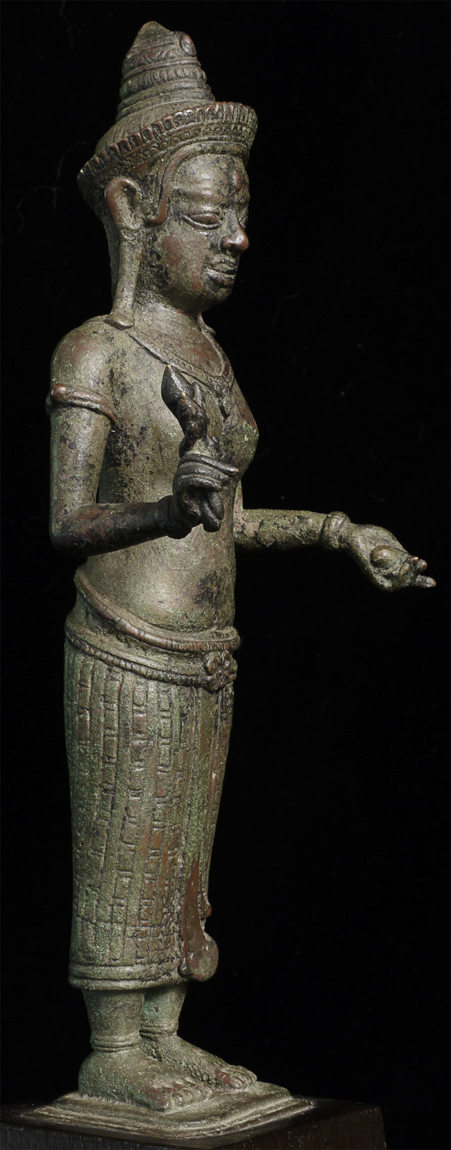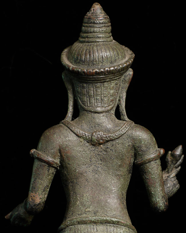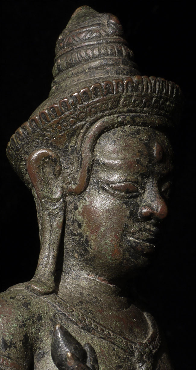 It is a superb original 11/12thC Cambodian Uma. At this quality it was probably made at one of the royal foundaries. The one issue is that the head appears re-attached. While very well done and extremely hard to tell from the front- upon close inspection it is obvious on the back of the next. Piece is 8.5" tall, base adds another 2.5" in height