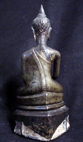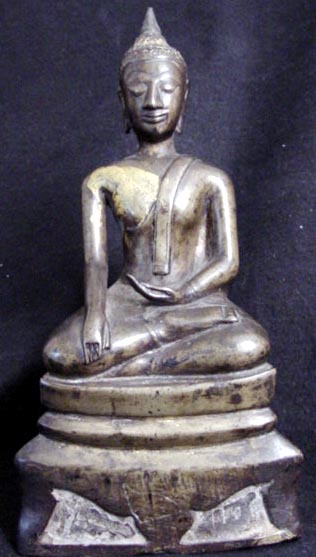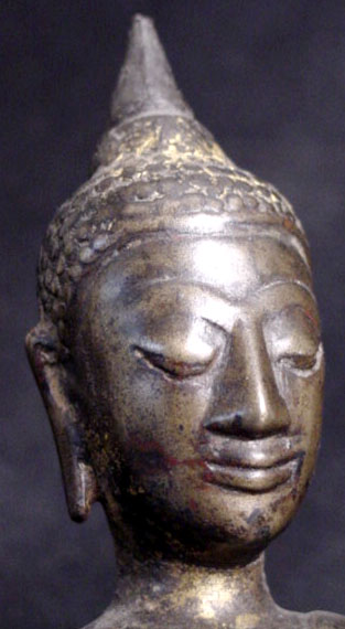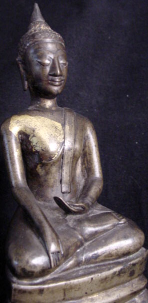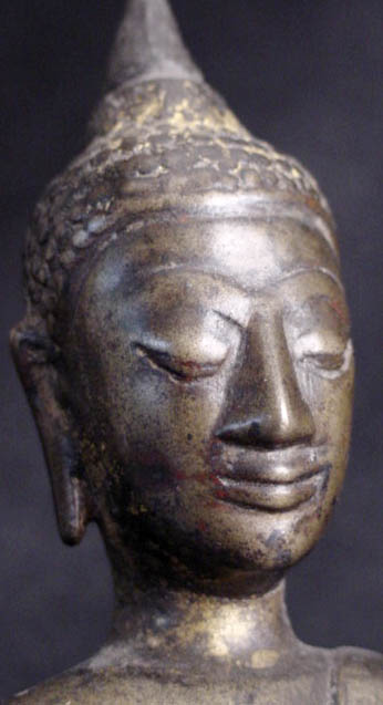 This is a very fine Thai Buddha from the Kingdom of Kampen Phet, which is near Sukothai and was founded by the grandson of the last Sukothai King. It is extremely well cast and finished, and has one of the best faces I have seen on this type in a long time. The base is a distinctive type that was commonly used in Kampen Phet. In outstanding condition, although he does have loss to the fingers on the right had. The fine finishing and over 500 years of life have left him with a"smooth as glass" surface.