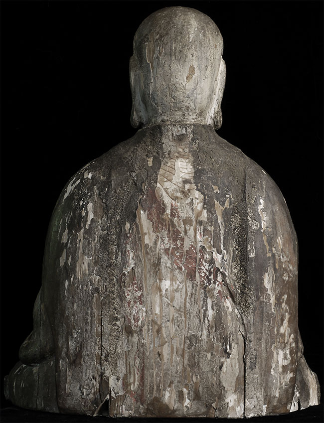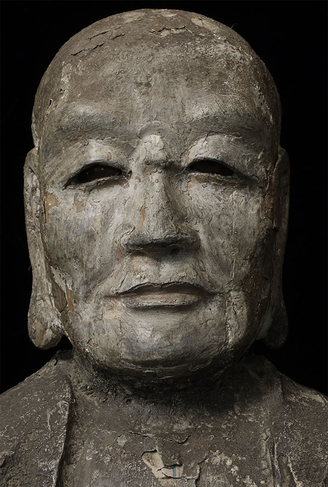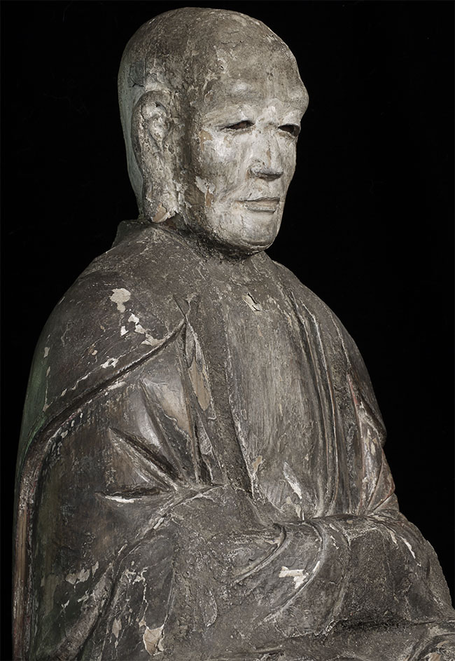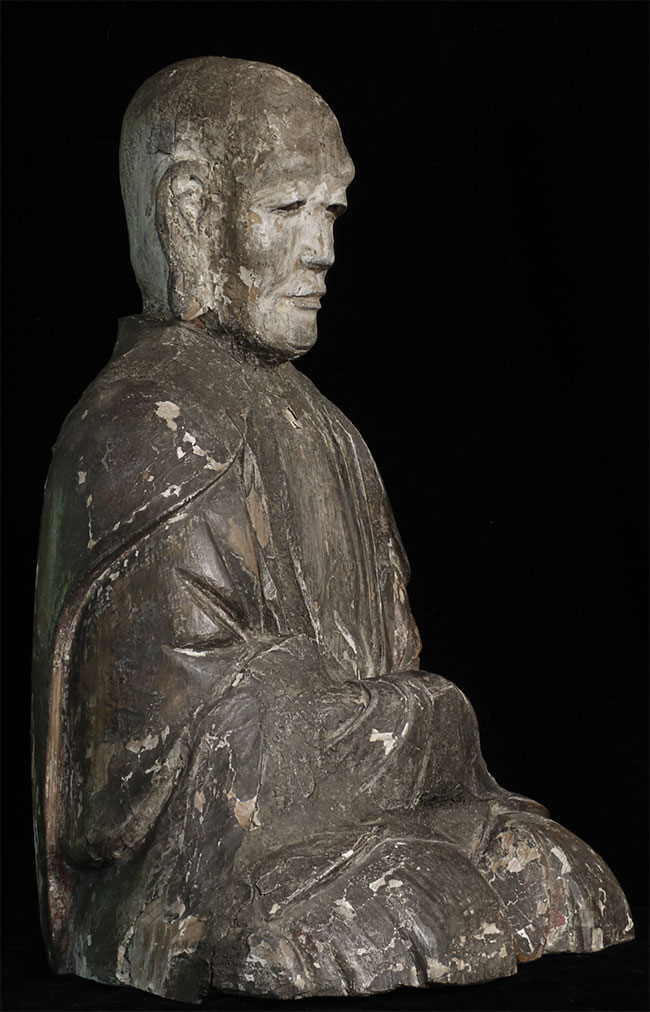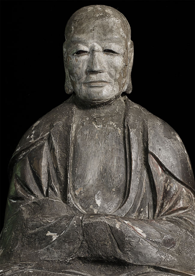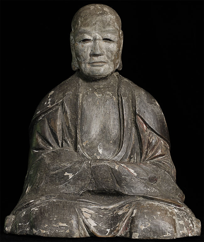 Very early Japanese seated monk. I believe it is pre-Edo, and is probably over 500 years old. His penetrating glass eyes are quite powerful. Large at approximately 17.5" tall. Beautiful!Wear to the surface, and some of the underside supports appear to be replaced. Otherwise complete with no repairs or loss other than surface wear.