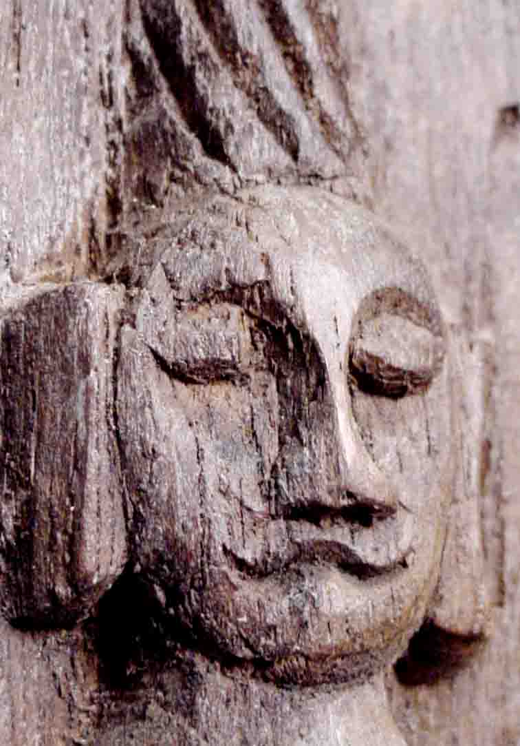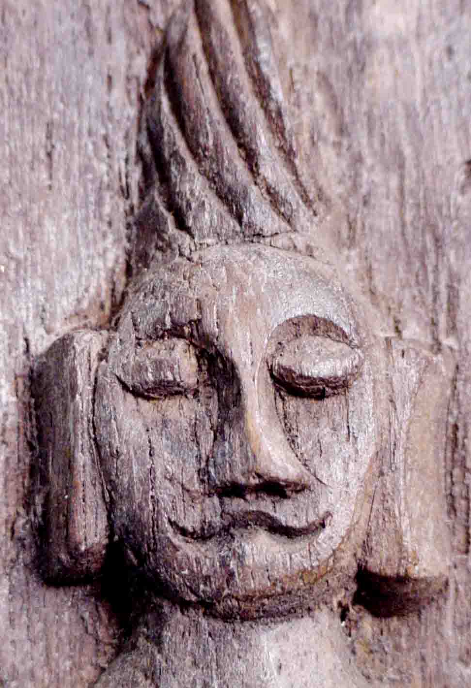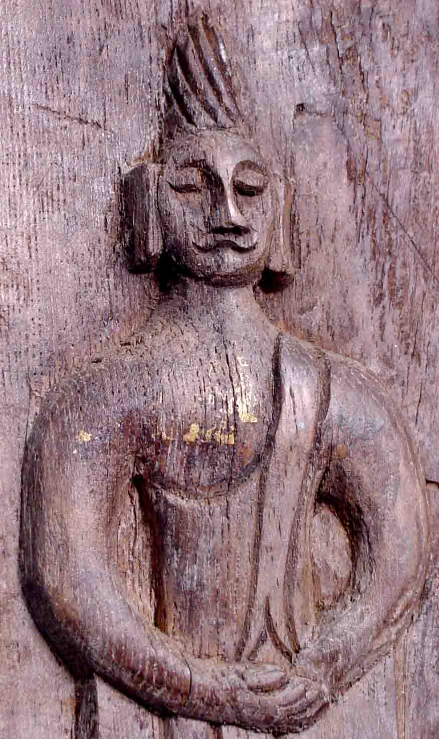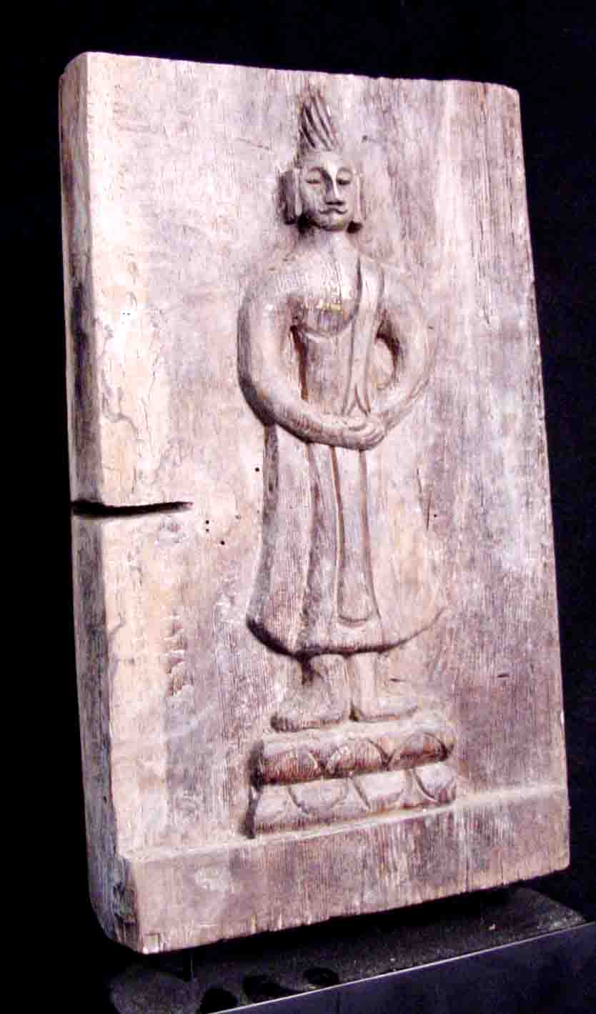 Wonderful antique Laos Buddha carved into thick teak mounted to a modern base. My guess is early 20th century. Extremely expressive and unusual. He is a good size at 13.5 inches tall (16 inches tall on the modern base) by 8 inches wide by 2.25 inches deep at the thickest.