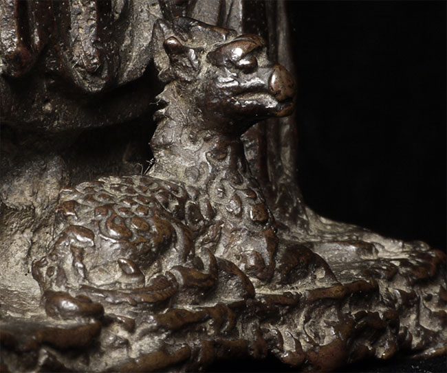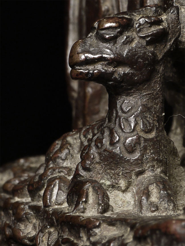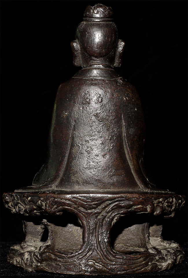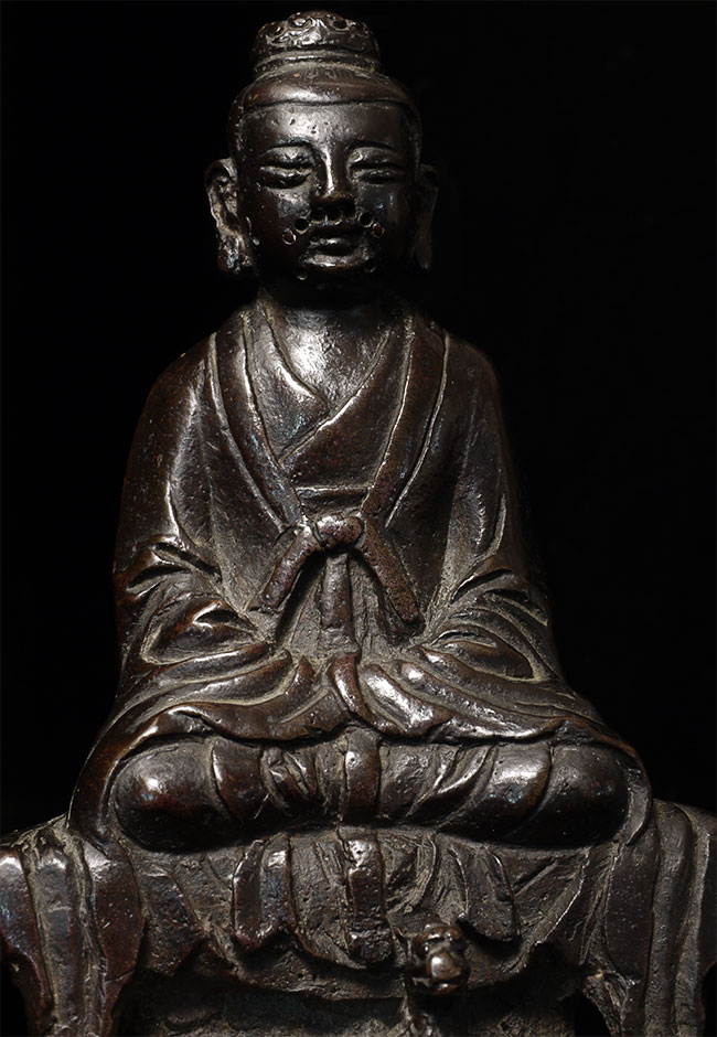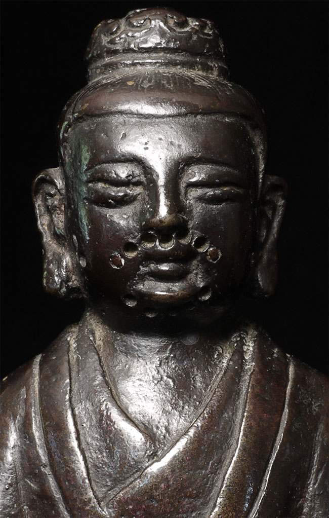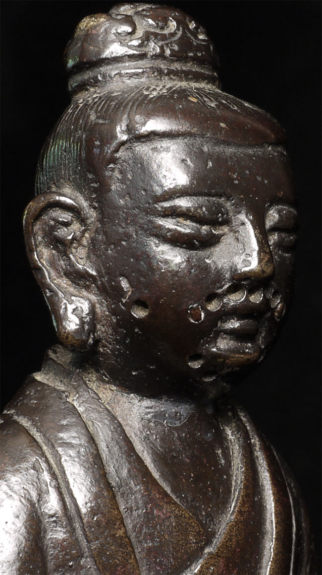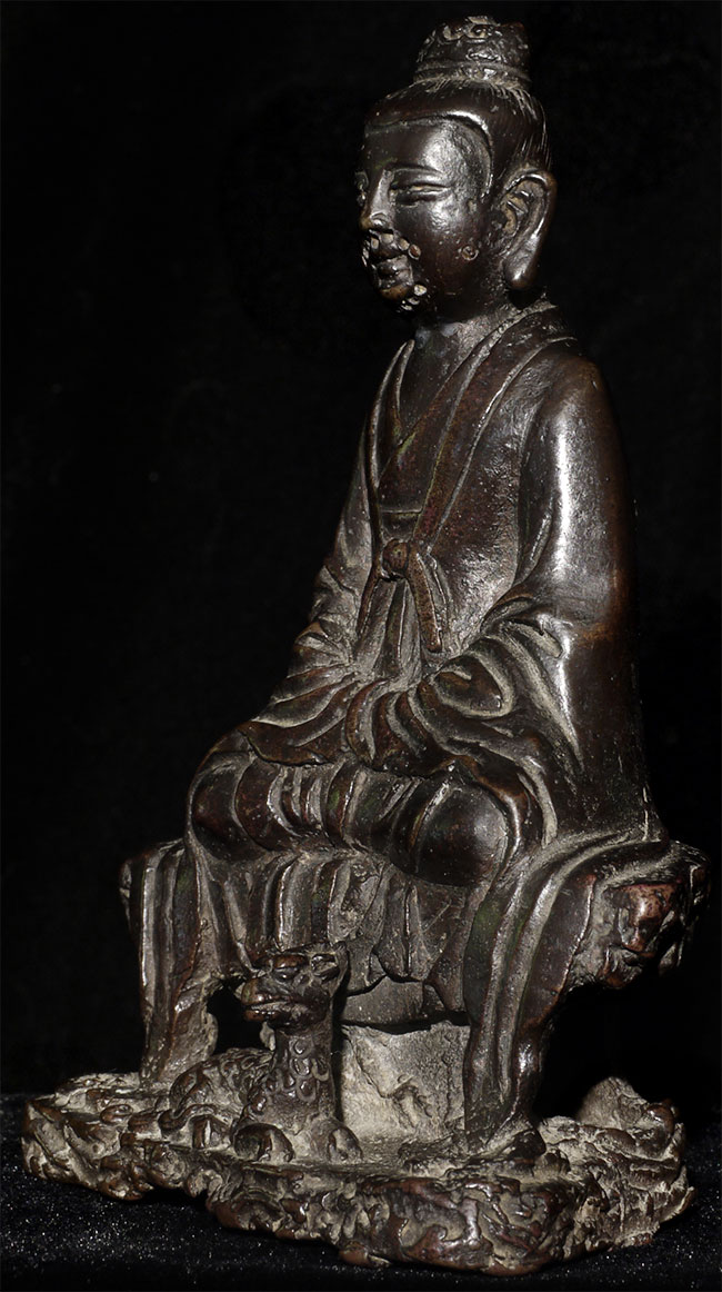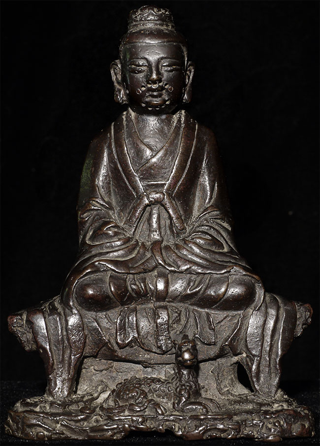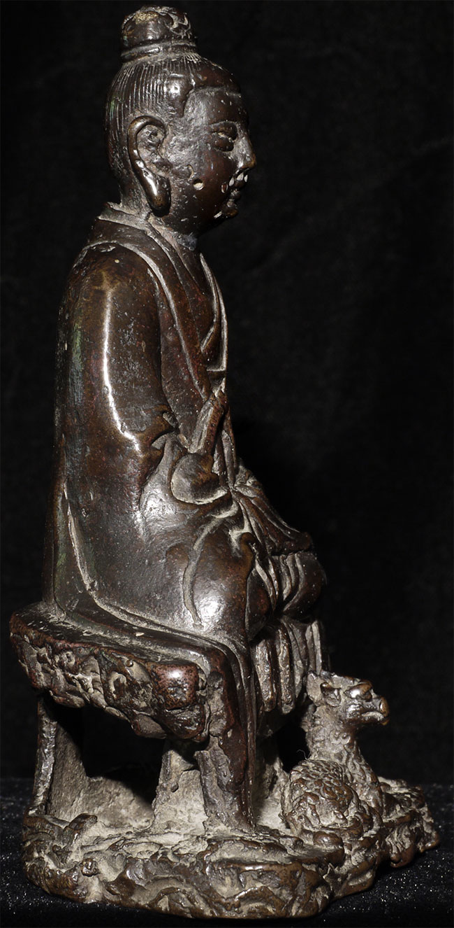Lovely Ming synasty Buddhist figure with very sweet little mythical beast at his feet. The purpose of the holes on the face is to put human hair to create a beard. Sits happily at 4.75" tall. A really good piece.