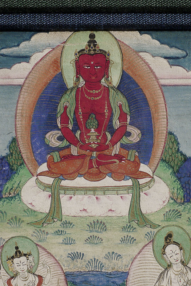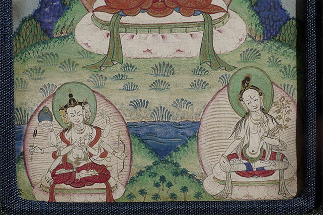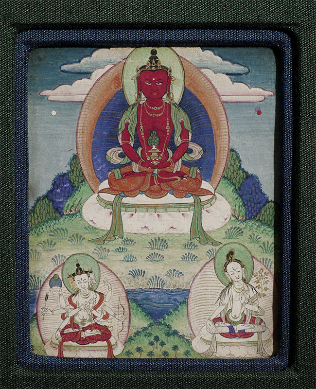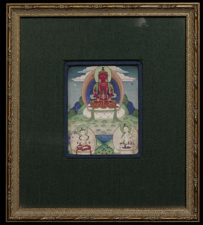 Beautiful Mongolian Antique Thangka. Exquisitely framed with double silk-hand-wrapped mats. Measures 4.5" x 3.5". Frame measures 10.75" x 9.5"