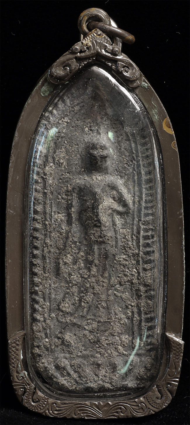 Antique Thai or Cambodian lead/bronze Amulet in a modern silver and lucite case. The date on the back refers to the Buddhist calendar. The previous owner believed it is 13/14thC. It may be later, but does appear to be an authentic old one. From a large estate collection purchased in the late 1990's. Amulet is 3" tall