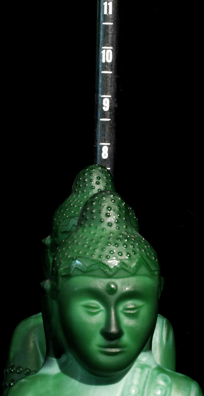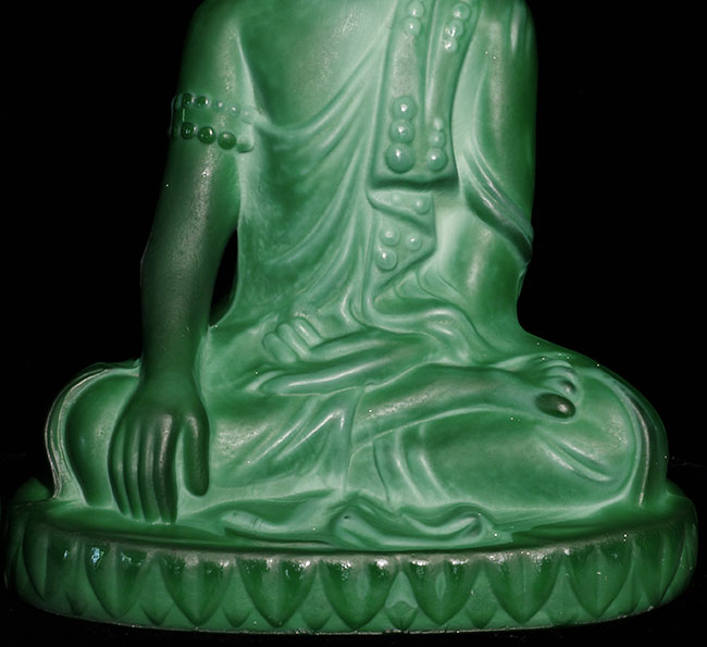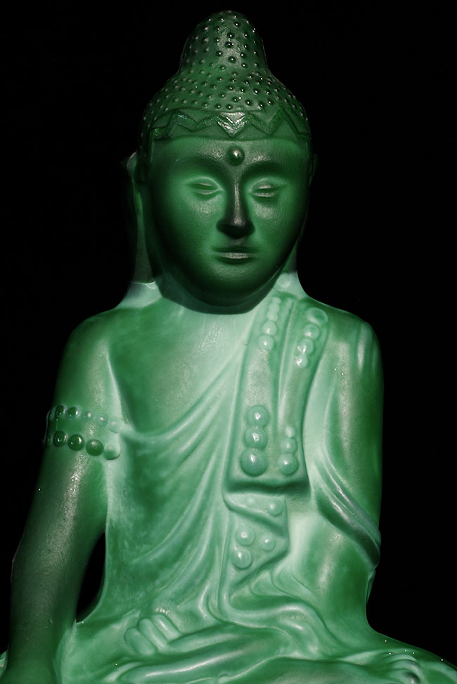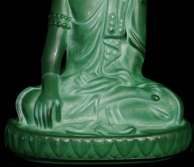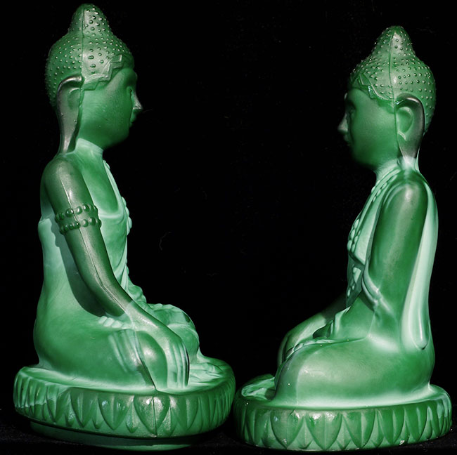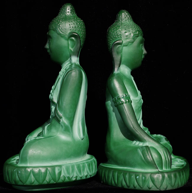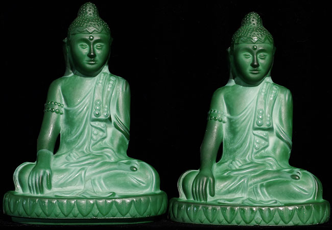 Circa 1930's Green Czech Glass Buddhas (pair). 7 7/8" tall