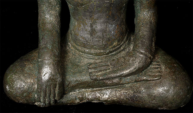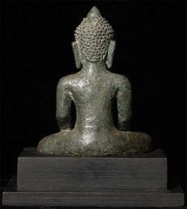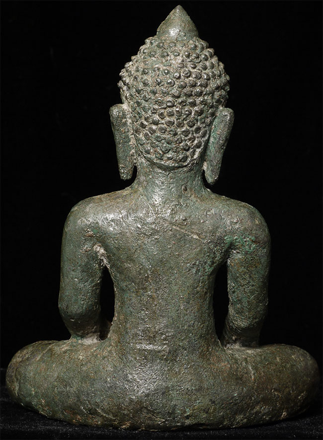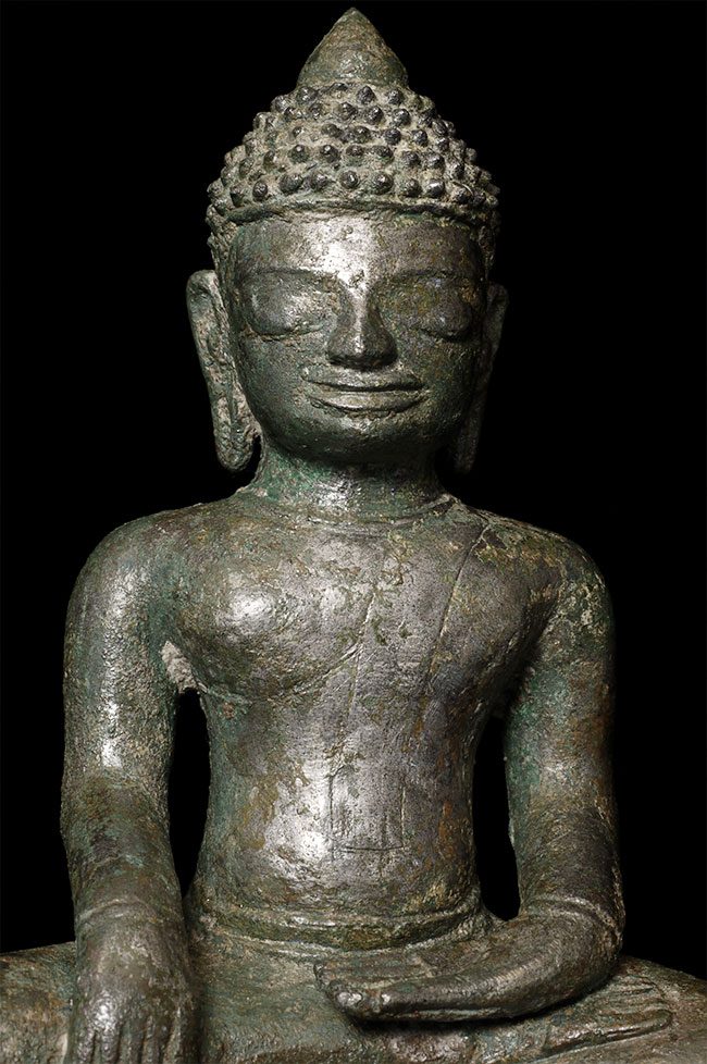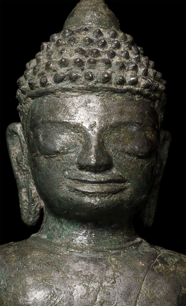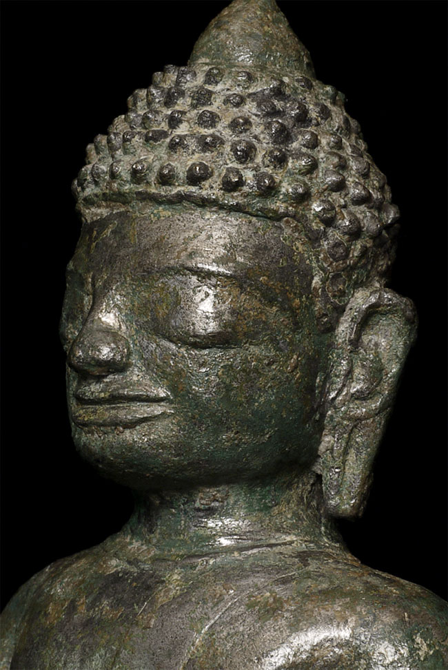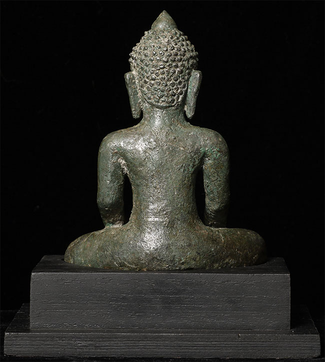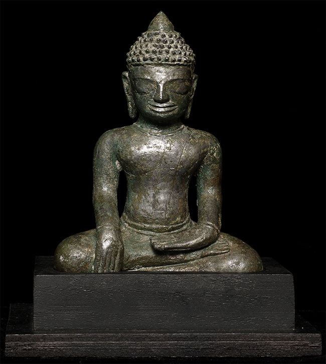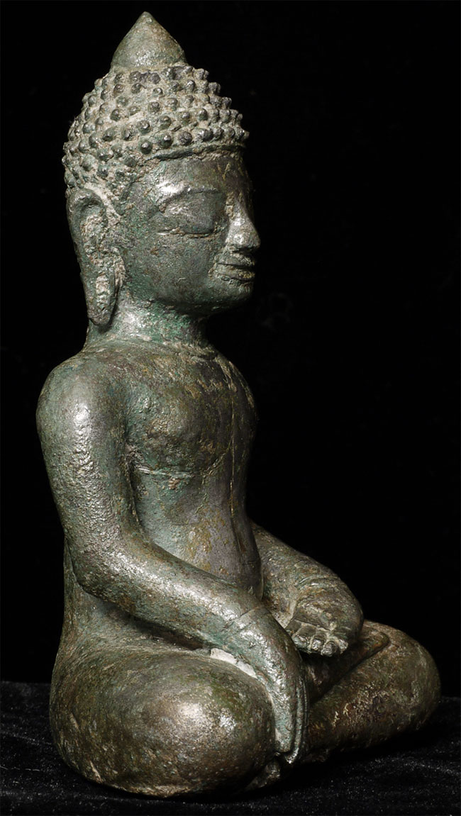 High silver content 13thC Thai or Cambodian Bronze Buddha in deep meditation. Especially serene overall feel. Figure is 4.5" tall. Sits into a custom, non-attached wooden base that is 1.25" high. Rare type. Very special.