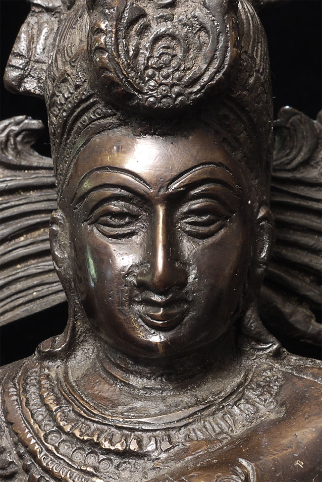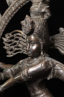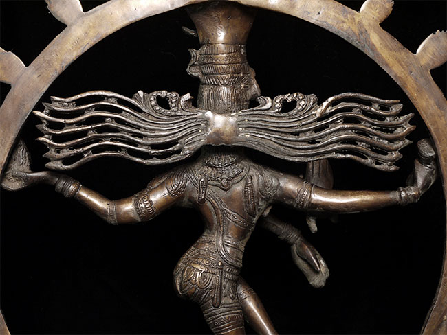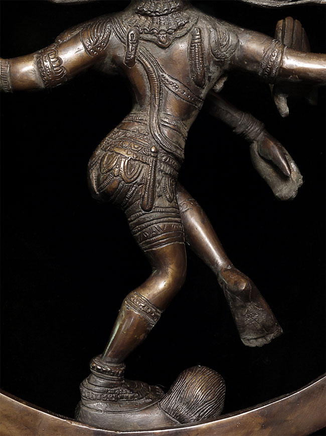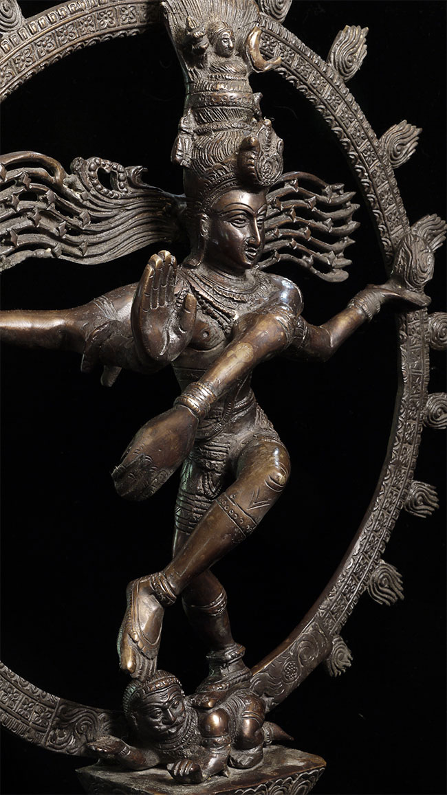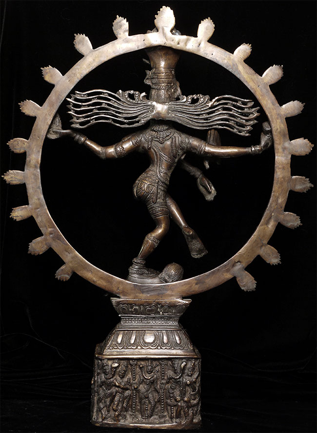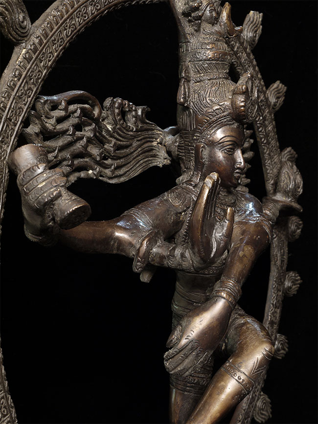 Large and powerful vintage Shiva Nataraj, dancing the cosmic dance of the circle of creation and distruction. As with the best of this type, his face embodies equanimity and concentration. Stands an impressive 22" tall, 16.5" at widest point, 4" deep. Heavy