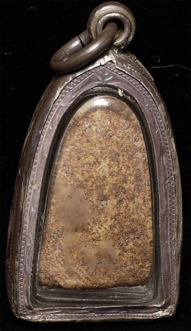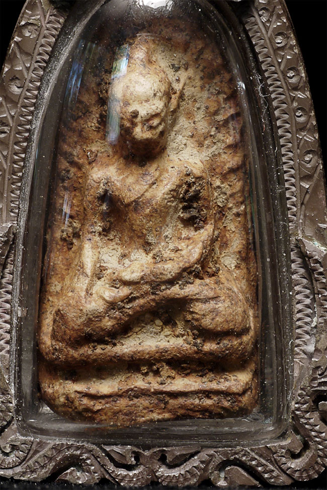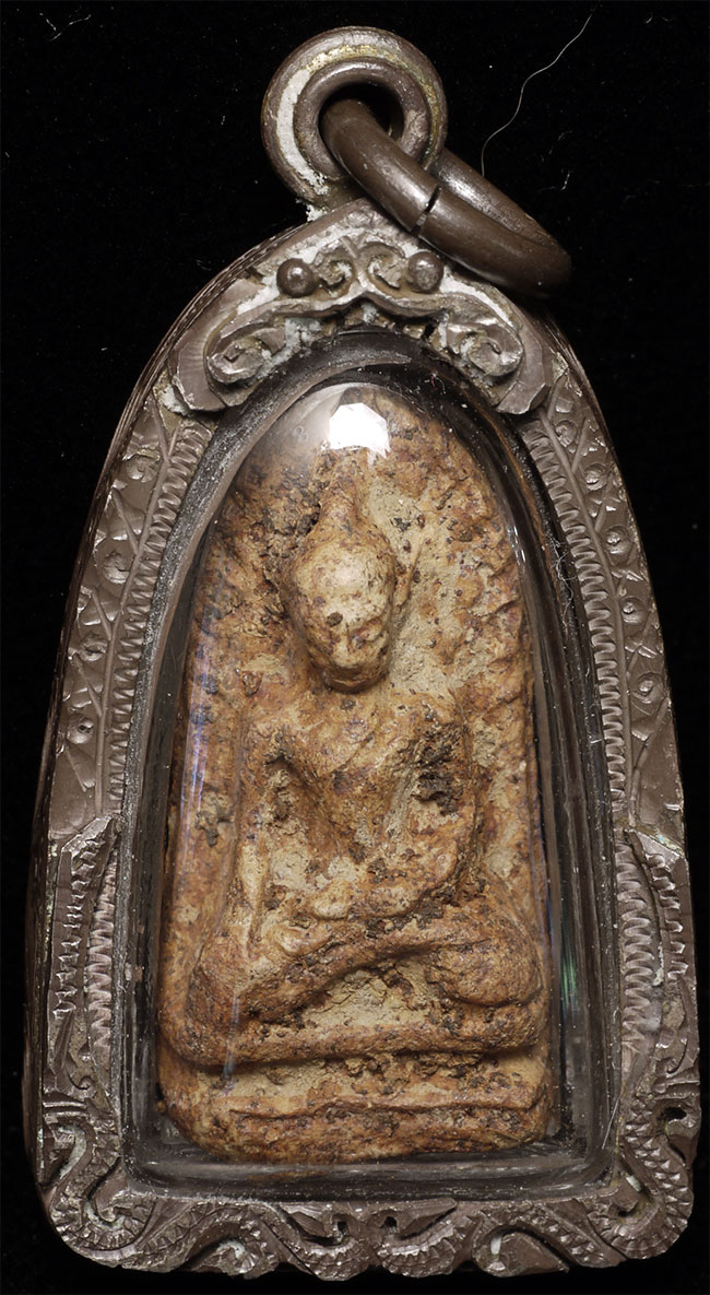 Antique Thai Clay Amulet in silver case. Sits 1.5" tall
