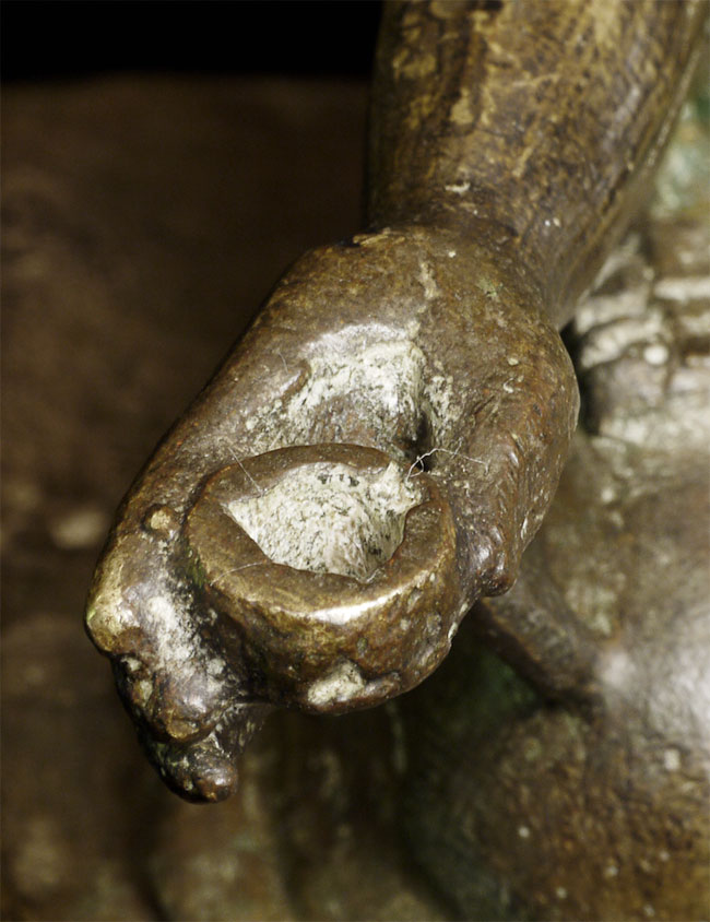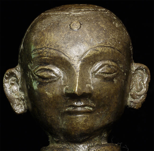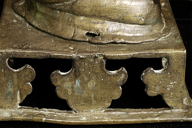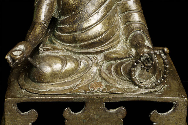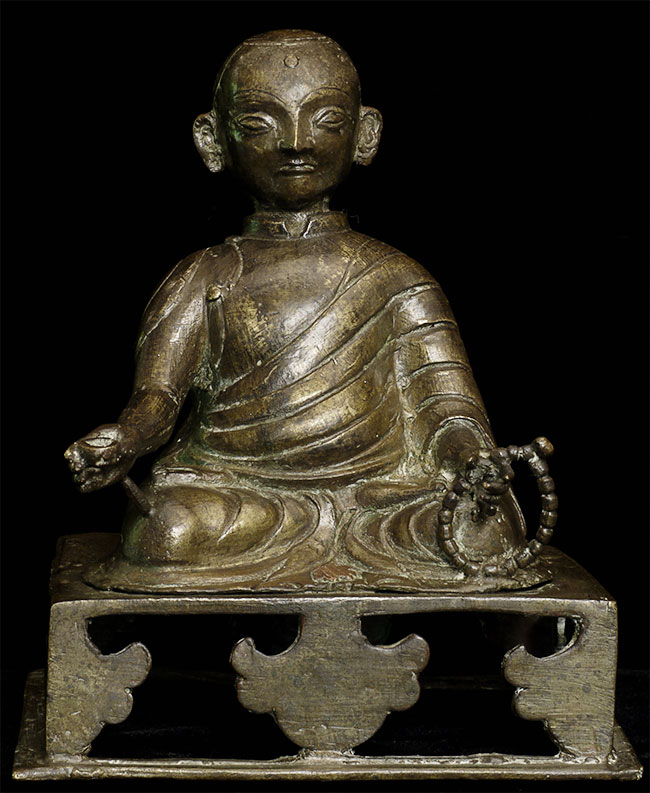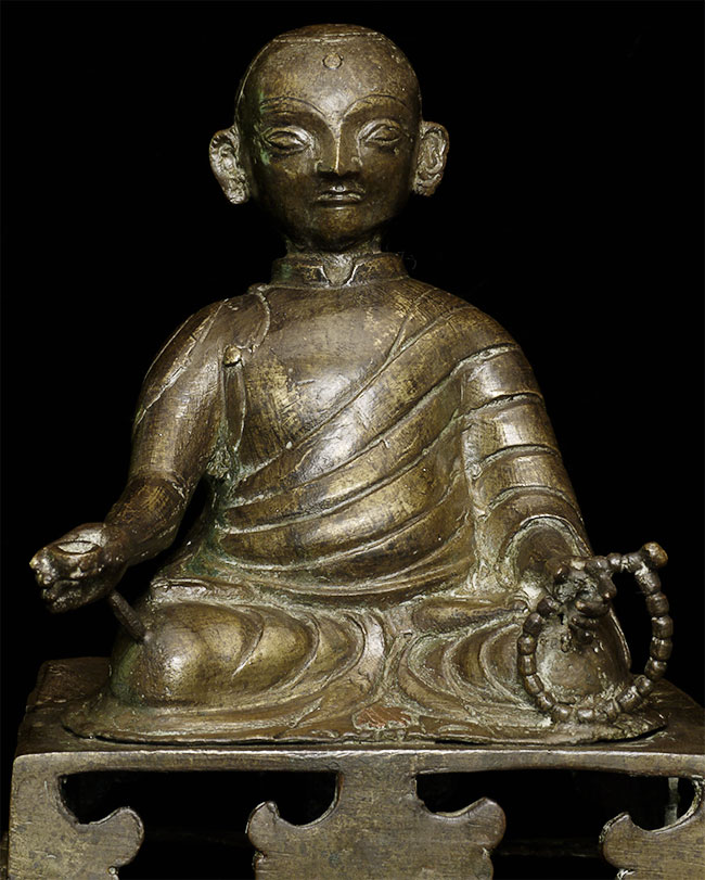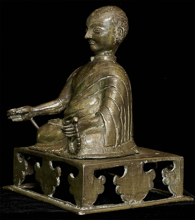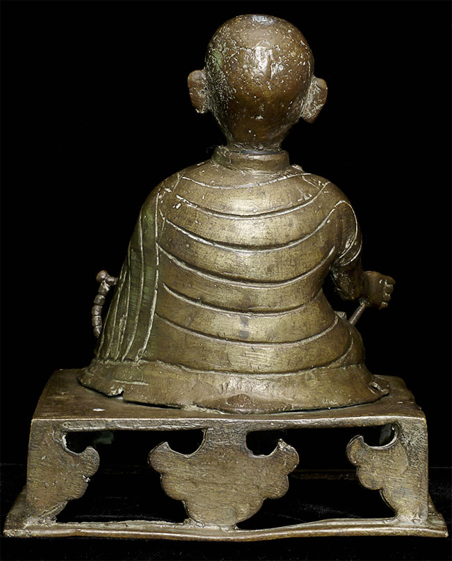 Very uncommon antique bronze Buddhist Monk. I believe it may be from Yunnan due to the face and distinctive base wich has stylized bats, though I've never seen another like this. Looks to be 18thC. Sits 6.5" tall. Note the very unsusal and beautiful underside.
