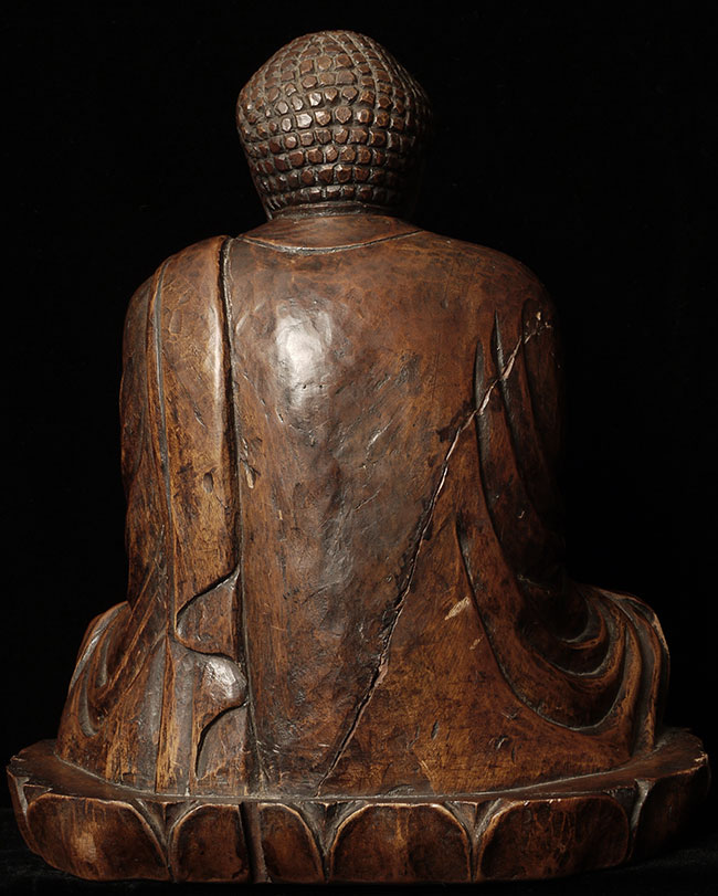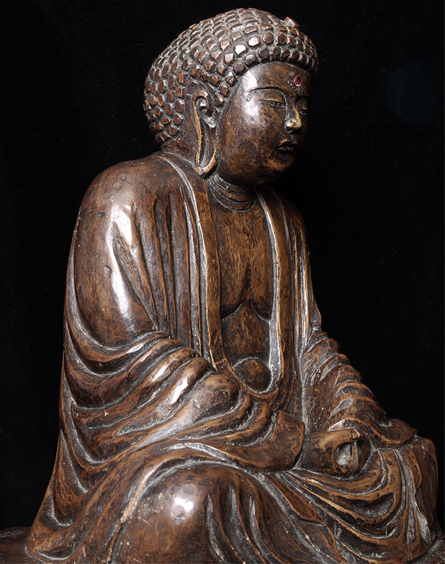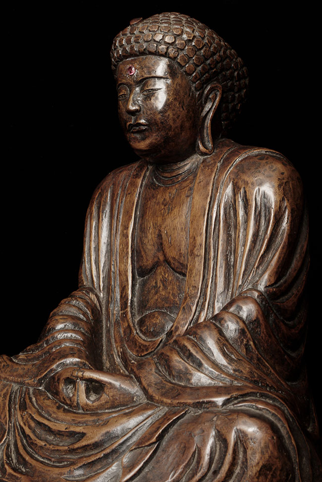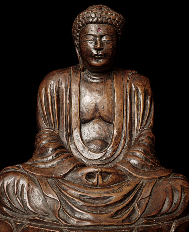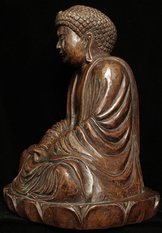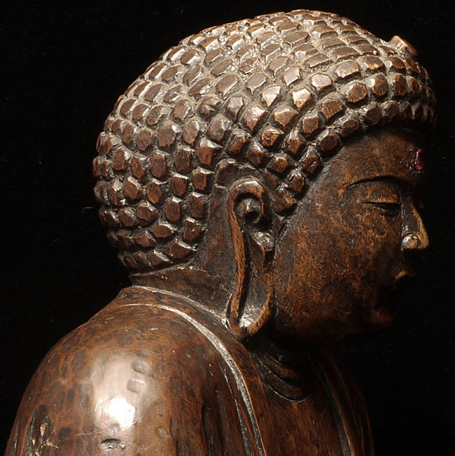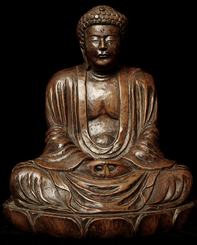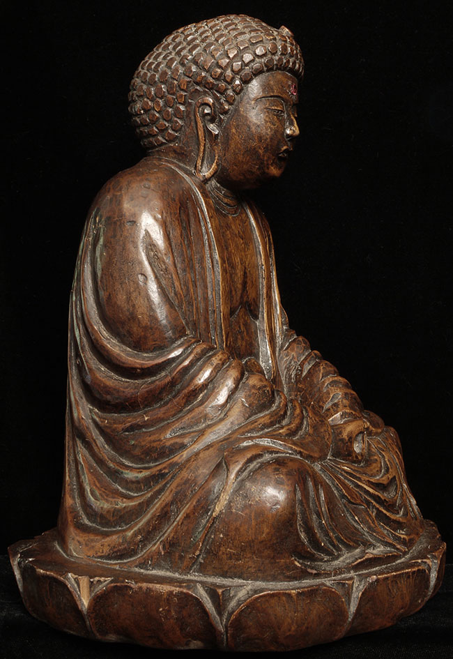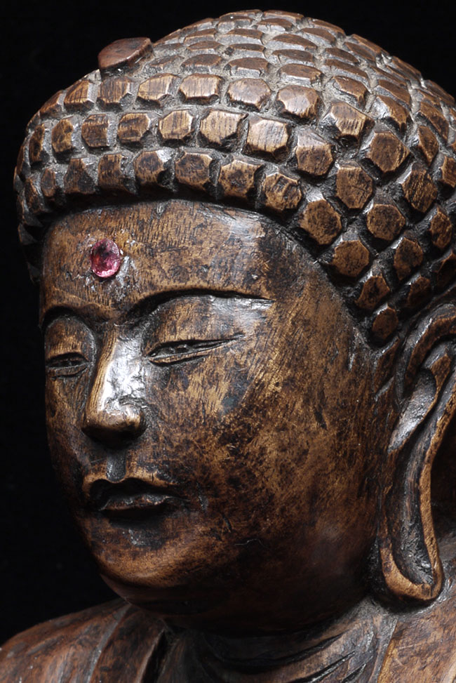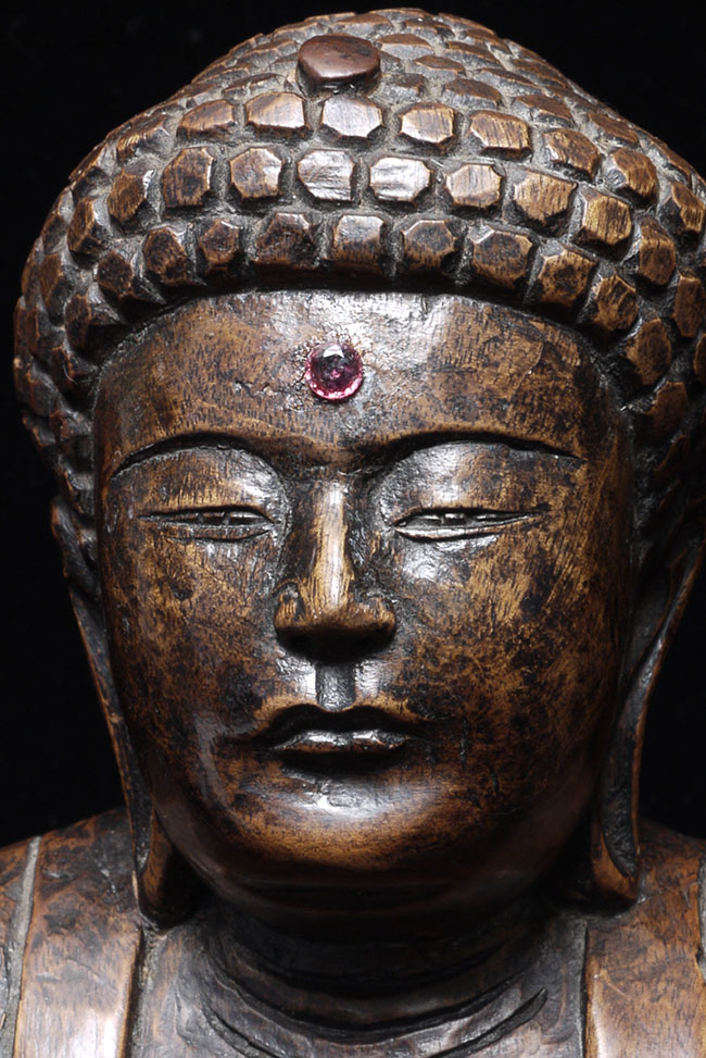 Powerful antique Japanese Buddha- probably from the Edo period. The face emanates deepconcentration and serenity. There is a modern semi-precious stone in the forhead. Base has been cut down some time in the recent past. . Sits at 10.5" tall.