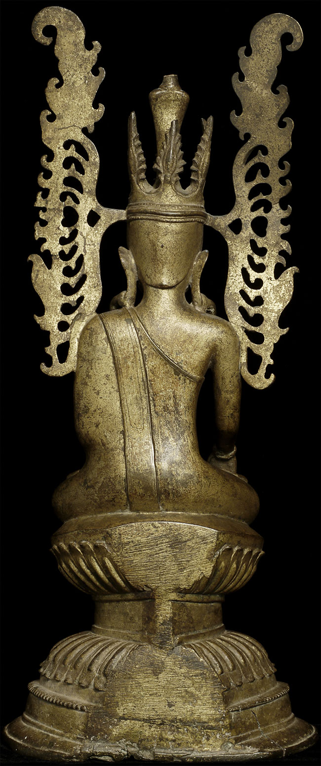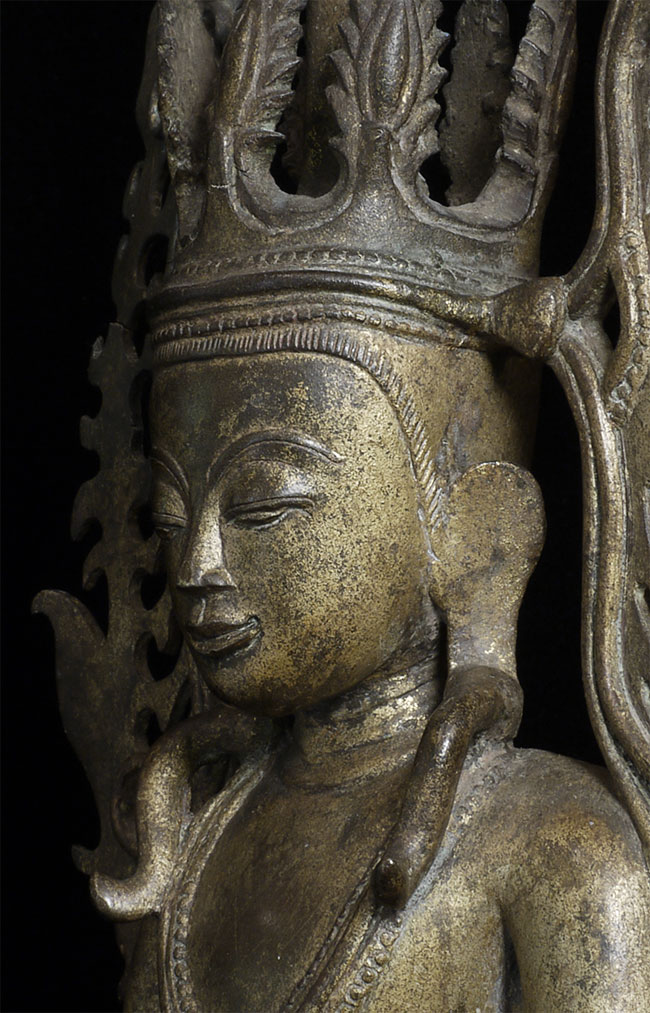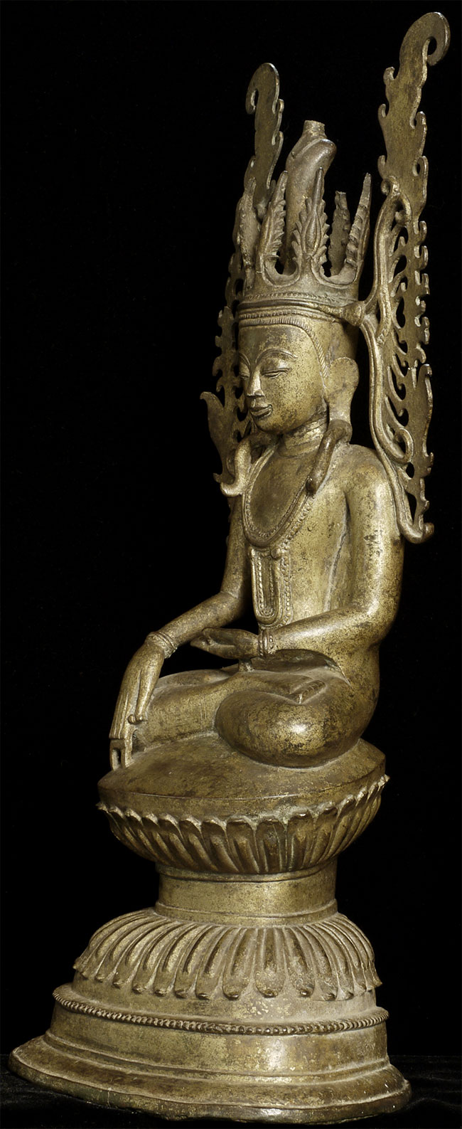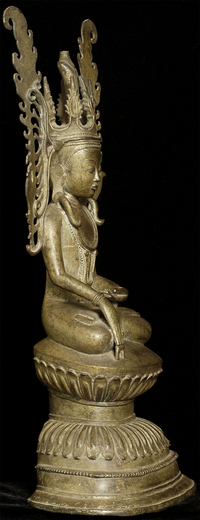 Burmese 18thC "Jambupati" style. Last year I purchased a fine collection of 65 Burmese bronzes from a Southern California collector who sold his entire collection in order to be able to pack up and retire to Mexico. This is one of the 2 best in the group. I need $3950 for it. Great condition with most of gilding. Loss of the point which would have stood straight up in the center. 16.5" tall