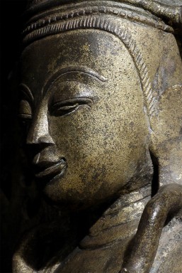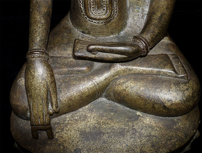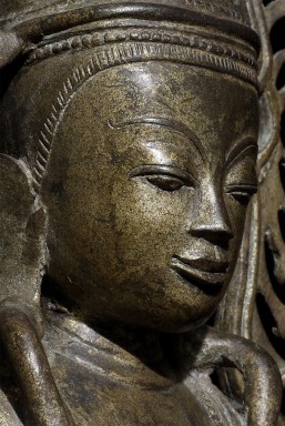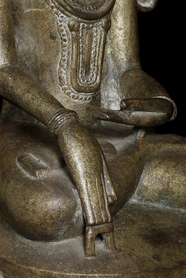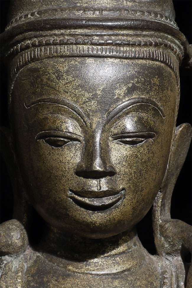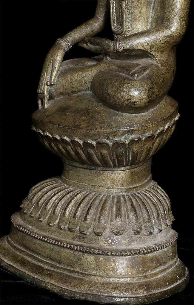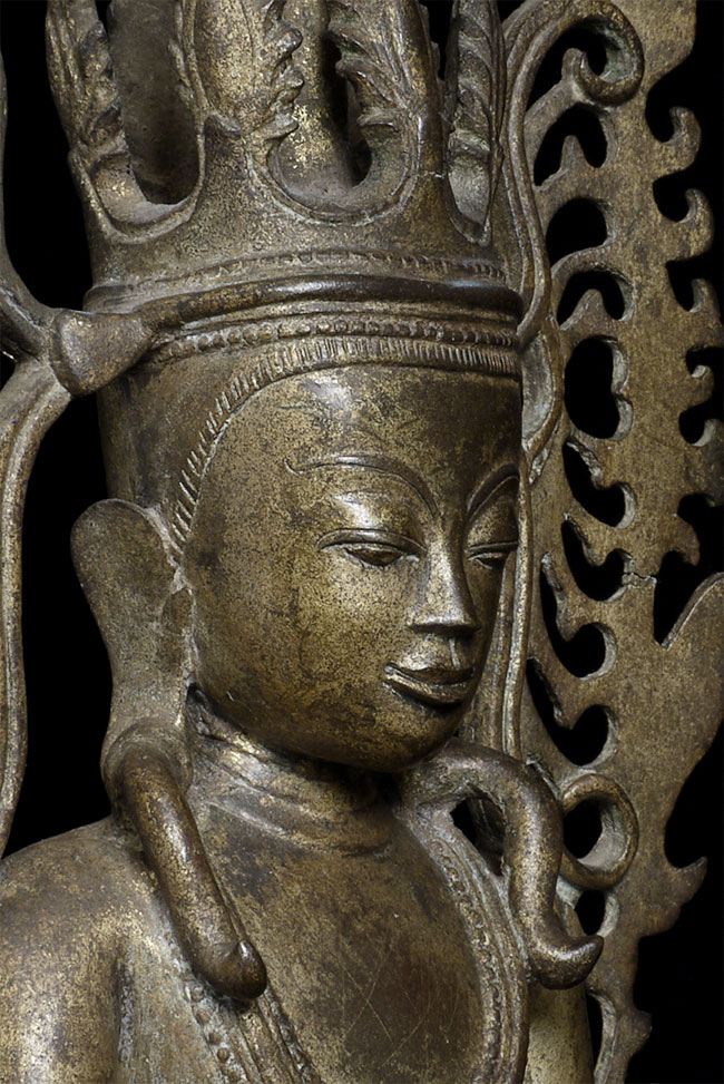 Burmese 18thC "Jambupati" style. Last year I purchased a fine collection of 65 Burmese bronzes from a Southern California collector who sold his entire collection in order to be able to pack up and retire to Mexico. This is one of the 2 best in the group. I need $3950 for it. Great condition with most of gilding. Loss of the point which would have stood straight up in the center. 16.5" tall