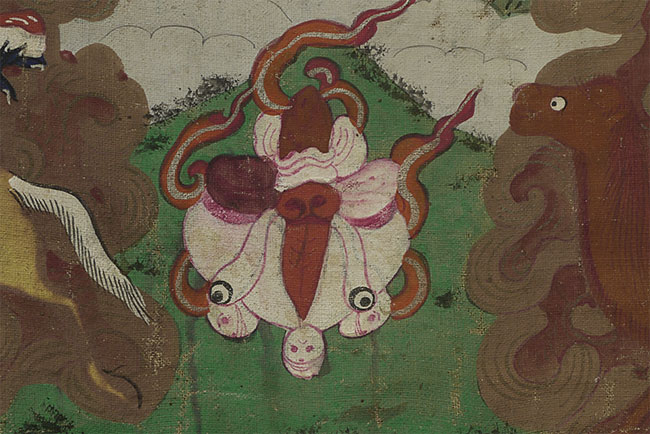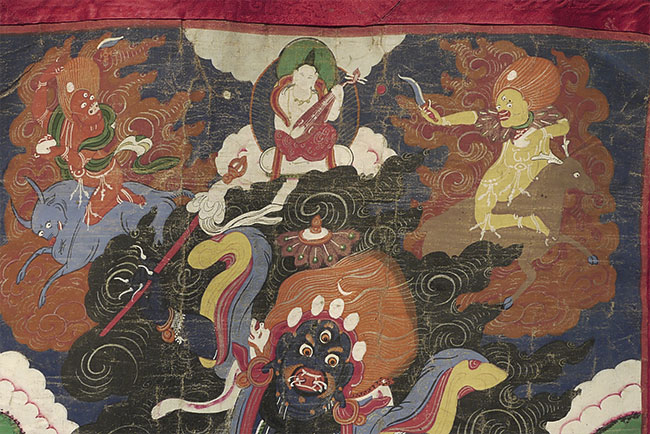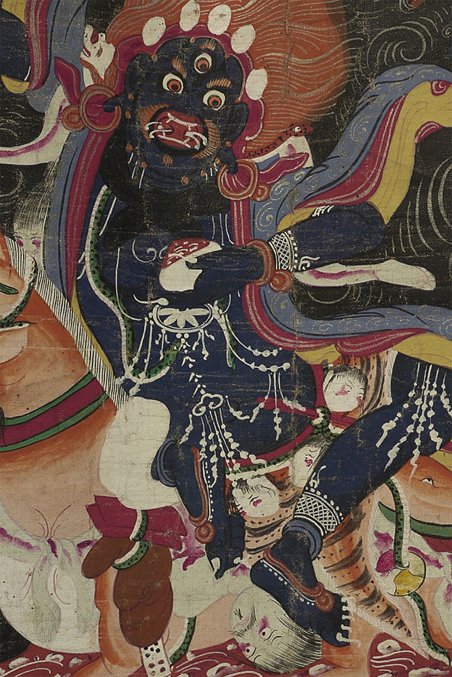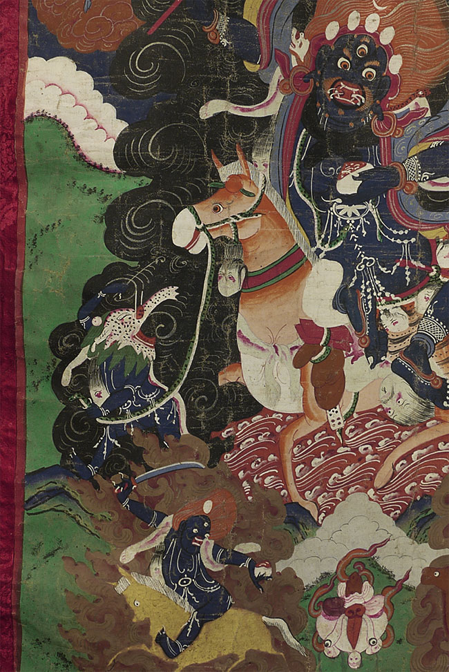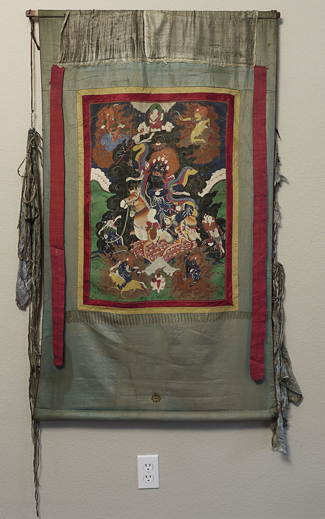 Powerful antique Mongolian or Tibetan Thangka. Still has it's original complete cloth frame, which is highly unusual. Excellent condition- shows signs of ritual use, but colors are still vibrant. Purchased in the late 1990's from a Mongolian man who was raising money to send his daughter to school in the USA. Thangka is 28.5" x 49.5", inner painting is 23" x 16.5"