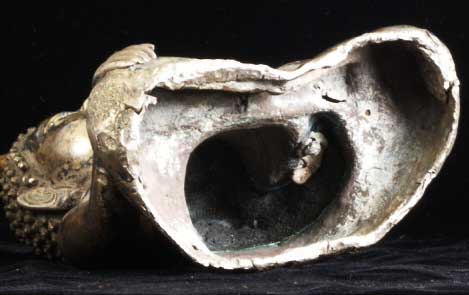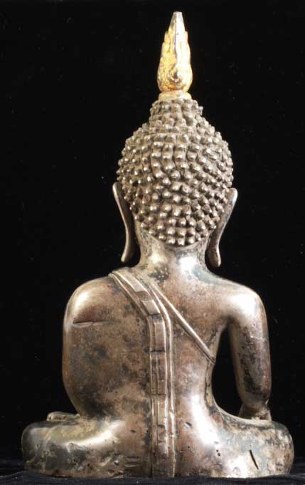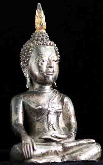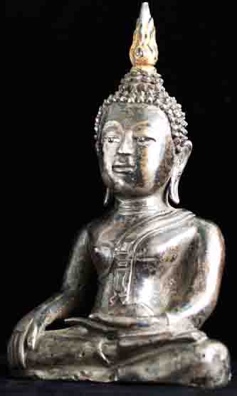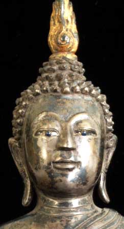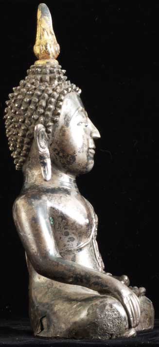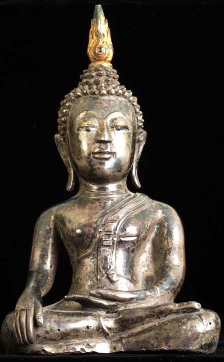 This is a thickly cast all silver Thai Buddha (18/19th century) with semi-precious stone eyes. It is an especially beautiful Buddha and is unusual in this good size. Originally he probably had an elaborate base which was also made of silver which was probably long ago cut away and melted down (sadly this was not uncommon). He sits 8 inches tall, and would have been well over 12 inches with his base. He is quite heavy at over 50 ounces; some of that is clay core, but most of it is silver. Original inset stone eyes. An outstand and strikingly powerful Buddha