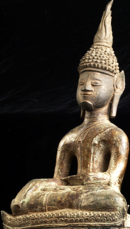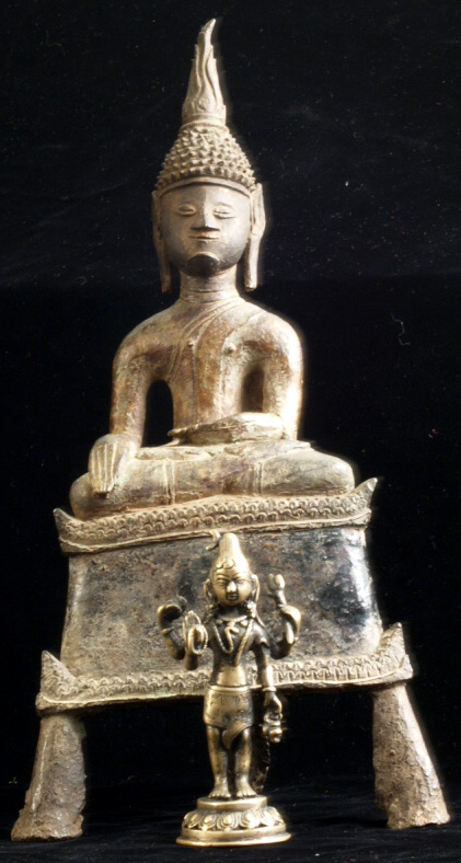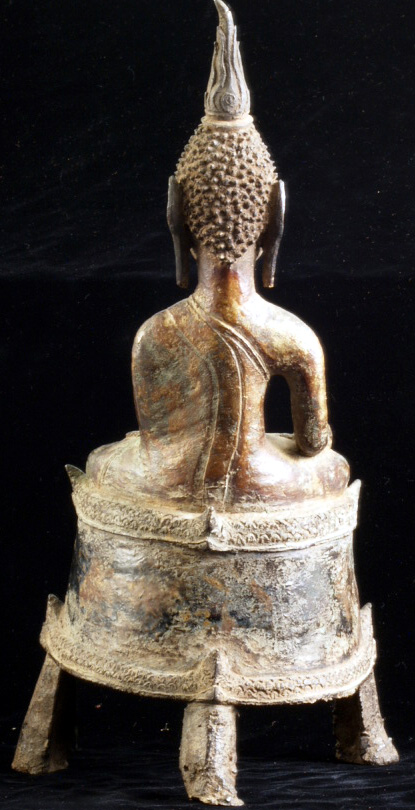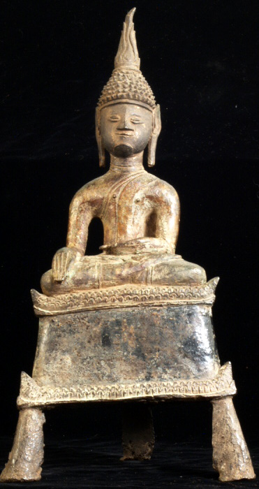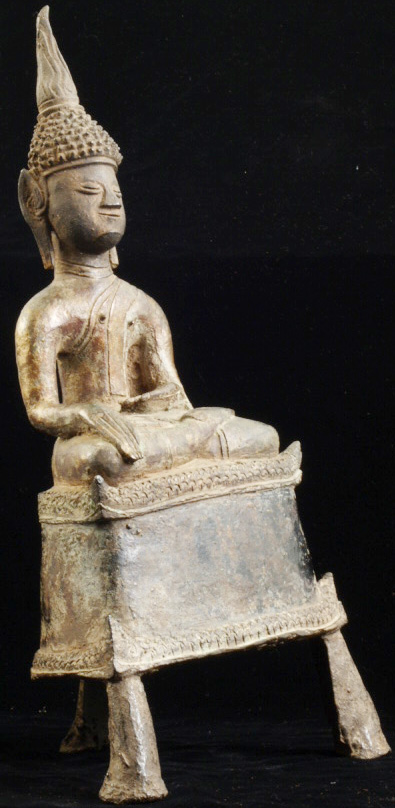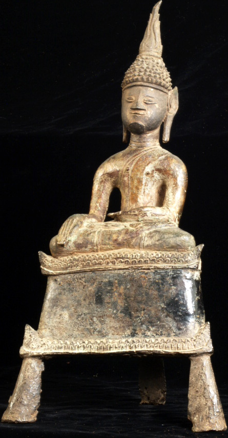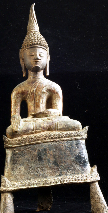 This Buddha is a very sweet and large 3 legged Laos Buddha which is in the 15-16th century range. He is a quite joyous fellow with a superb face (note the unique chin!). He has a superb patina. He sits 14.5 inches tall. I've put an Indian 5.25 inch bronze is in one photo for perspective. He is quite thickly cast. He has a slight ding to the tip of the finial: he is otherwise in outstanding condition. An overall fabulous piece of folk art in the very best sense of the tradition. This size and quality is becoming extremely rare, and the prices are going up rapidly in value.