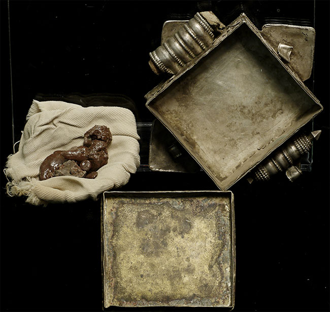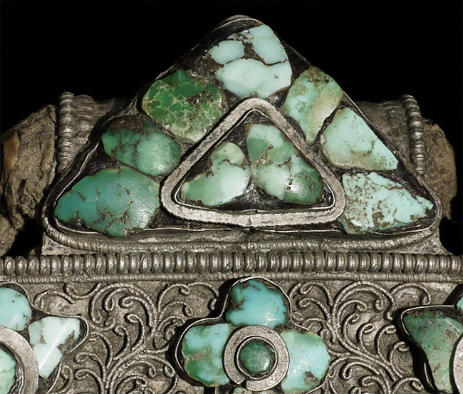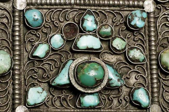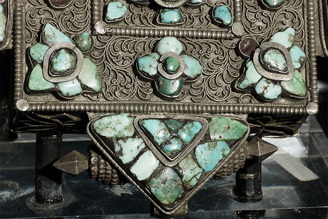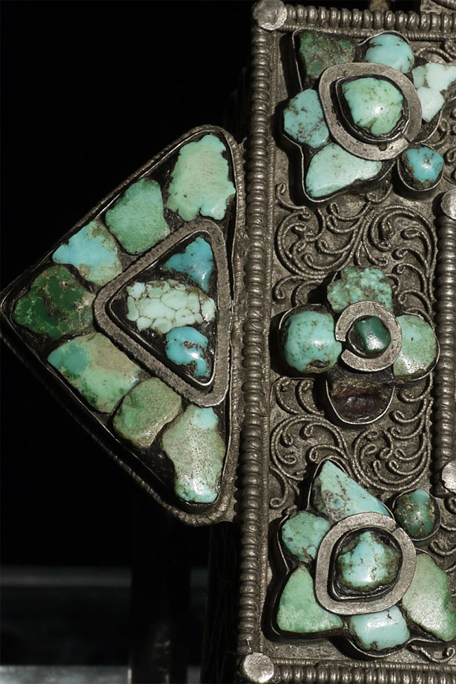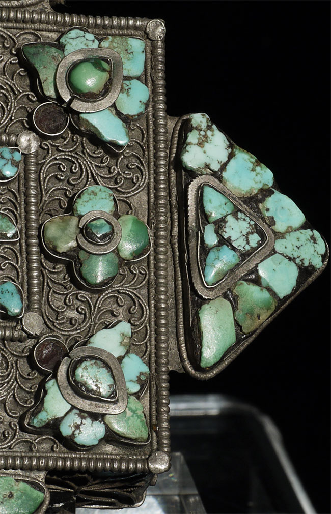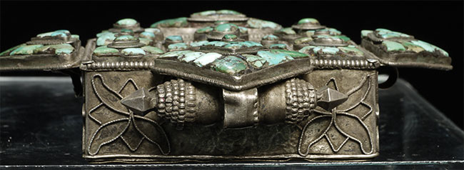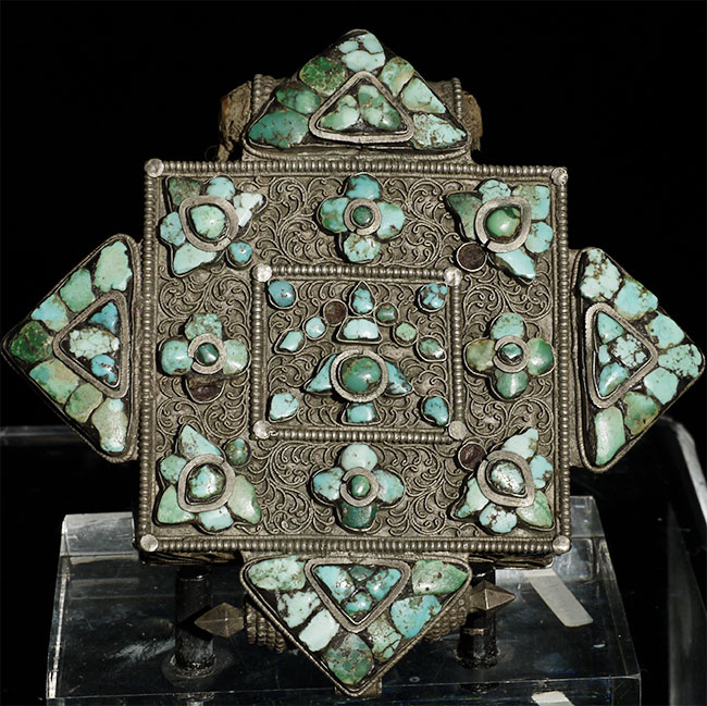 Beautiful antique Tibetan silver Gau Box with original contents. Also has what appears to be an original scroll in the tube on the top. One of the points has been bent and unbent, so it is not as strong as the other 3 points. A few losses to the turquoise, but overall OK condition for its type and age. Outer measurements of this box are 4.25" square. Shown on optional lucite stand.