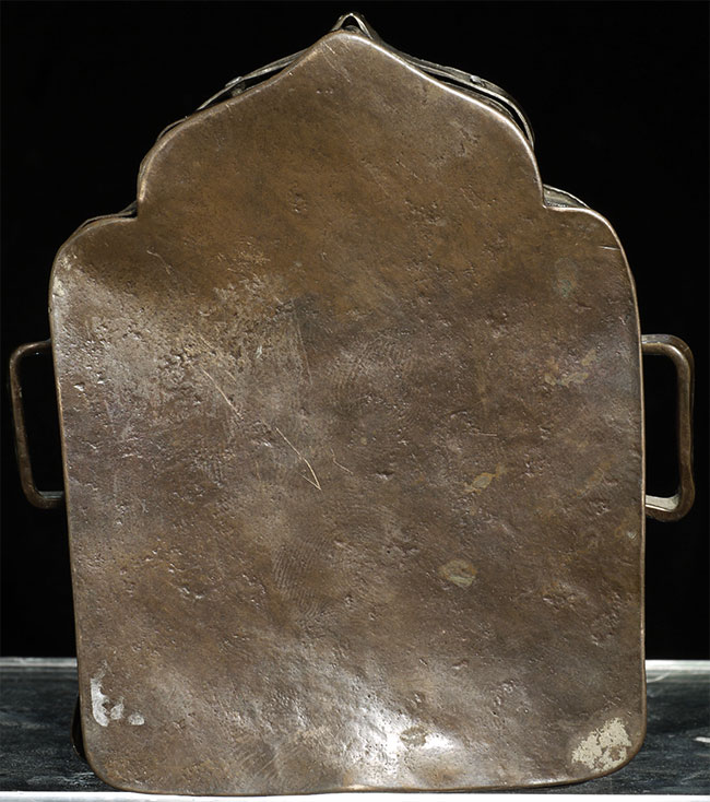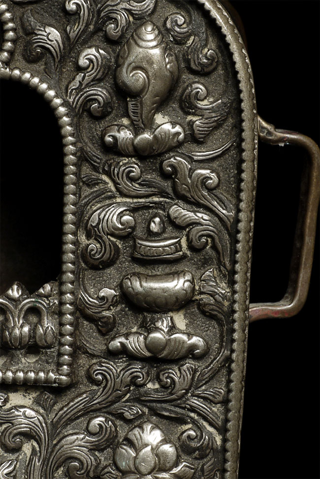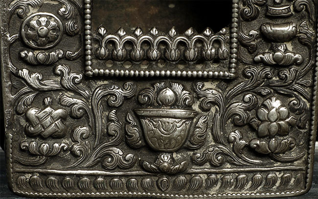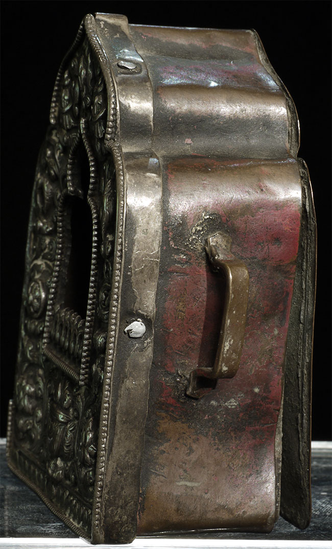 Lovely authentic antique silver and copper Tibetan gau box. is 3 7/8" tall, 3.75" at widest point, and 1.5" deep.