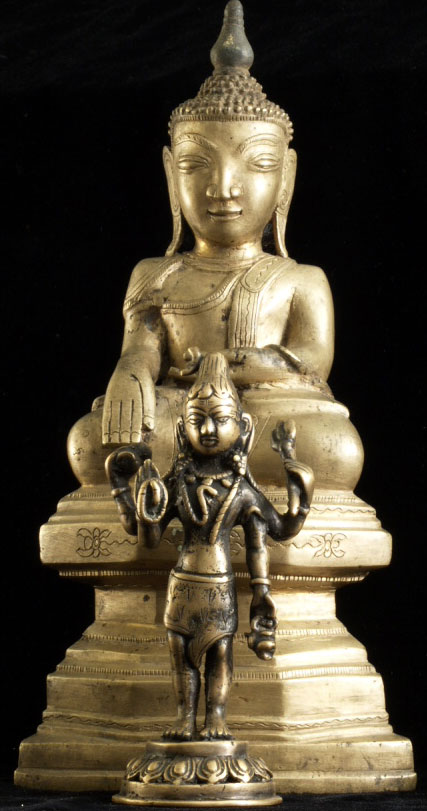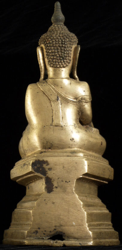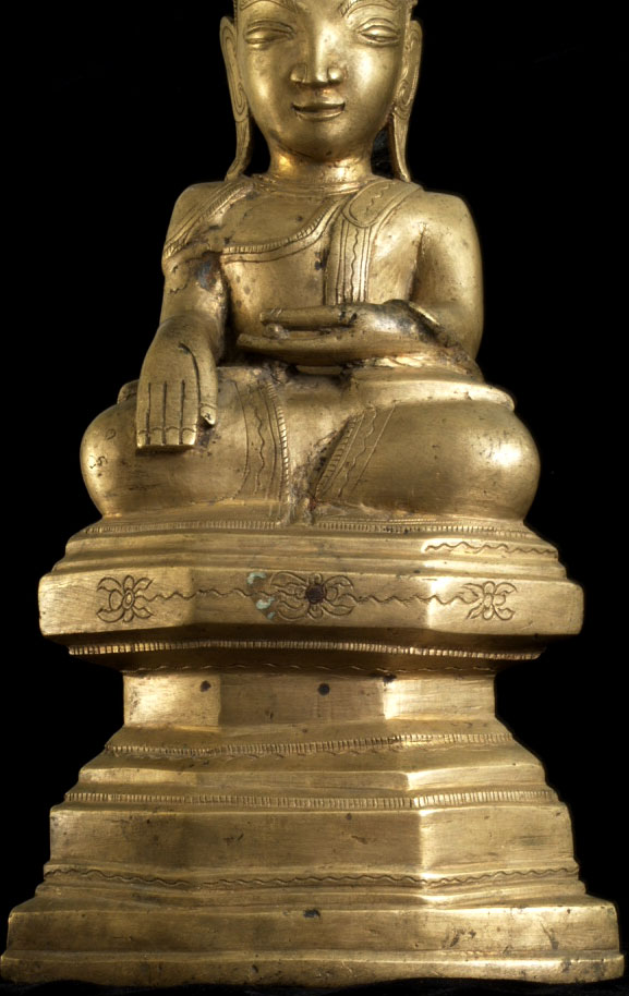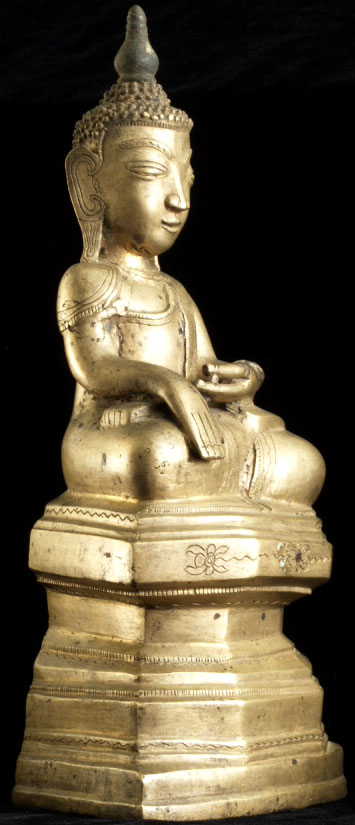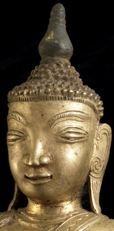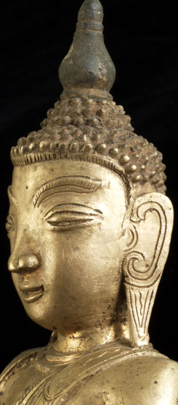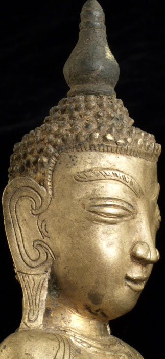 This is an uncommon Burmese Buddha with a very distinctive look. I believe it is what is referred to as "Tai Yai". It is related to Shan style, but the face and the styling is quite different. He has more depth than most Shan style Buddhas, and he also has more ornamentation (note the design on the base and on his robes. I believe he is late 18th or early 19th century. He is a good size at a full 10 inches tall. I've had very few like this over the years.