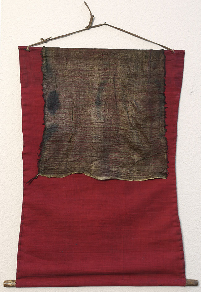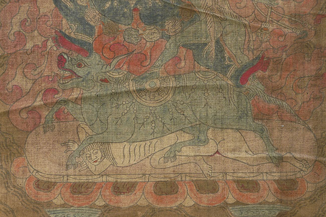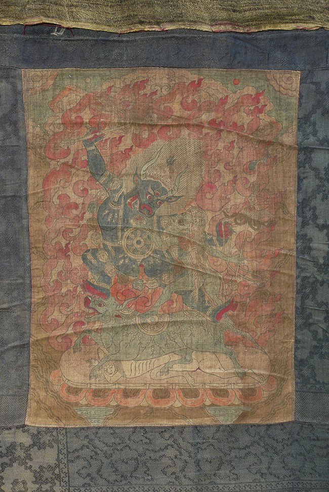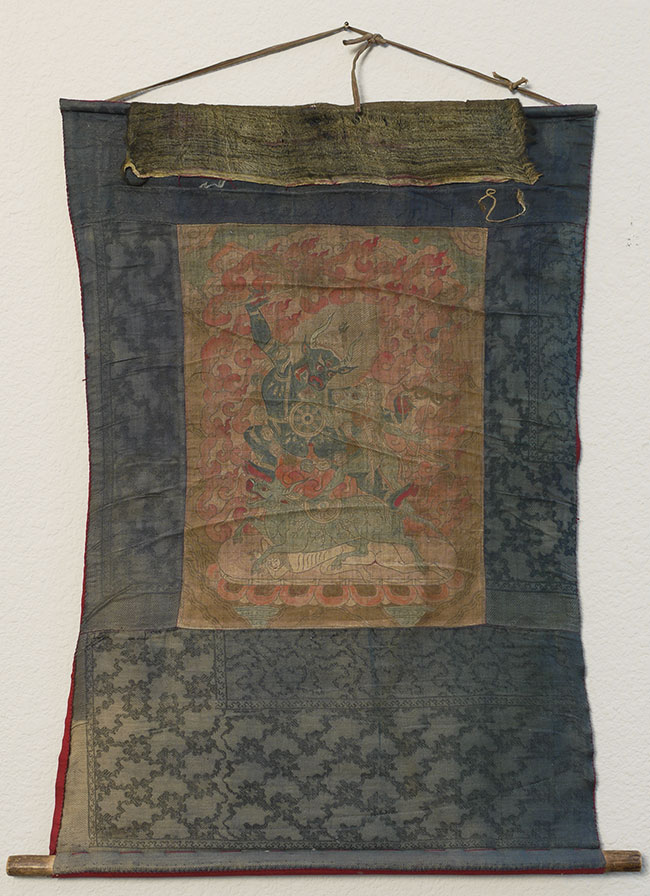 This vibrant antique Mongolian or Tibetan Thangka depicts a powerful protective deity surrounded by swirling flames, rendered with exceptional skill and expressive detail. Whether finely hand-colored from a woodblock or drawn directly onto the fabric, the artistry reflects a high level of craftsmanship rarely seen in pieces of this age. The central image measures 12" H x 9.25" W, while the full textile extends to 17" H x 11.5" W. Despite expected creasing and gentle fading from age, the composition remains dramatic and visually striking. A superb and highly collectible example of early Himalayan devotional art.