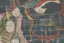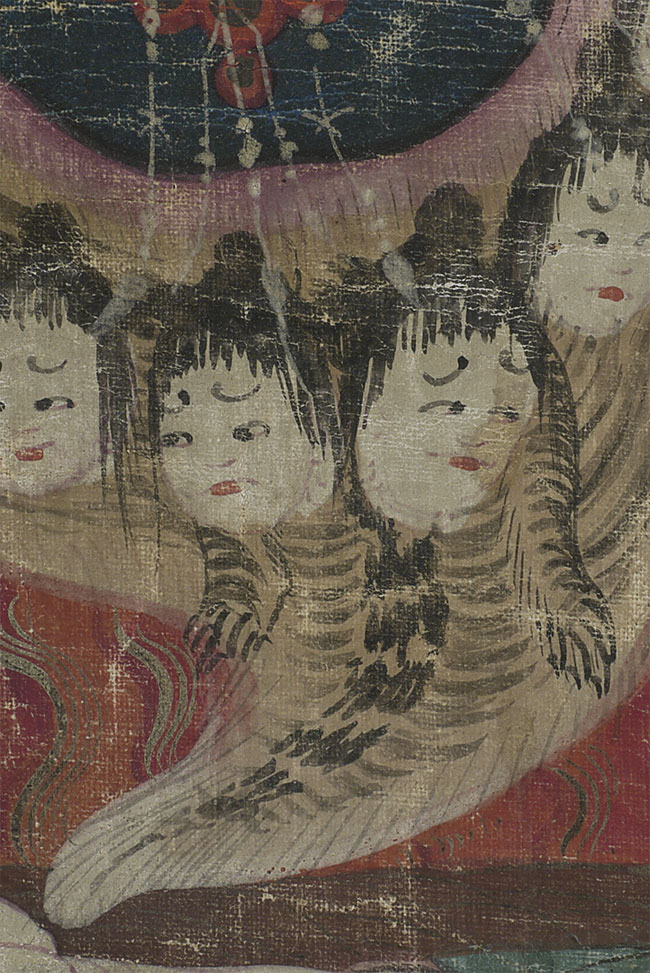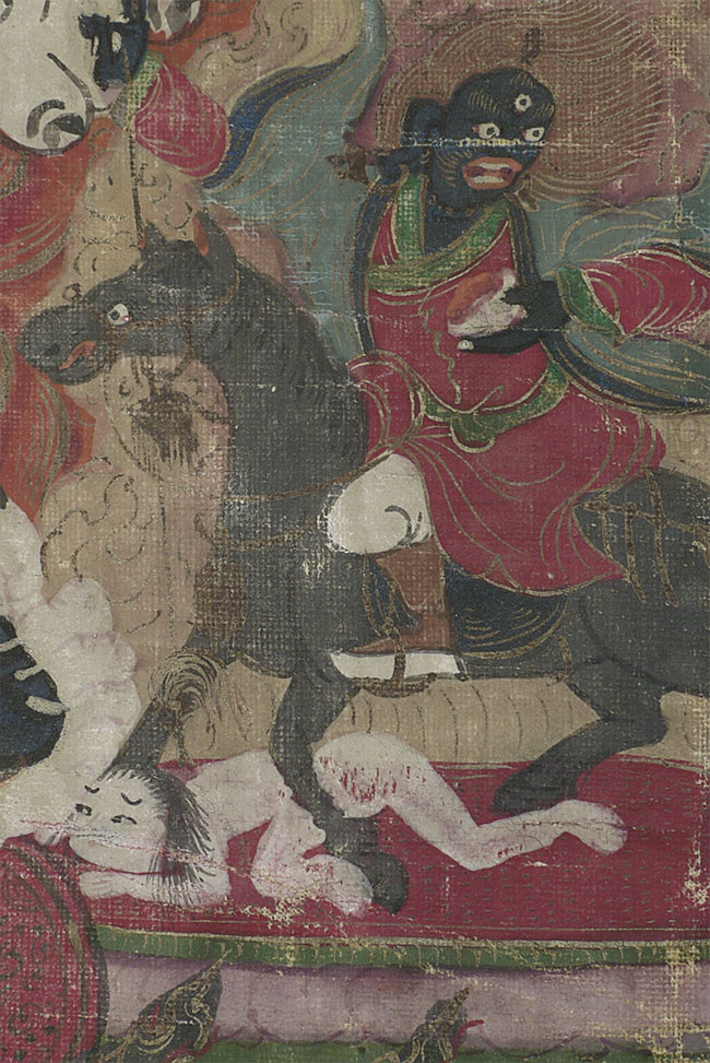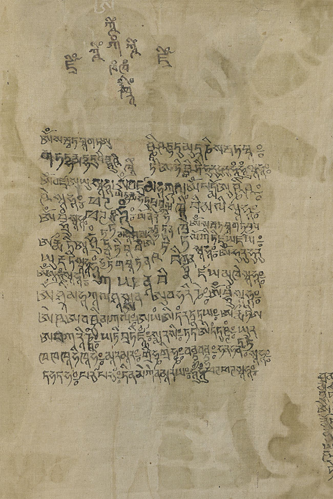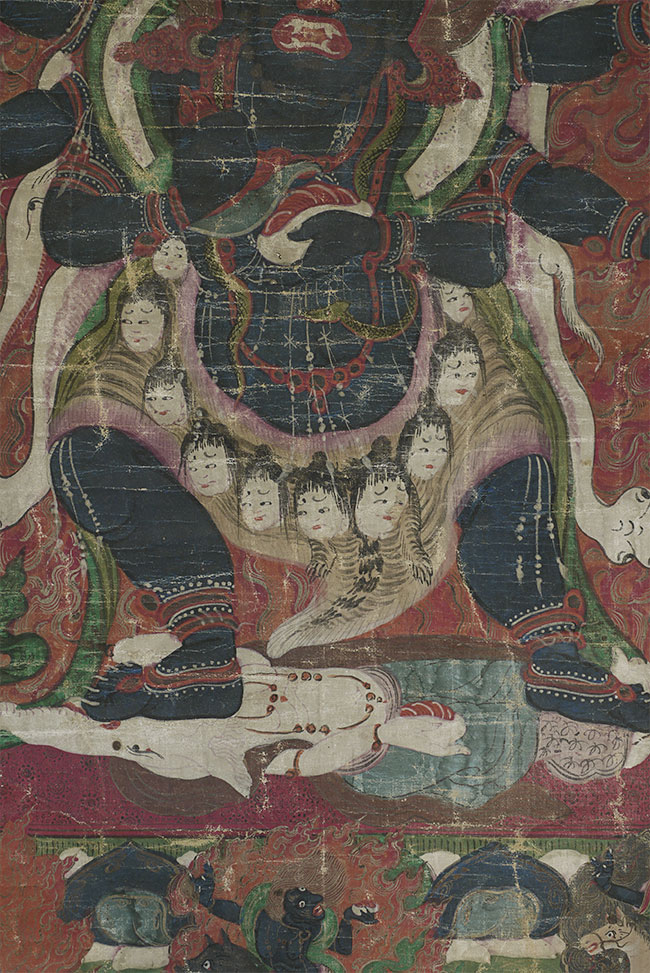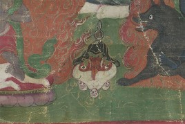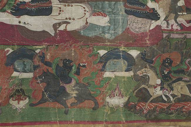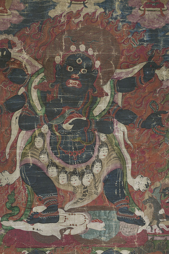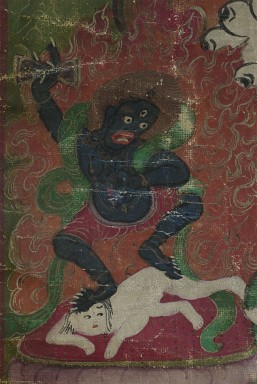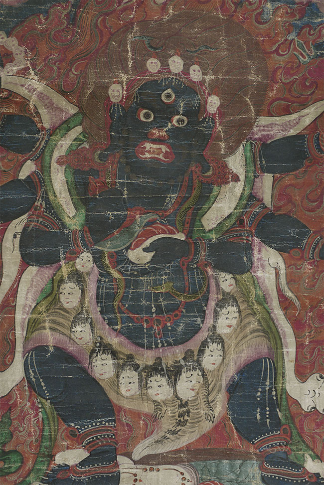Well painted 19thC Mongolian or Tibetan Thangka with extensive inscription on the reverse side. Inner measurement is 19.5" x 13", outer measurement is 24.5" x 15.25". Fierce!