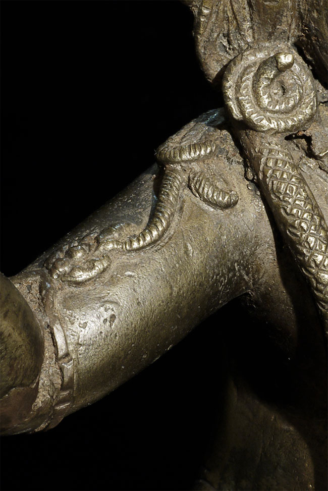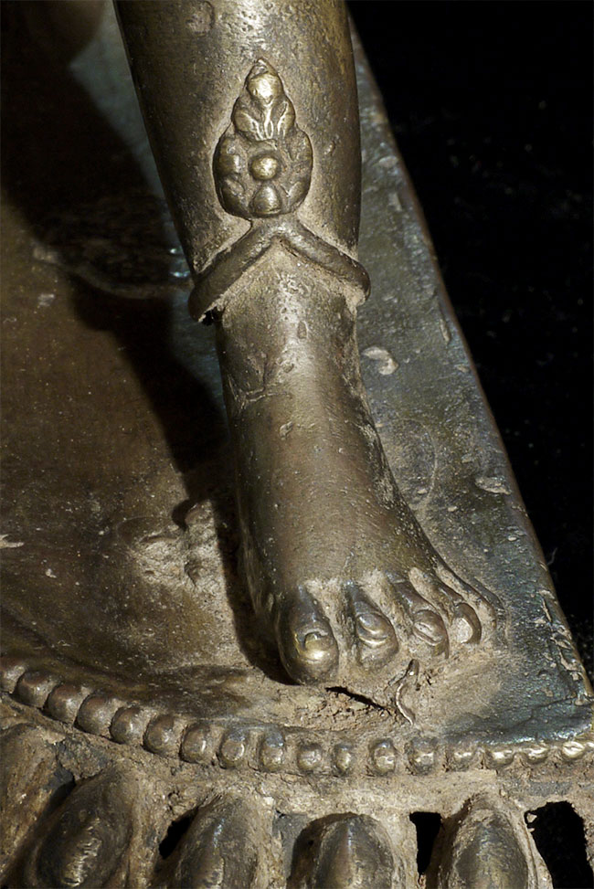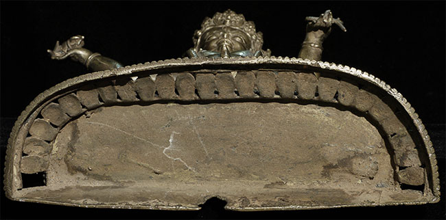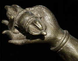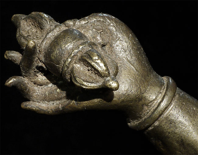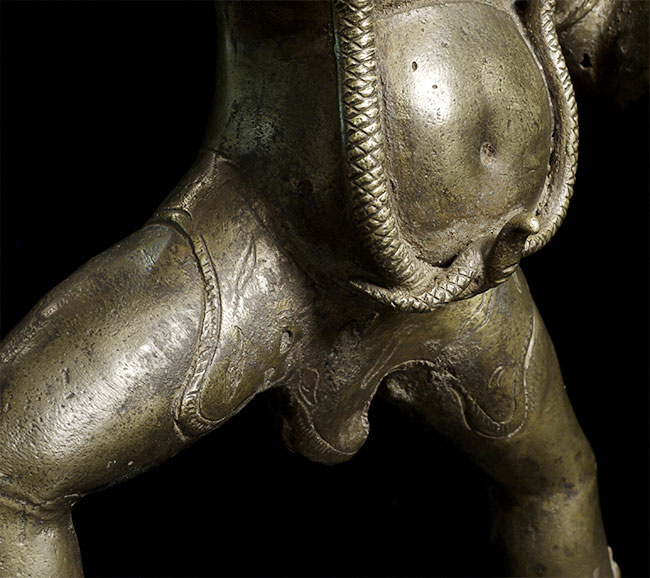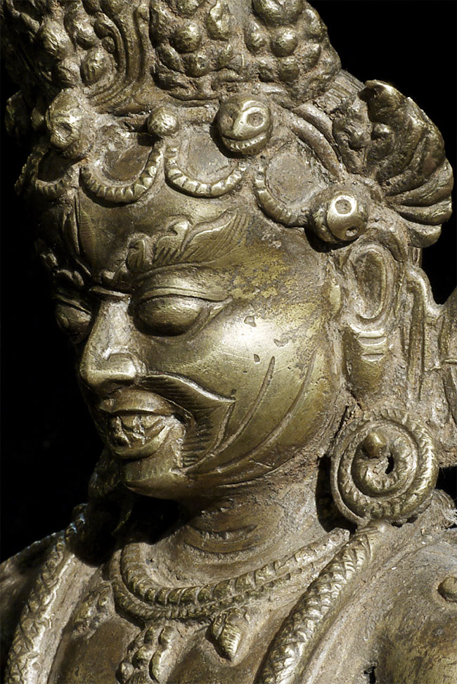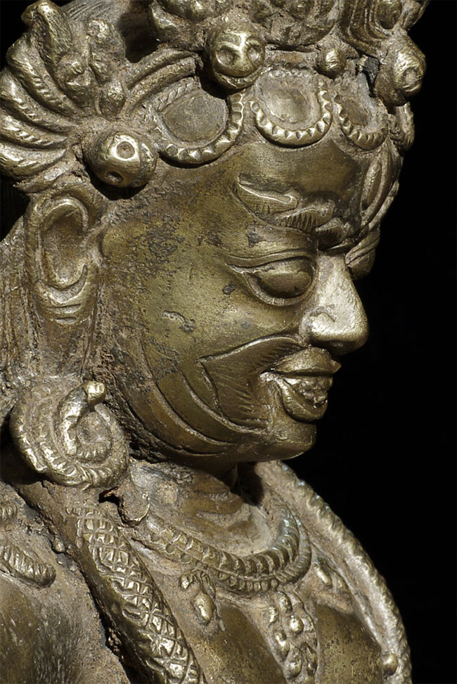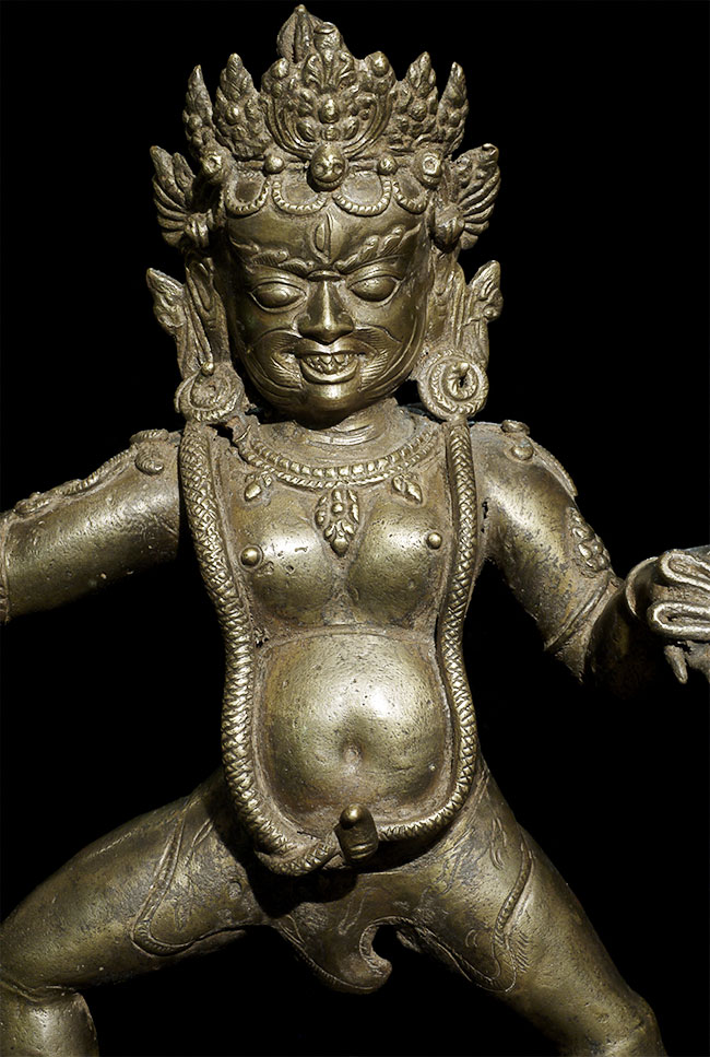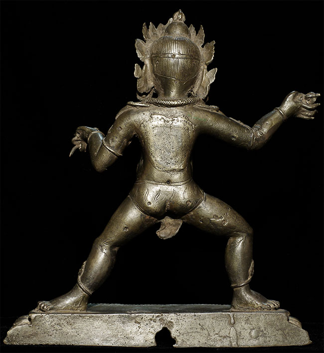 Fierce antique Nepalese deity in lively attitude. Stands 9.5" tall.