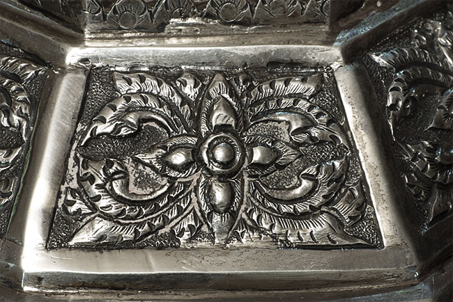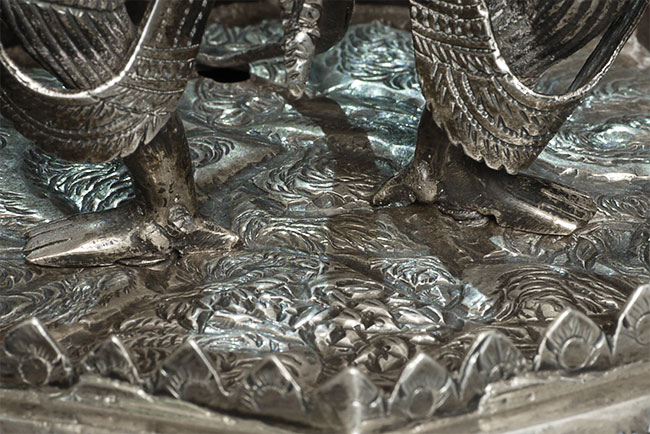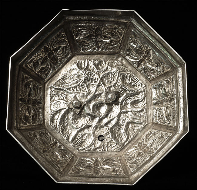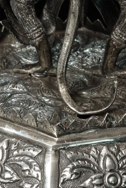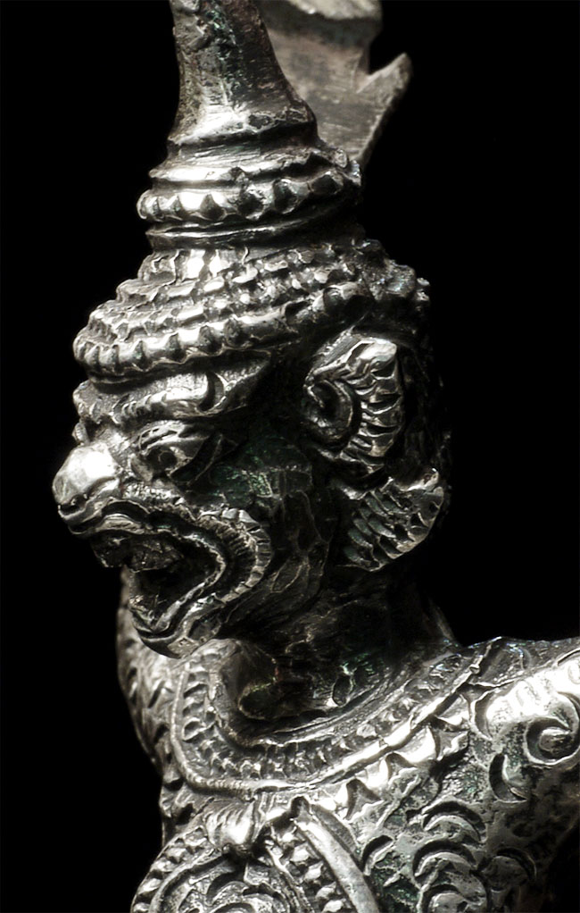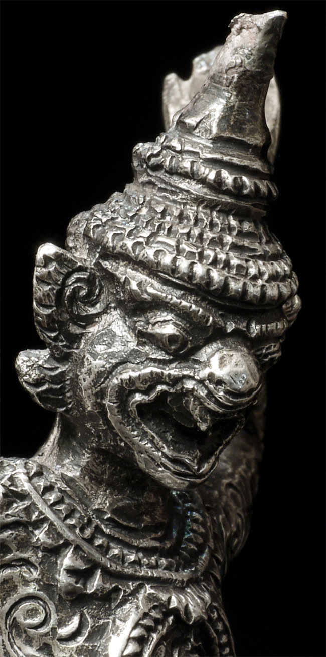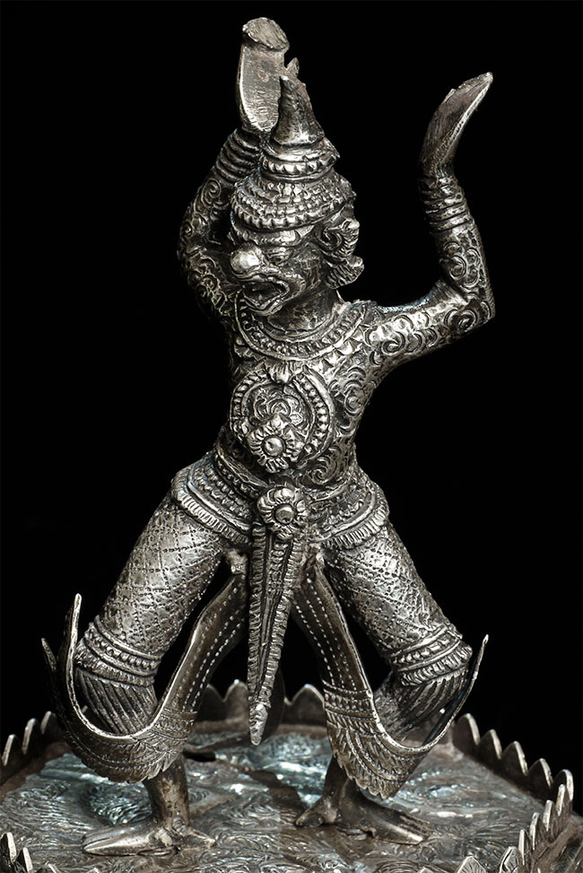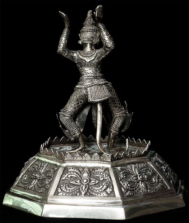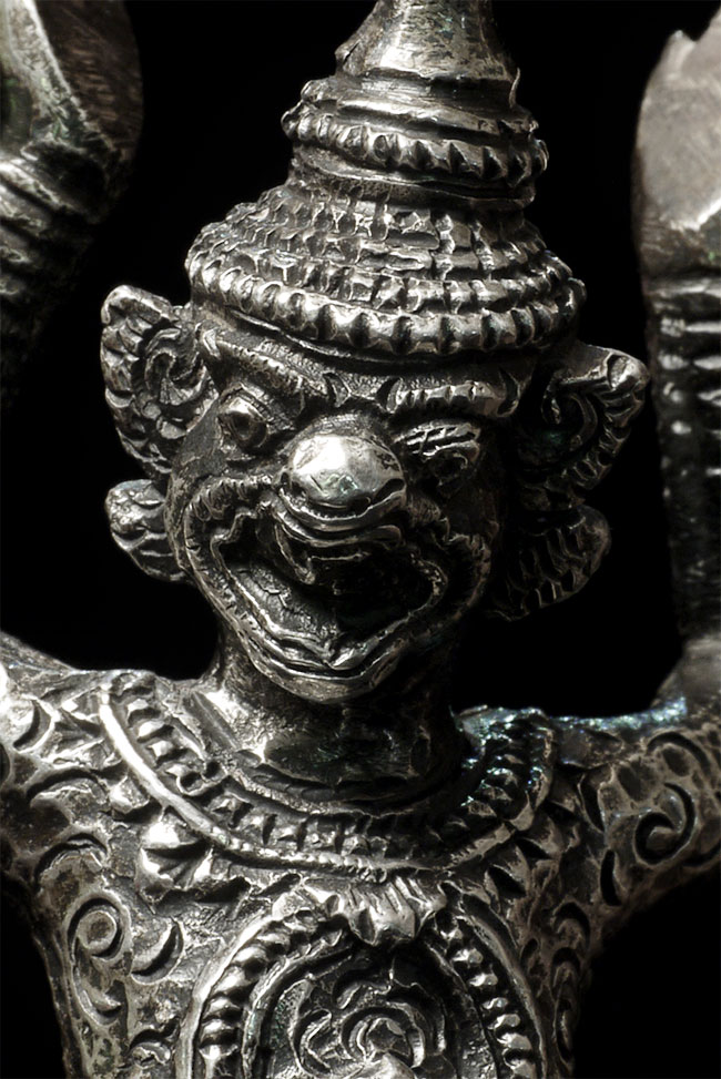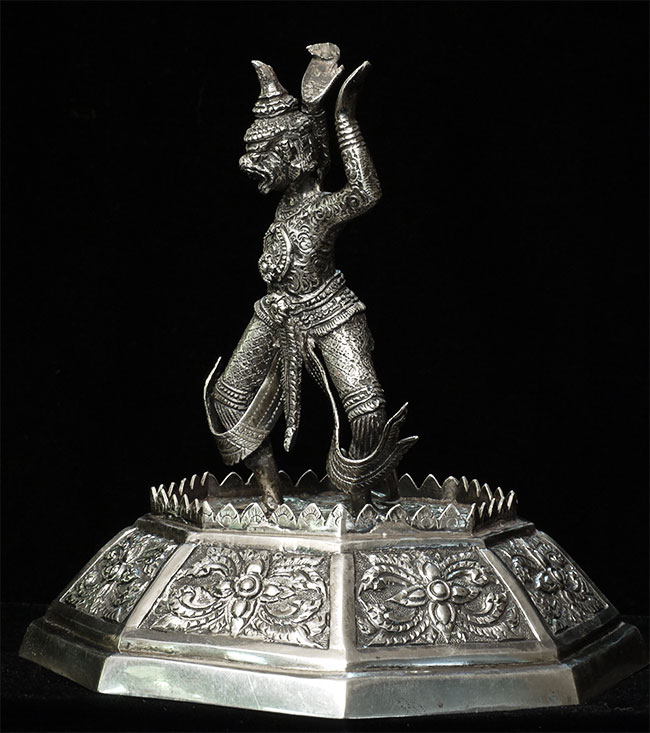 Powerful presence to this solid-cast silver Hanuman on a silver repousse base, circa 1900. Previous owner stated he had tested silver content and that it is cast out of high grade silver. I have not tested myself. Originally figure was holding something over his head- possibly Vishnu. Great detail. Stands 5.25" tall, diameter of 5".