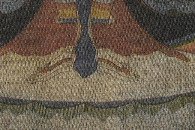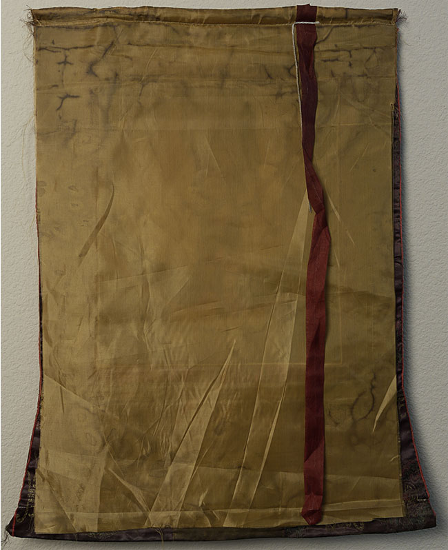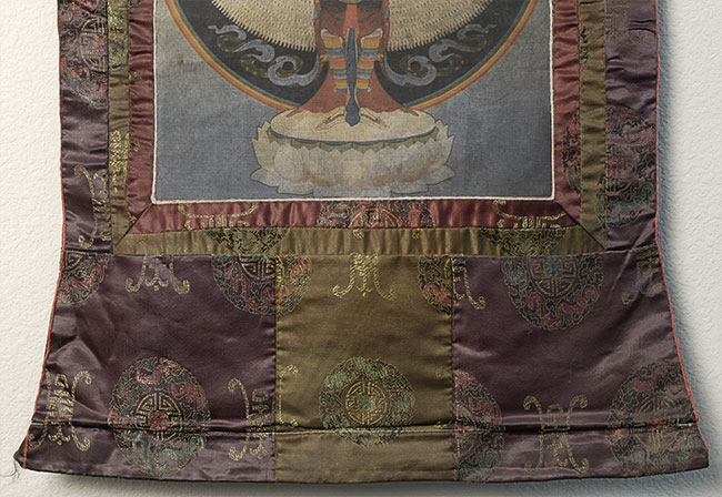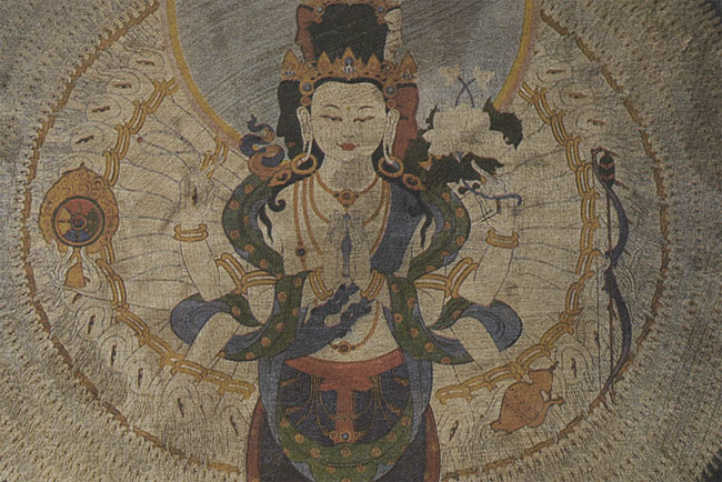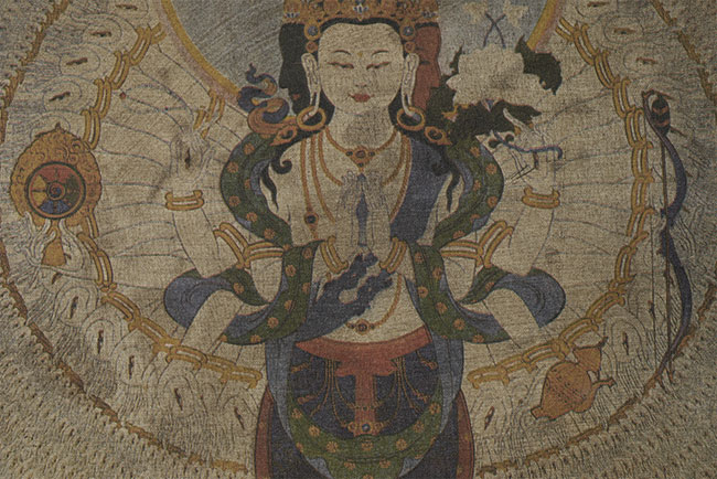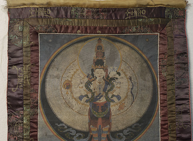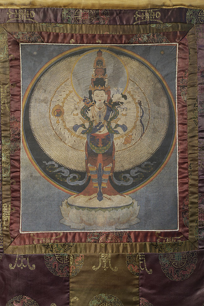 Decorative Thangka of the thousand arm Bodhisattva of compassion. Appears to be printed. Inner panel is 16.5" x 13.5", outer edge measures 30" x 21"