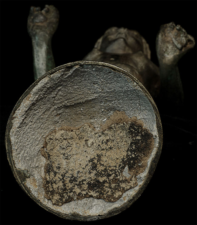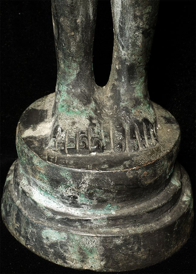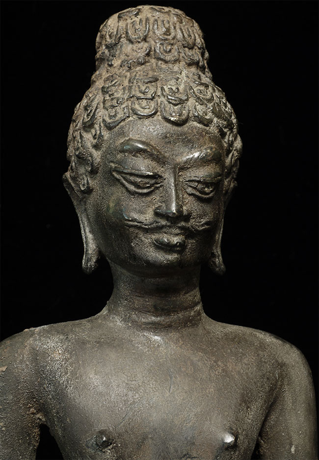 Well cast 8/9thC Prakhon Chai style bronze Buddha. Does not appear to be a period piece. Still, an unusually nice example of its type. I'm thinking it is 20th century because of the look of the underside, though it is possible it was filled later in order to stablize (solid cast figure is heavy for its size). Purchased from a French collection- I believe it was collected by the previous owner in the 1960's or 70's. Very good size at 14 7/8" including the attached base.