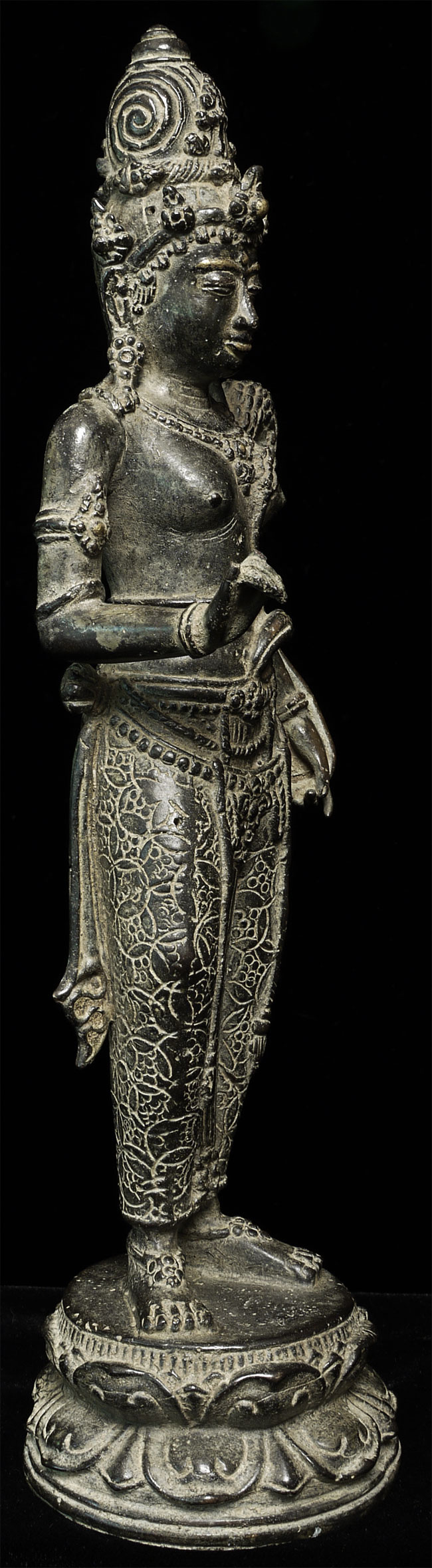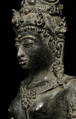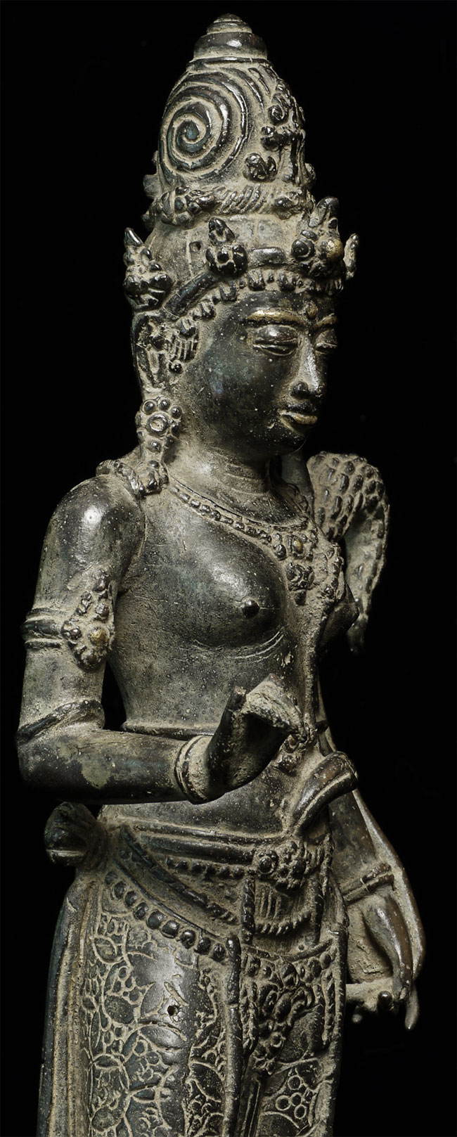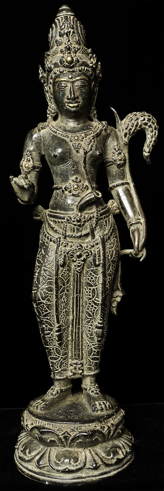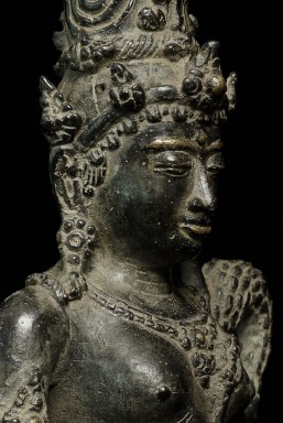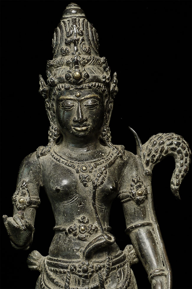 Beautiful antique Indonesian bronze Bodhisattva with gilding applied to lips, eyebrows and jewels on the forehead and crown. Stands 11" tall. Outstanding example of its type.