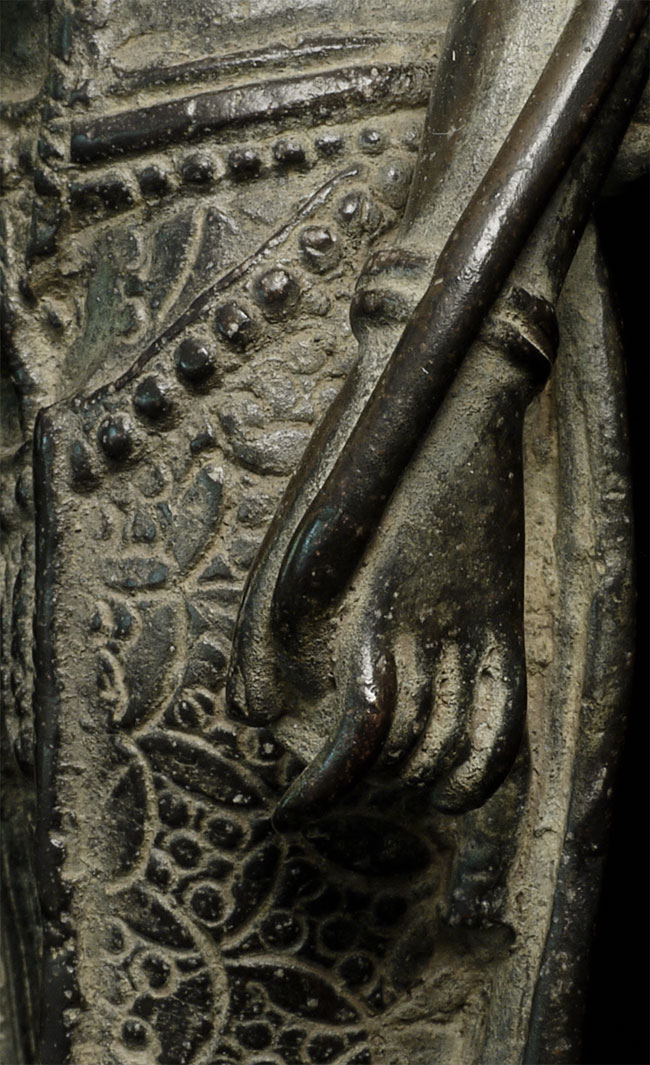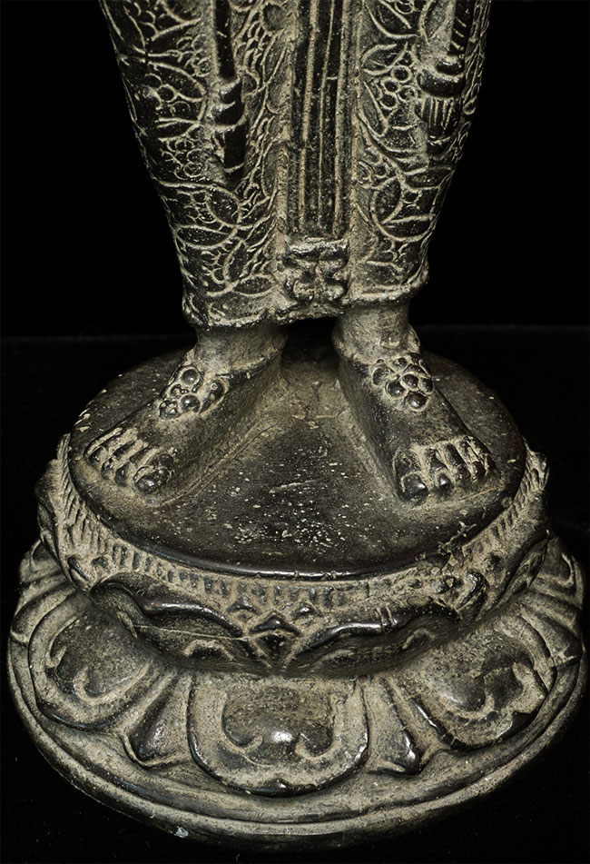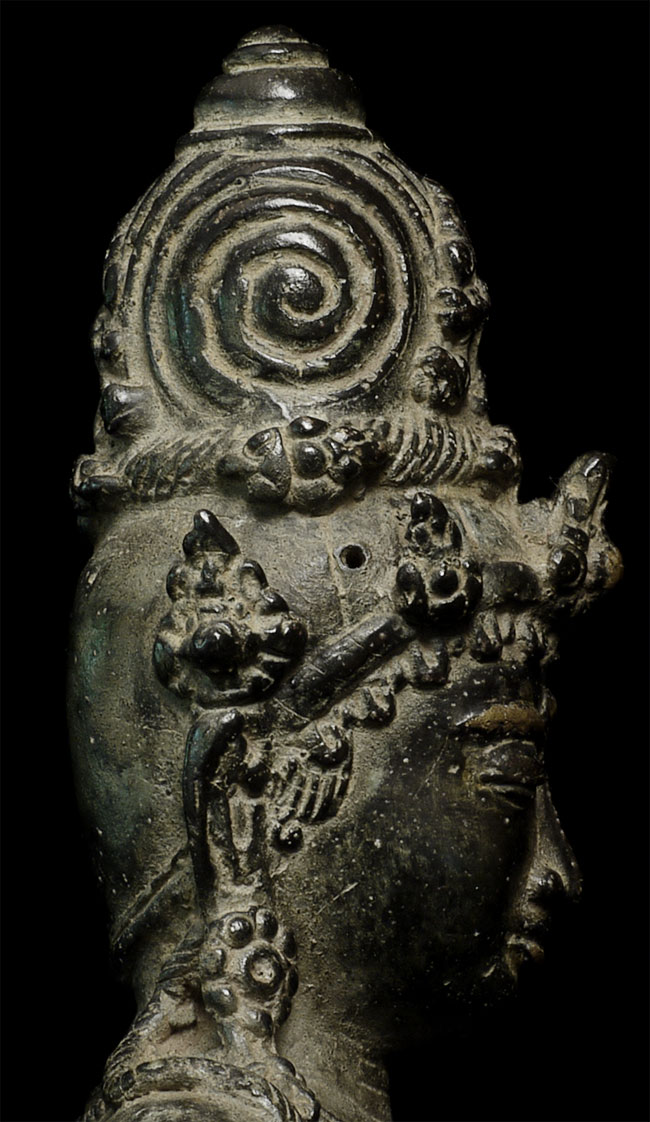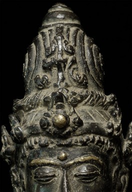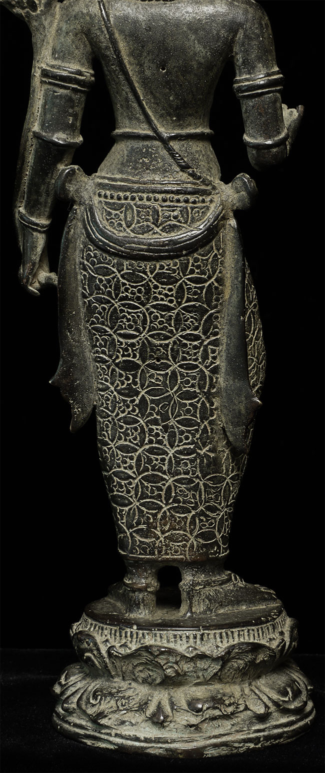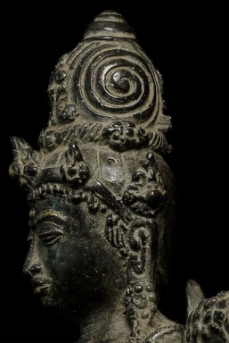 Beautiful antique Indonesian bronze Bodhisattva with gilding applied to lips, eyebrows and jewels on the forehead and crown. Stands 11" tall. Outstanding example of its type.
