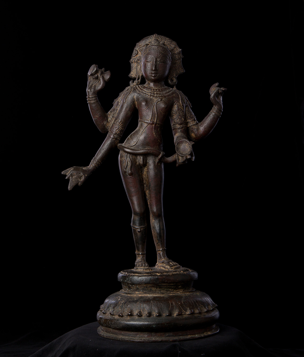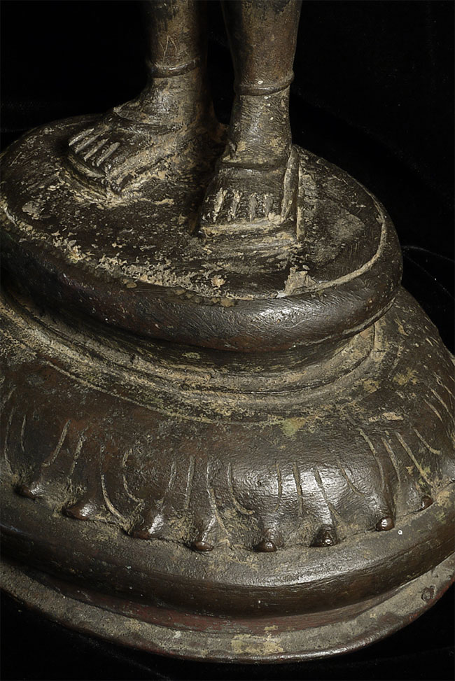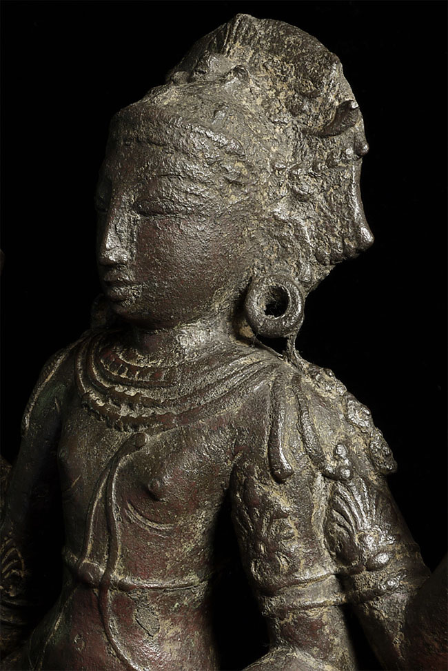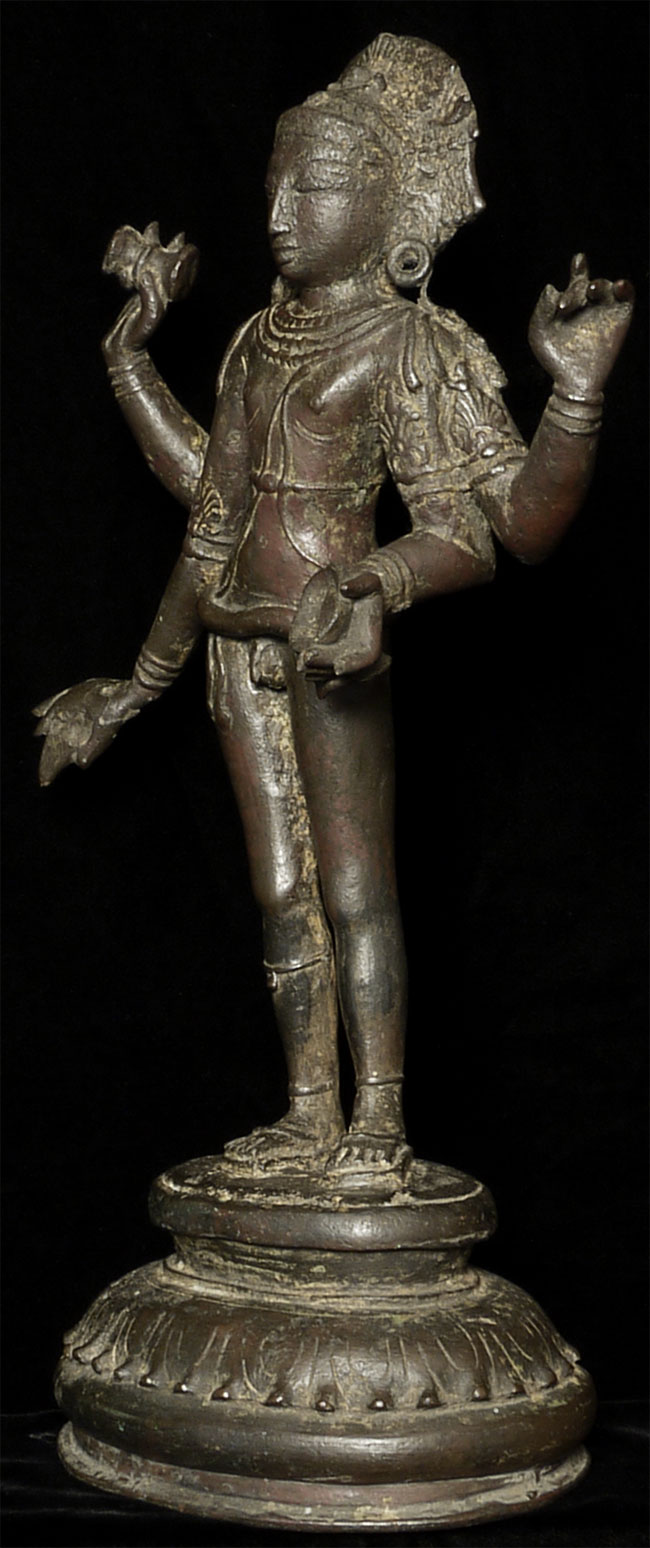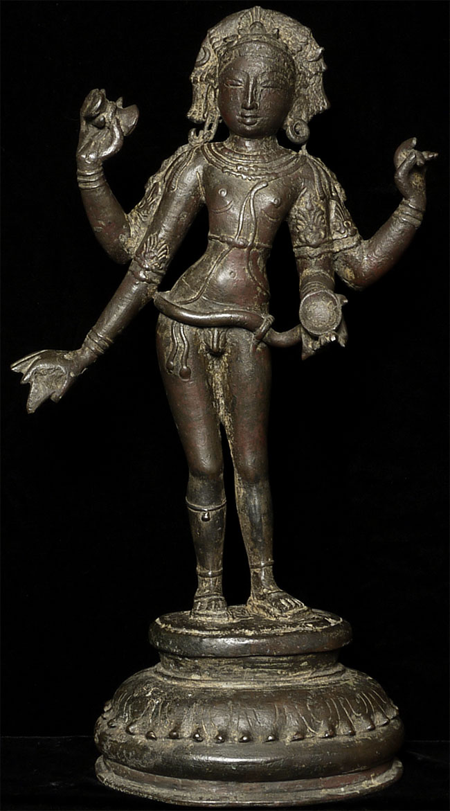 Superb 10th or possibly 11th century solid cast early Chola bronze deity from India. Condition is very good. One hand worn flat, (this is not actually damage, but because this hand sticks out and the piece is 1000 year old it has been worn flat over time). Solid cast and very heavy. It has some wear, but this is normal for an authentic piece of this large size that is so old- in India people touch their statues a lot-especially on the face. Otherwise near perfect, with an untouched chocolate brown patina. Height is near 18" (45 cm). The best Indian piece I have ever offered on my website in the 17 years I have been in existence. Ecstatic expressive face, graceful sensuous body, perfect balance and radiant glow found on only the very greatest examples. Pala and Chola examples of this size are extremely rare- especially of this gracefulness. It has been examined by a number of experts in Indian bronzes, including one who spent several months in the Chola region studying early bronzes. He said this type with this kind of base is not as common as the square type with holes in it for carrying in processions, but it is known (as type 3), and is everybit as valued and valuable as the more common square base types. Few of this size in this quality from this early date are available on the world market.
