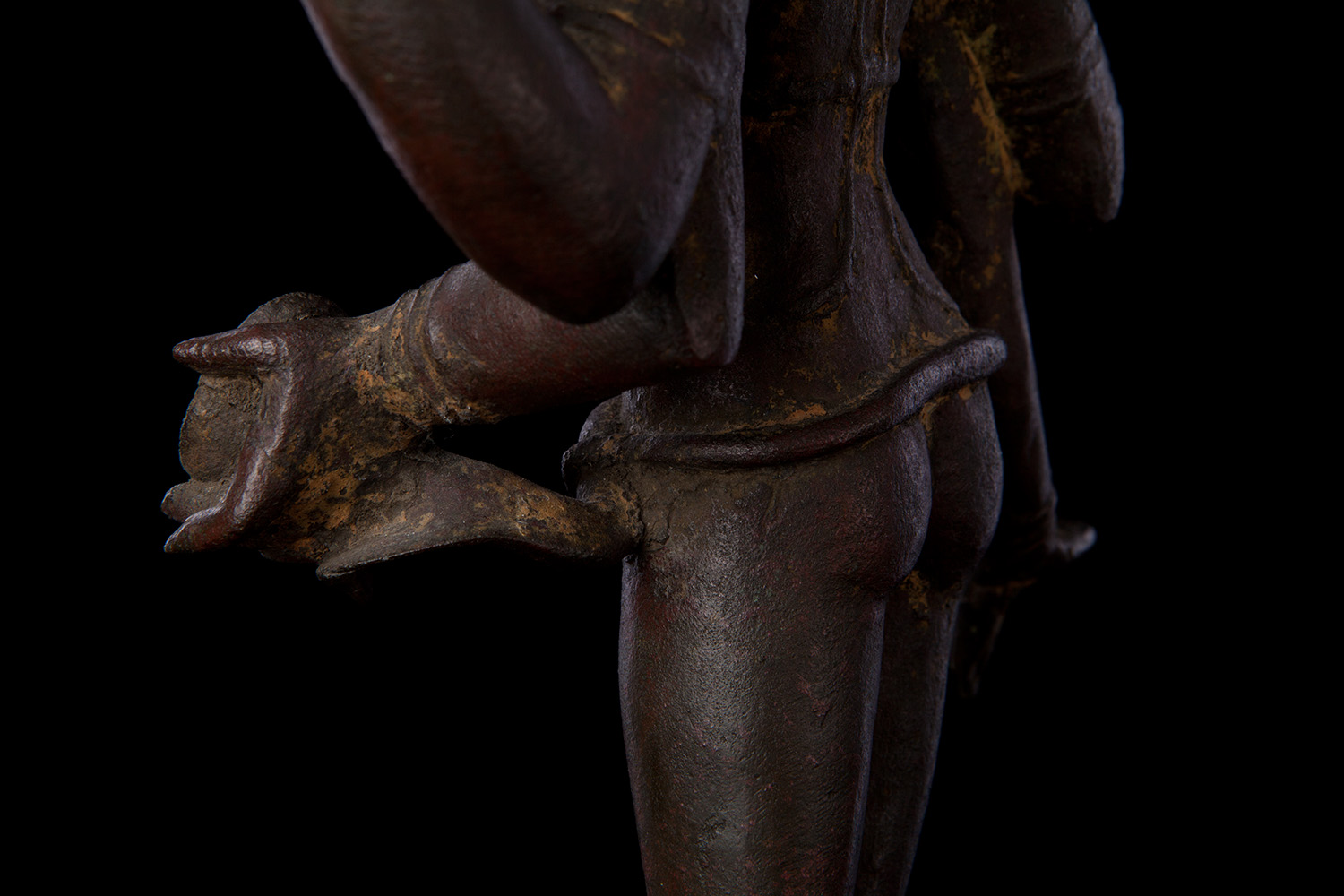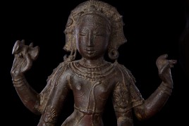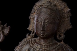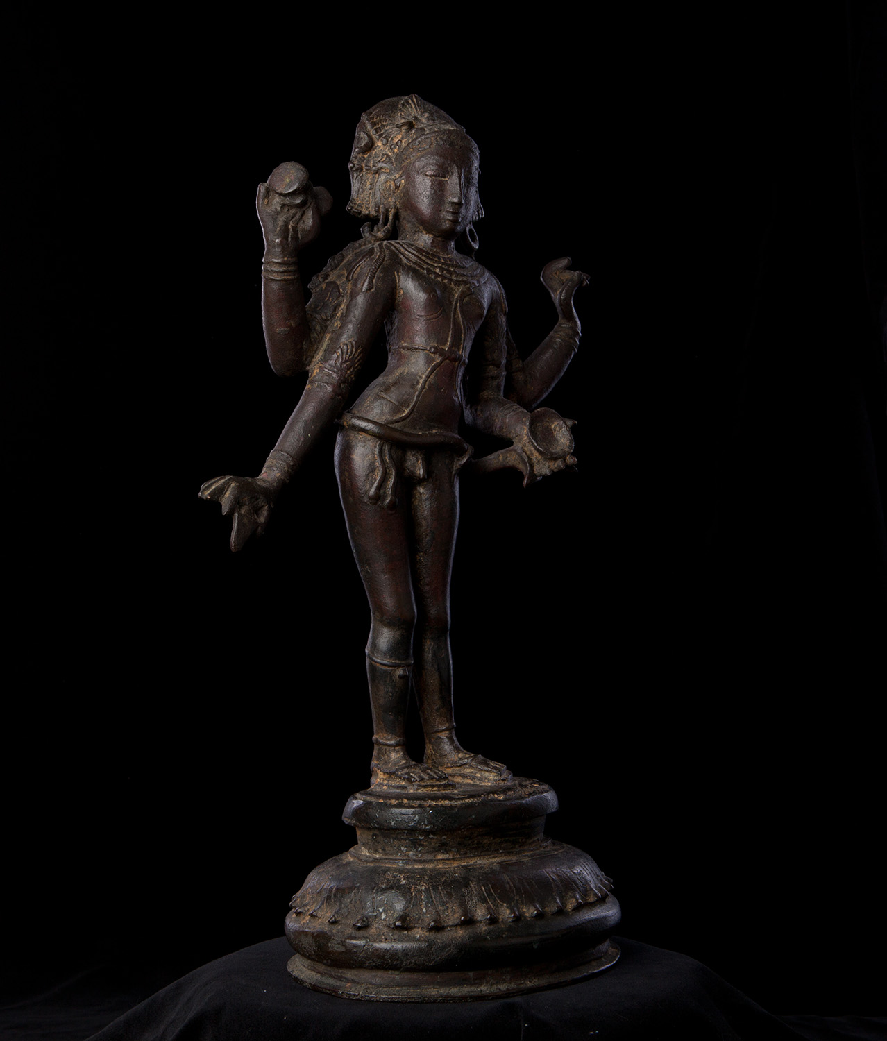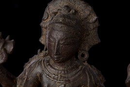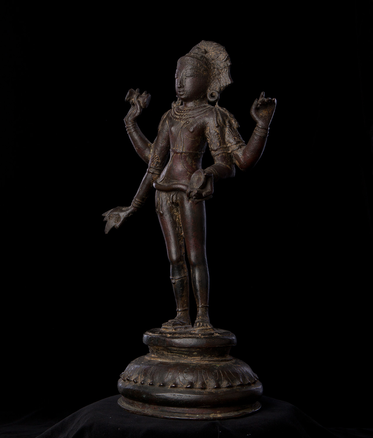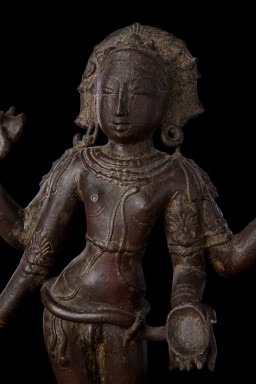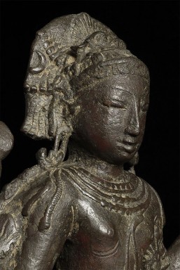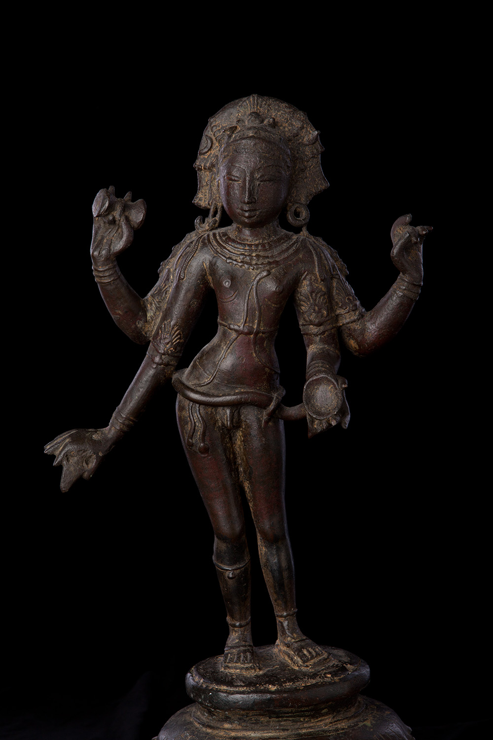 Superb 10th or possibly 11th century solid cast early Chola bronze deity from India. Condition is very good. One hand worn flat, (this is not actually damage, but because this hand sticks out and the piece is 1000 year old it has been worn flat over time). Solid cast and very heavy. It has some wear, but this is normal for an authentic piece of this large size that is so old- in India people touch their statues a lot-especially on the face. Otherwise near perfect, with an untouched chocolate brown patina. Height is near 18" (45 cm). The best Indian piece I have ever offered on my website in the 17 years I have been in existence. Ecstatic expressive face, graceful sensuous body, perfect balance and radiant glow found on only the very greatest examples. Pala and Chola examples of this size are extremely rare- especially of this gracefulness. It has been examined by a number of experts in Indian bronzes, including one who spent several months in the Chola region studying early bronzes. He said this type with this kind of base is not as common as the square type with holes in it for carrying in processions, but it is known (as type 3), and is everybit as valued and valuable as the more common square base types. Few of this size in this quality from this early date are available on the world market.
