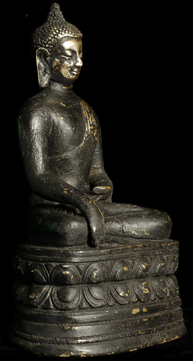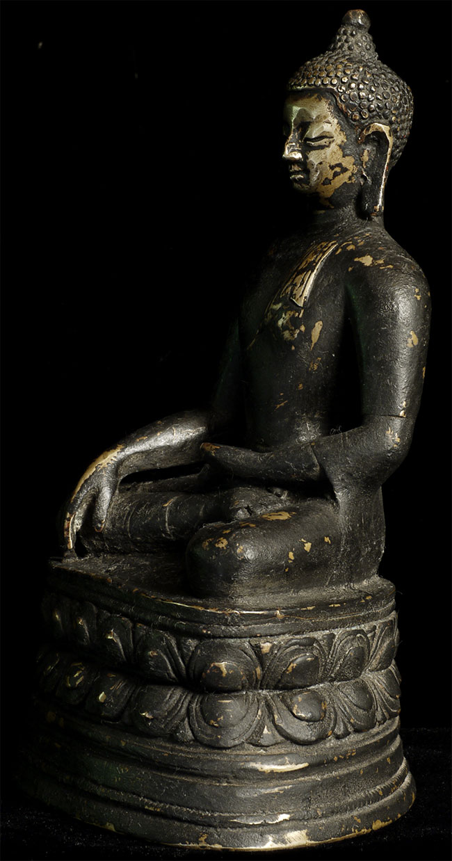 Antique Mongolian or Tibeto-Chinese bronze Buddha. Unusually thickly cast for its type, with ablack patina which is worn away on the face and in some other areas. I'm guessing this is a provincially cast period piece (18/19thC) which went through a fire long ago, but I am truly unsure, as this is such an atypical piece. Sits 6.25" tall