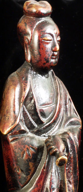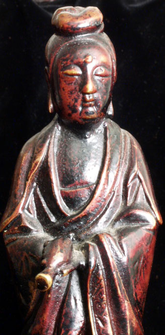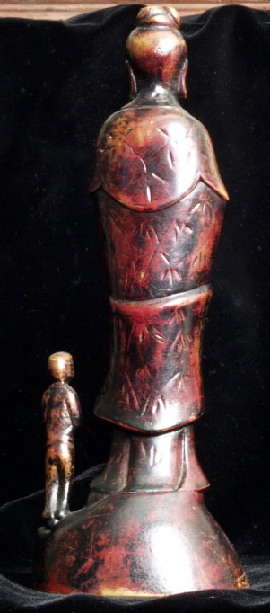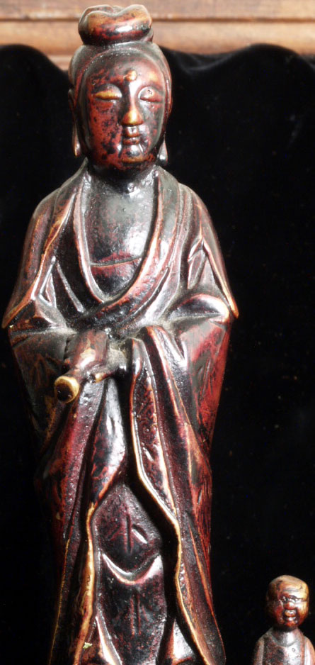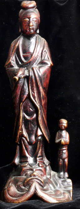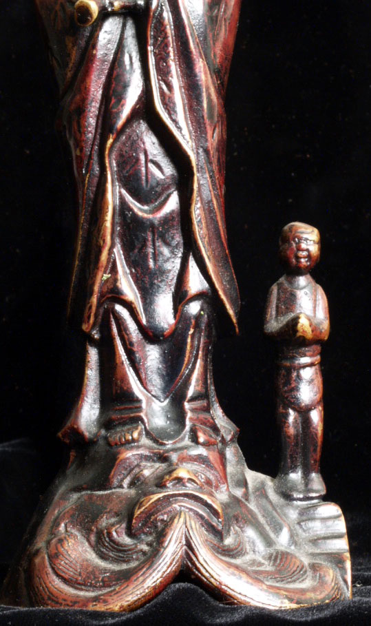 This is a lovely Quan yin standing serenely with her bottle, with a wonderful little boy next to her standing with his hands together in devotion. The face in the waves is also delightful. The piece is lacquered in black and red. It is beautifully done. I am guessing Meiji and feel that it looks turn of the century, but I do not have much experience with things Japanese, so I am unsure how to date it accurately. A beautiful piece.