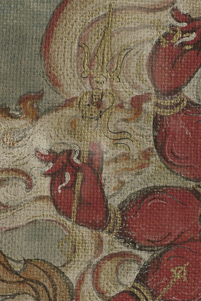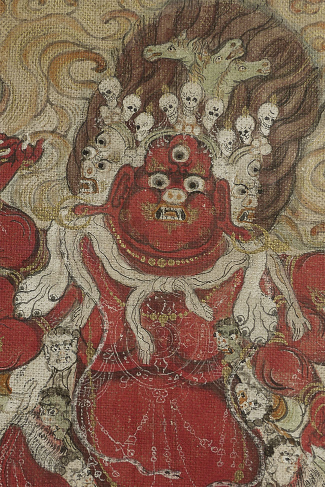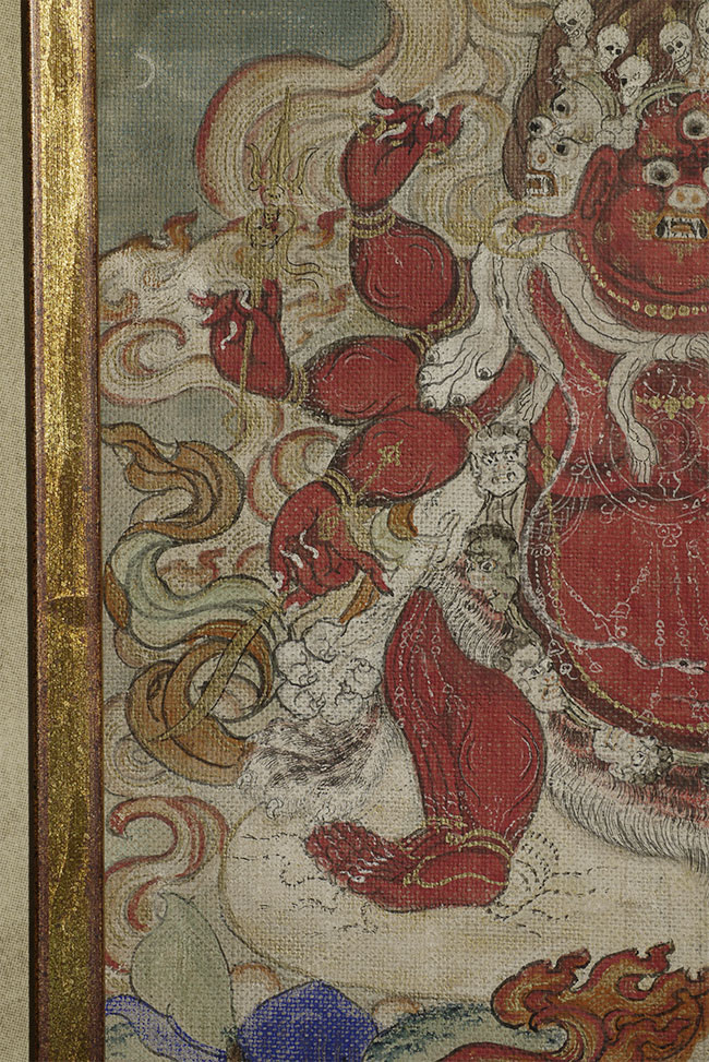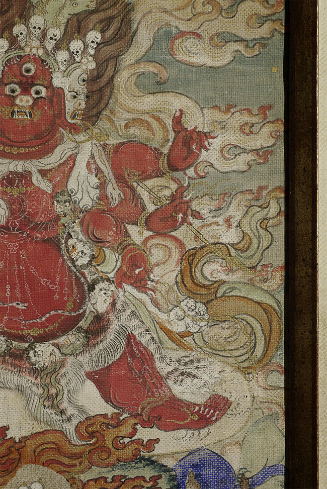 Antique Mongolian Thangka of a fierce (yet cute) protective deity. Purchased in the 1990's when the best quality Mongolian items were available. Very well painted. Carefully and beautifully custom framed. The back is left visible in order to show the extensive inscription on the back. Has been displayed in my home for more than 15 years. . Mat opening is 9.25" x 6.5". Frame size is 13.5" x 16.25".