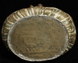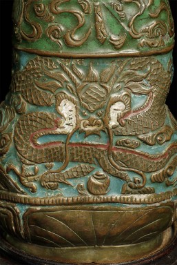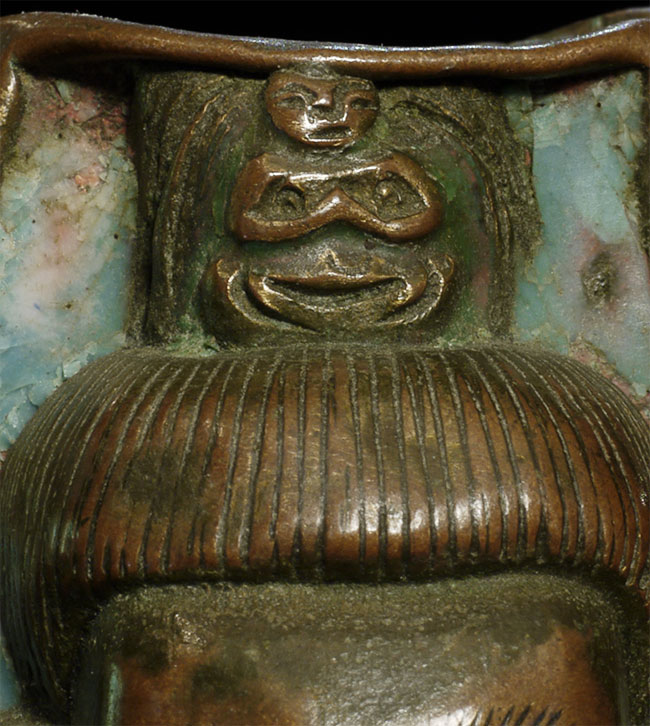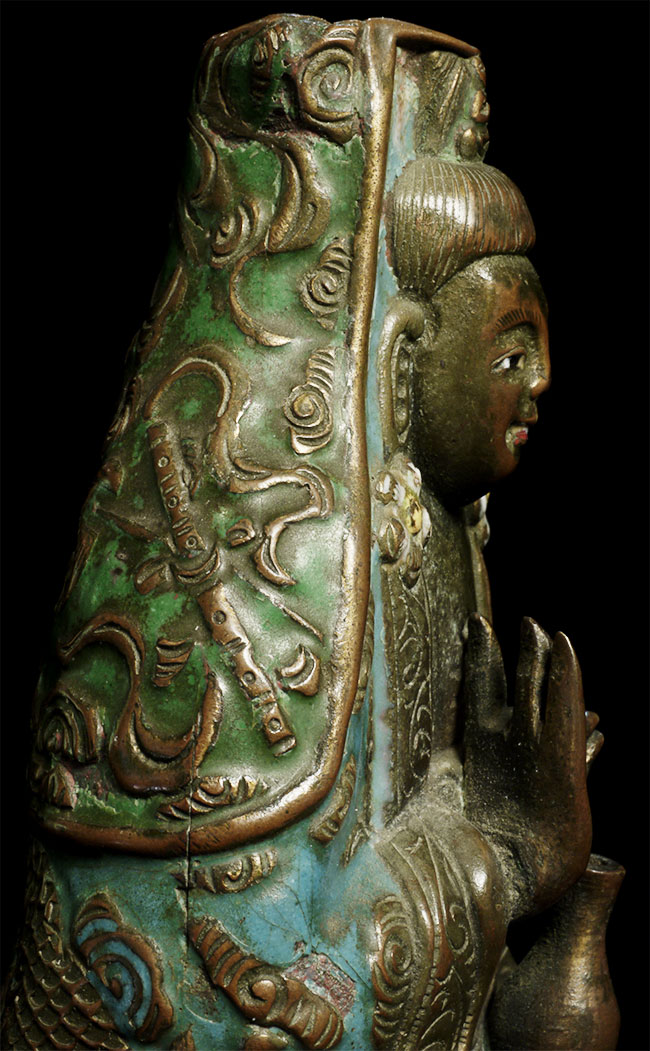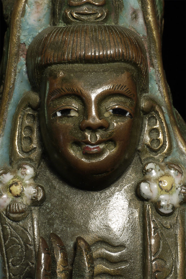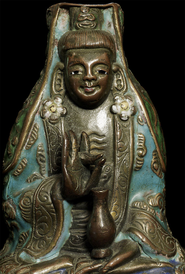 Wonderful cloisonne/champleve over thick copper repousse Tibeto-Chinese Bodhisattva of compattion. 5.75" tall, optional stand is an additional inch in height. Some dings and loss to the enamel. The pupils are also gone, though the figure looks great as is. I've had a number of this type, but have not seen another of this subject with the small Buddha in the headdress. Great equanimity to this complex figure. Probably circa 1800.