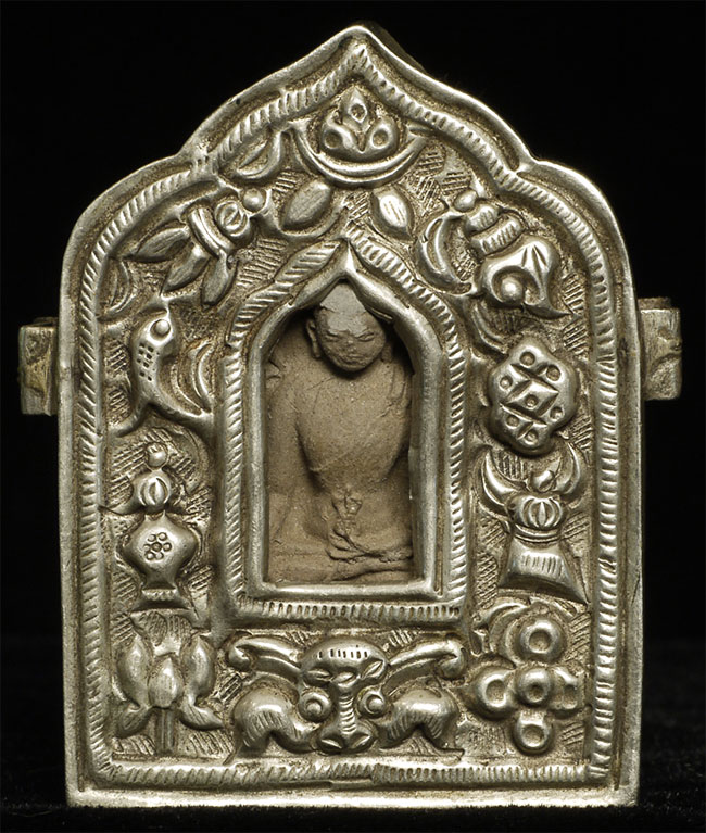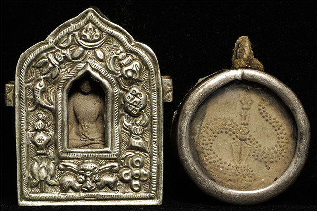 Two antique Mongolian amulets in amulet cases. Size- 1 7/8" tall and 1.25" diameter.