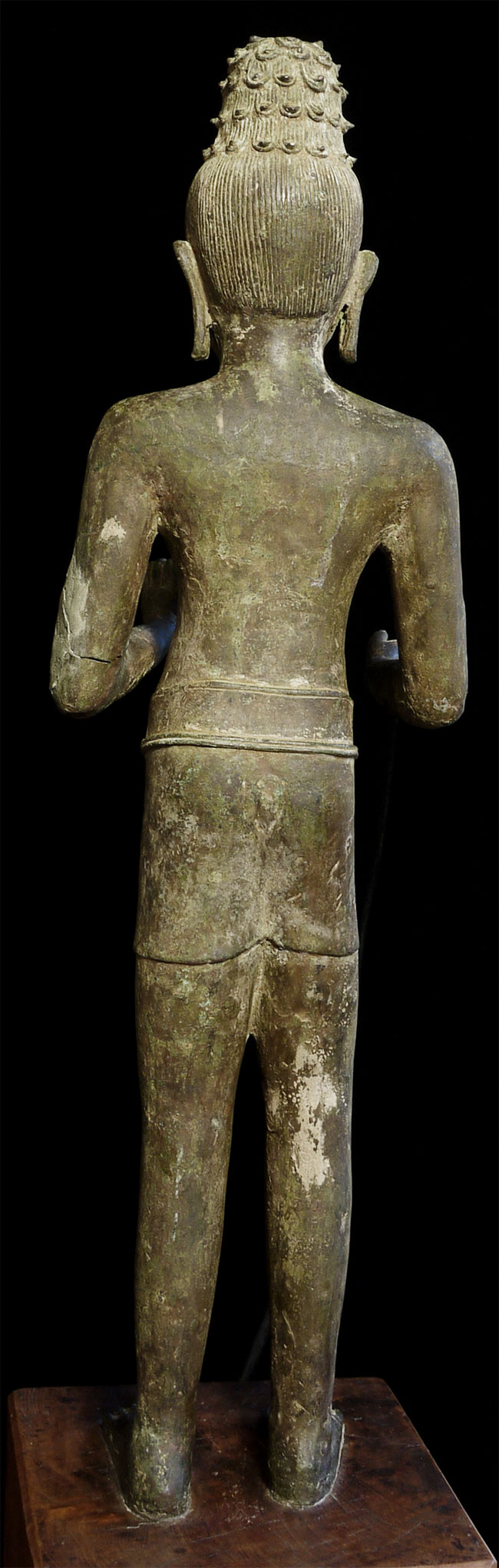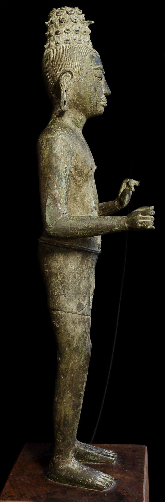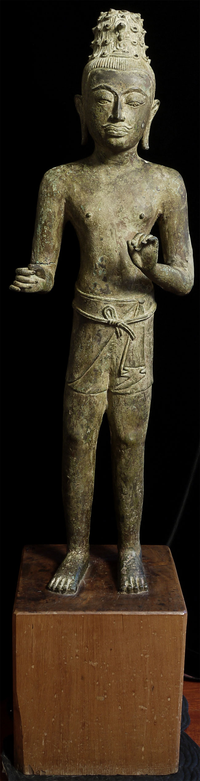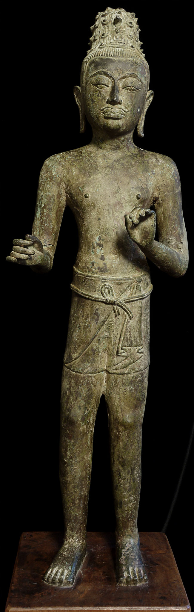 Rare very large and authentic 8/9thC solid-cast copper (?) Buddha of Compassion in a Prakhon Chai style. Part of a group of several hundred bronzes excavated in eastern Thailand near the Cambodian border in 1964 after a ground collapse exposed them during the monsoon rains. This is one of the largest of the group, and is a museum worthy, world class sculpture. Arms re-attached at the elbows(were originally cast separately). This is the most valuable Buddha in my entire collection. Figure alone is an impressive 38.5", attached base is 13.25" x 12" x 12". Incredibly heavy. I've never seen one this size on the market, and most examples in museums are smaller(including the examples in the Asian Art Museum in San Francisco and the Metropolitan Museum of Art in New York). This is also the only example of any type I can find with a small Naga Buddha embedded in the stylized hair atop the head.