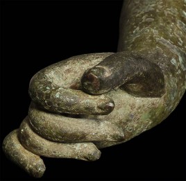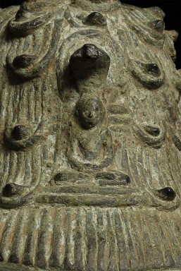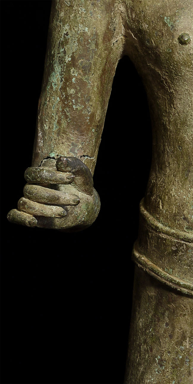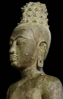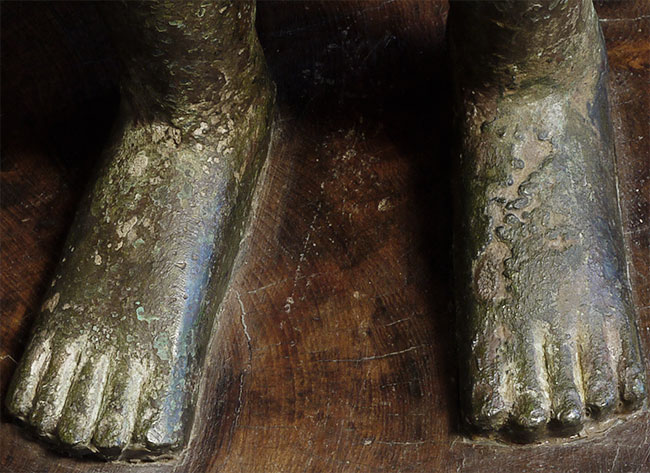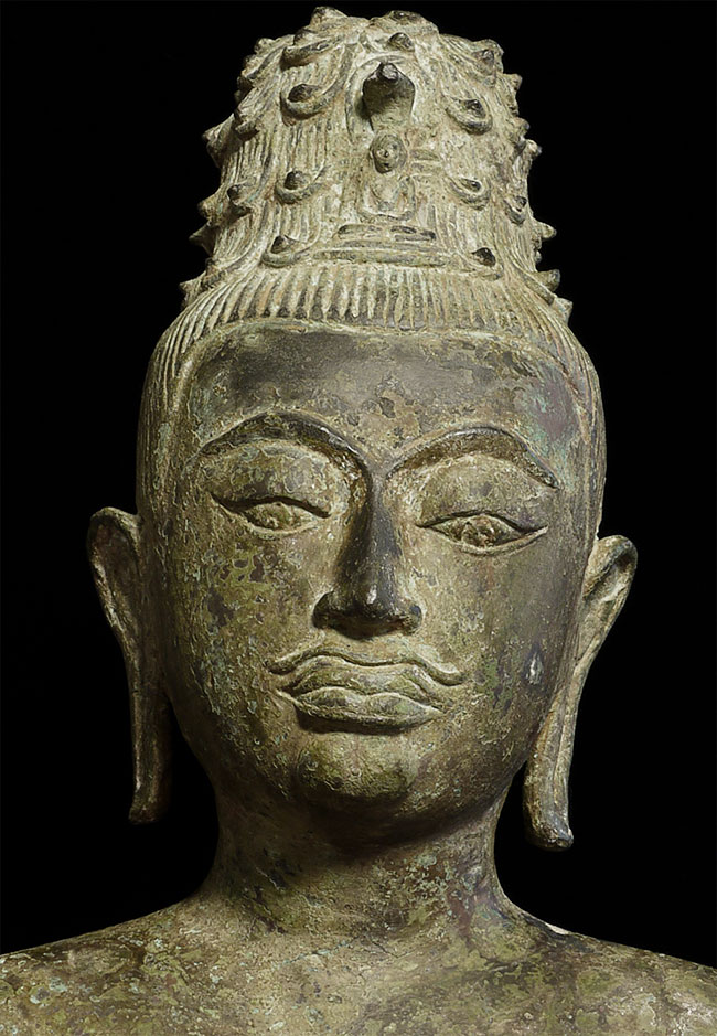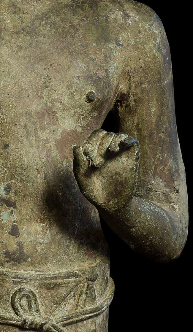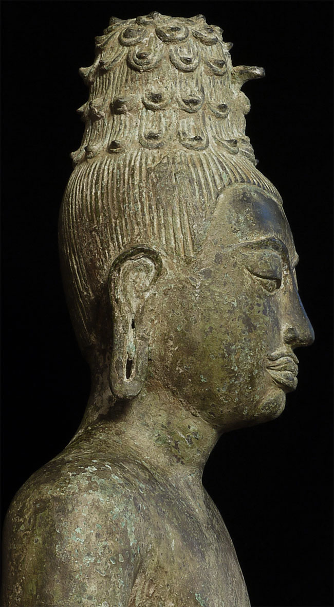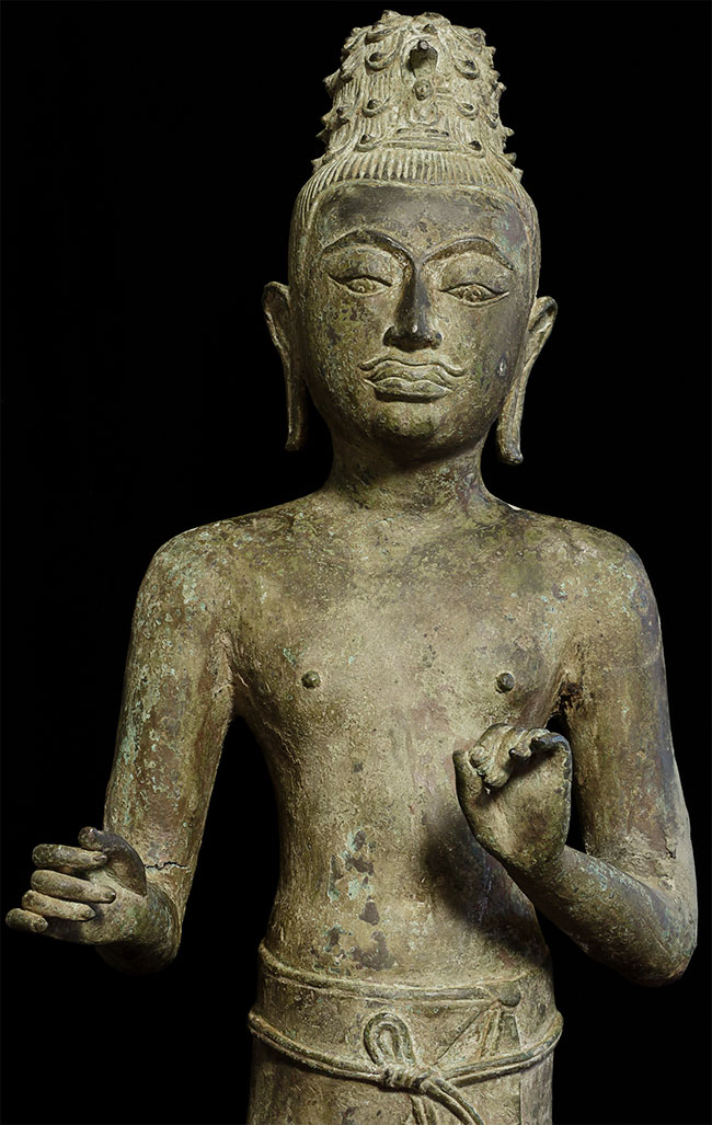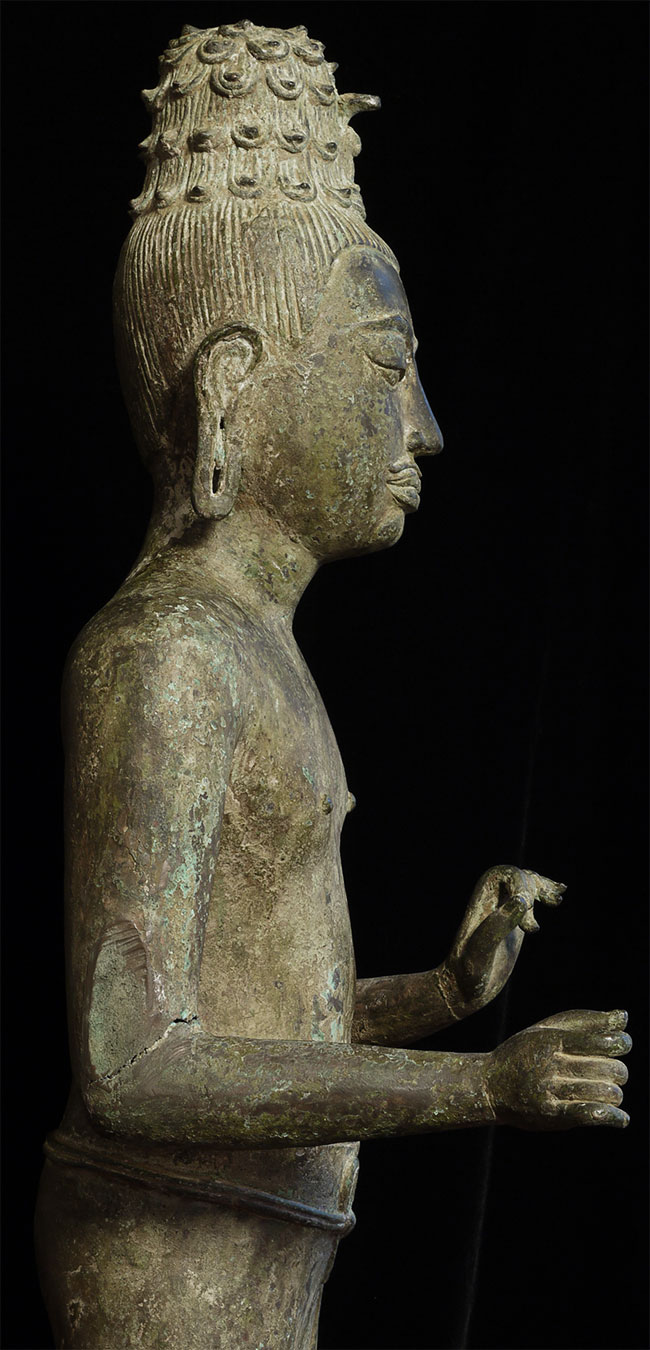 Rare very large and authentic 8/9thC solid-cast copper (?) Buddha of Compassion in a Prakhon Chai style. Part of a group of several hundred bronzes excavated in eastern Thailand near the Cambodian border in 1964 after a ground collapse exposed them during the monsoon rains. This is one of the largest of the group, and is a museum worthy, world class sculpture. Arms re-attached at the elbows(were originally cast separately). This is the most valuable Buddha in my entire collection. Figure alone is an impressive 38.5", attached base is 13.25" x 12" x 12". Incredibly heavy. I've never seen one this size on the market, and most examples in museums are smaller(including the examples in the Asian Art Museum in San Francisco and the Metropolitan Museum of Art in New York). This is also the only example of any type I can find with a small Naga Buddha embedded in the stylized hair atop the head.