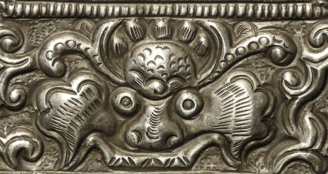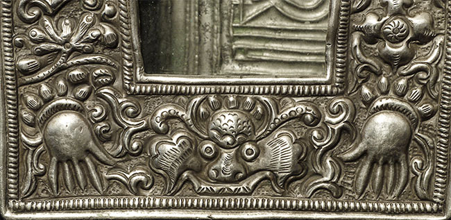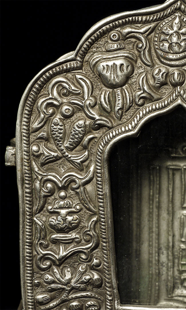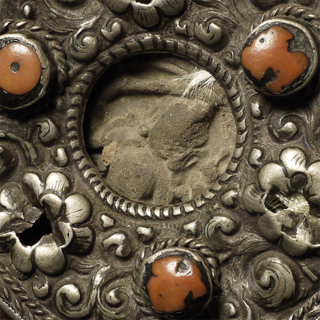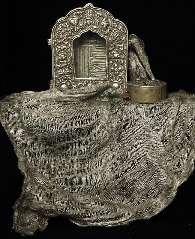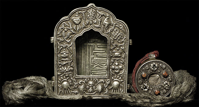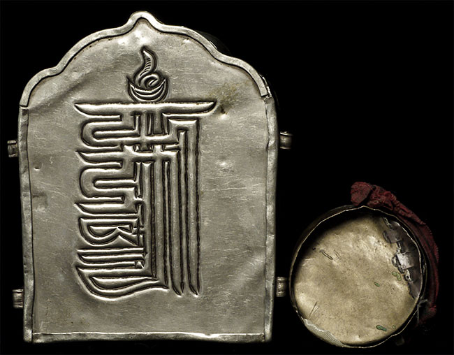Old/antique Tibetan Gau box (larger one on the left- smaller round one not included). Size: 5 1/8" tall, 4" wide.