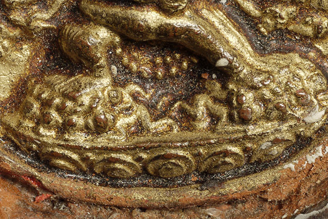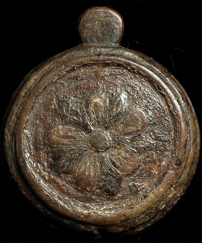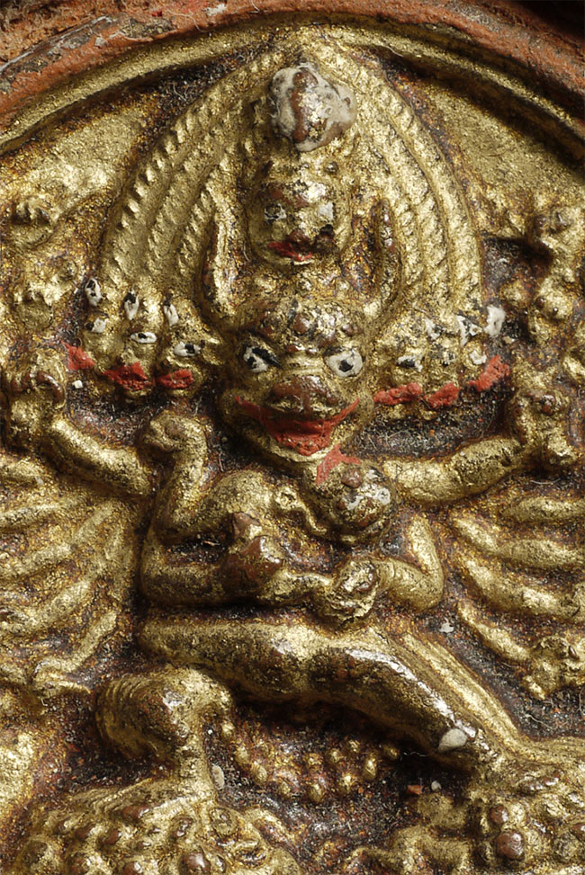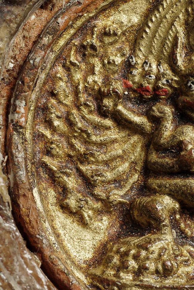 The diameter of this fierce antique Tibetan deity is just 1.5". Total diameter is just over 2". Amazing detail! Tsa tsa is clay, frame is wood.