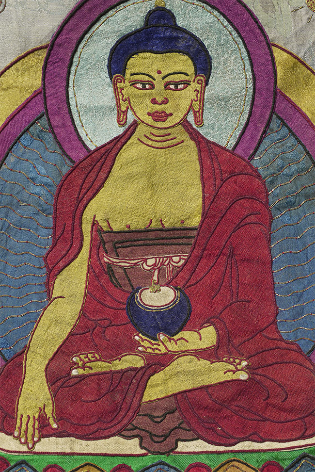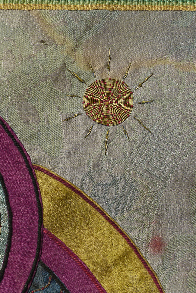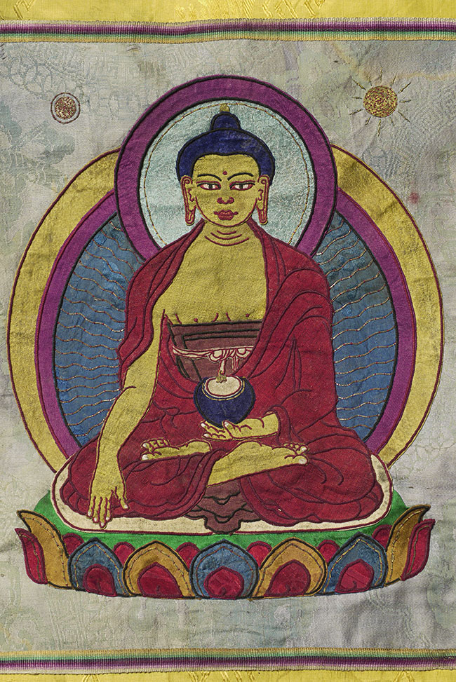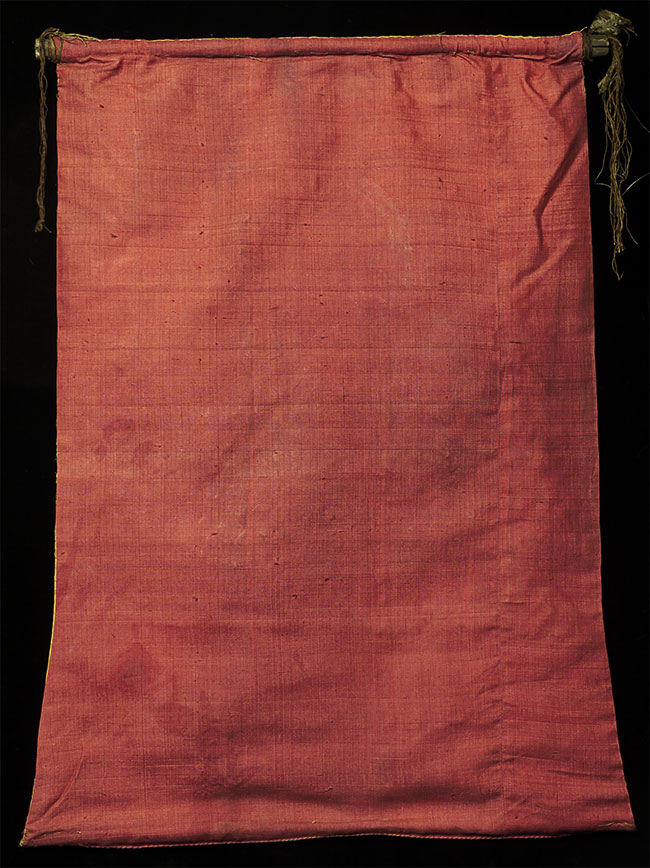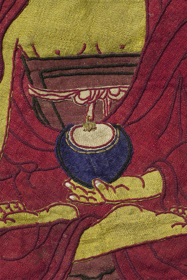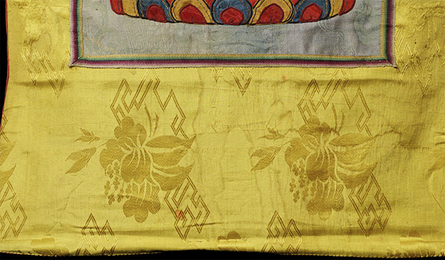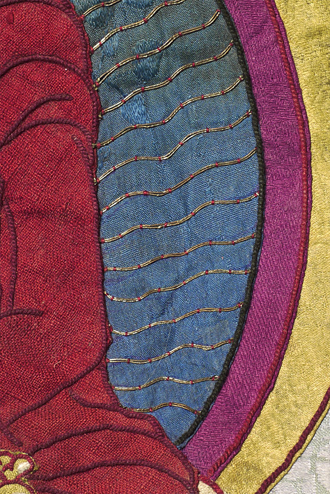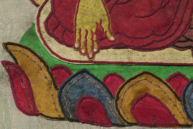Good Mongolian applique Thangka. 20th century, made with antique silk. Each color silk has a different pattern and weave. Nice example of its type. measures 22" x 17"