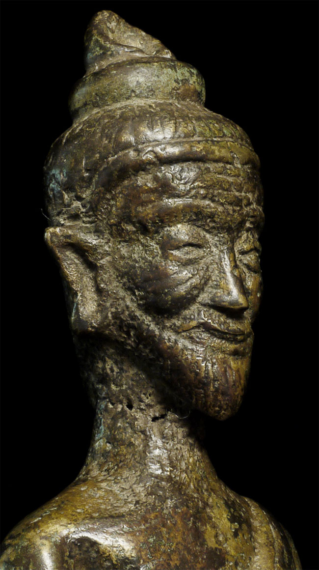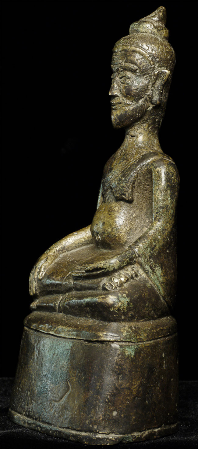 Highly unusual and quite wonderful depiction a wise old monk . This is a particularly charming and well-sculpted example. He looks to be from either the far north of Thailand or from Chiang Rung, which is an area which spans southern Yunan (China) and northern Laos. I've never seen one of this style quite this nice. 5.25" tall.