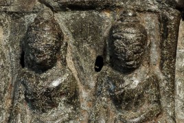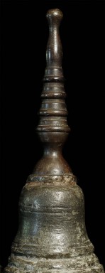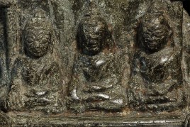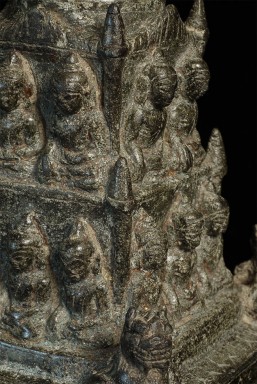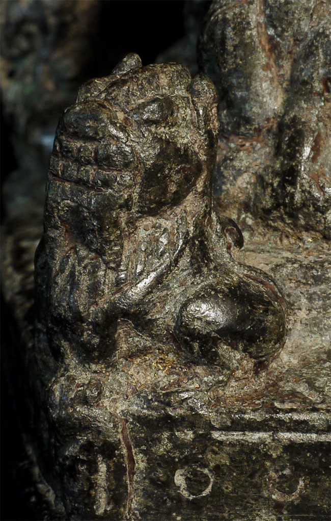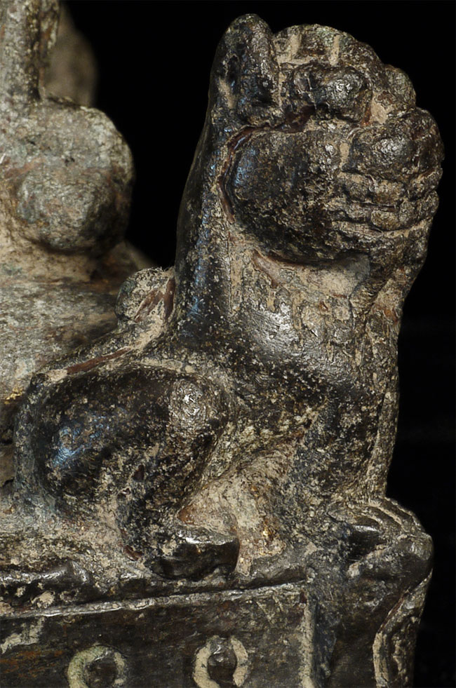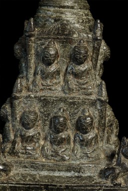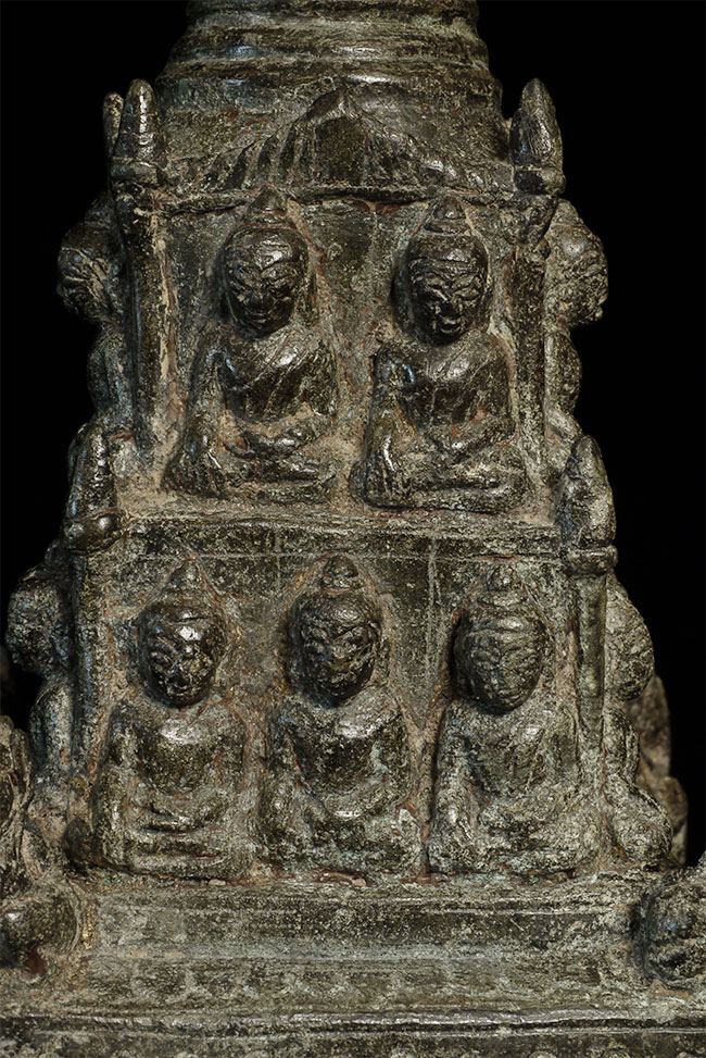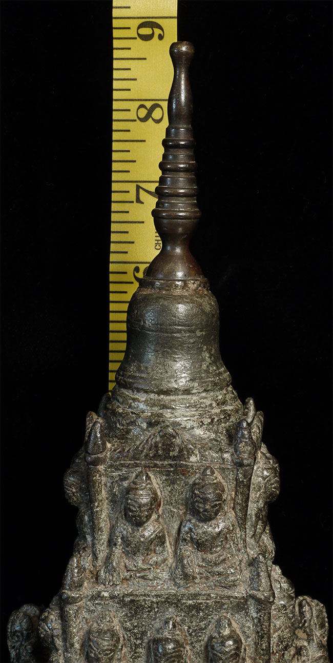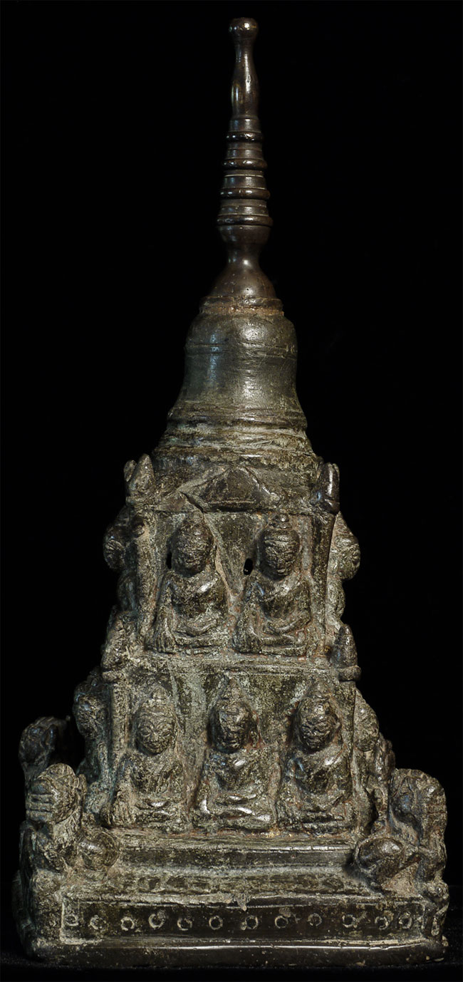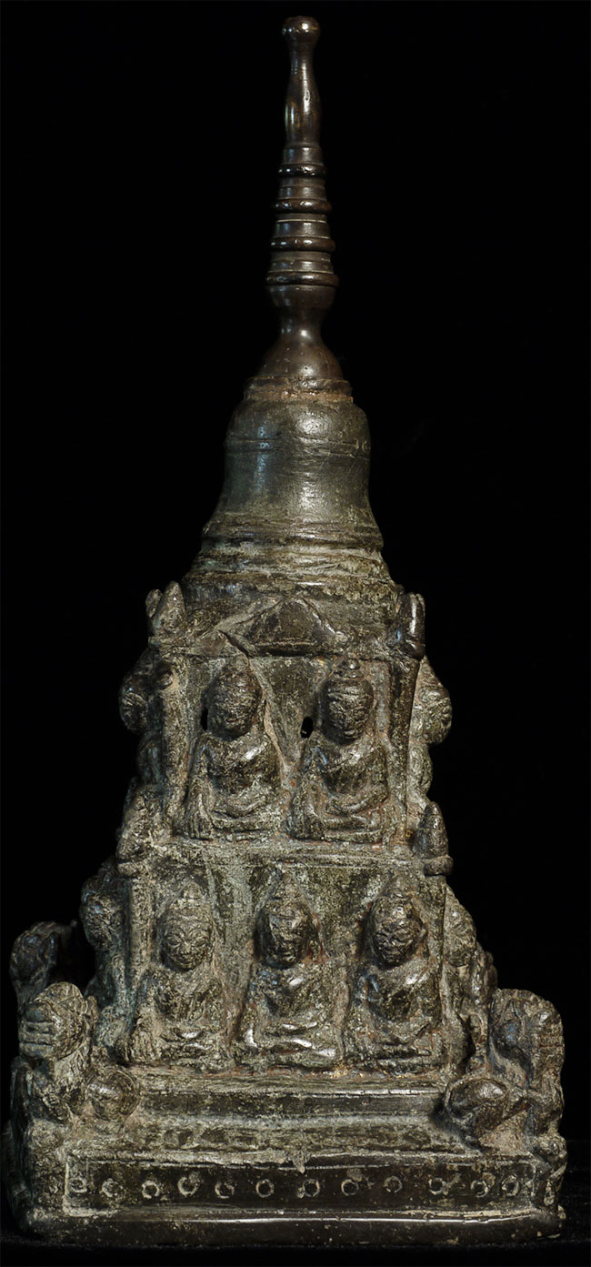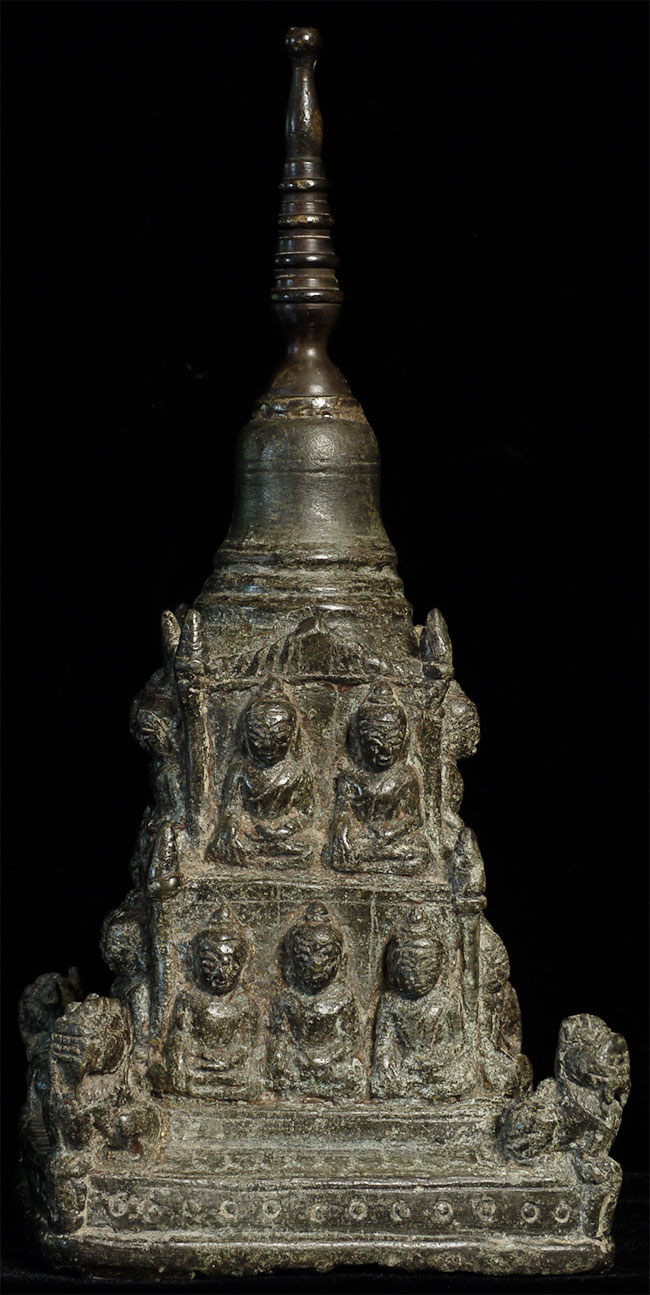 12/13thC Burmese Pagan style Stupa with 5 Buddhas on each side and one lion on each corner. Finial is a different metal, but is original to the piece. 8.75" tall. Significant wear. Rare form. Beautiful patina.