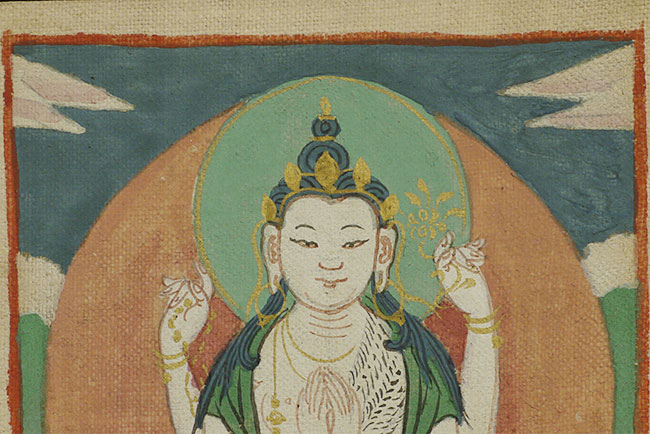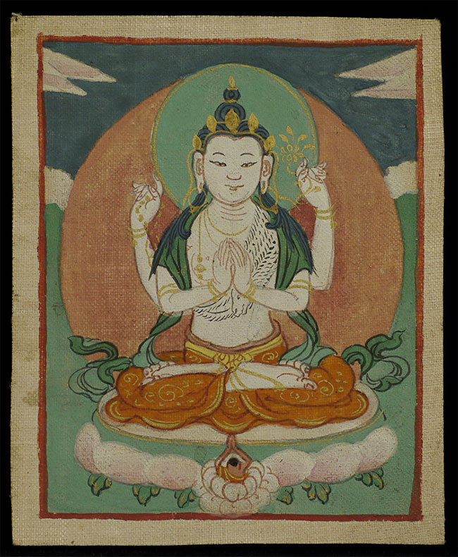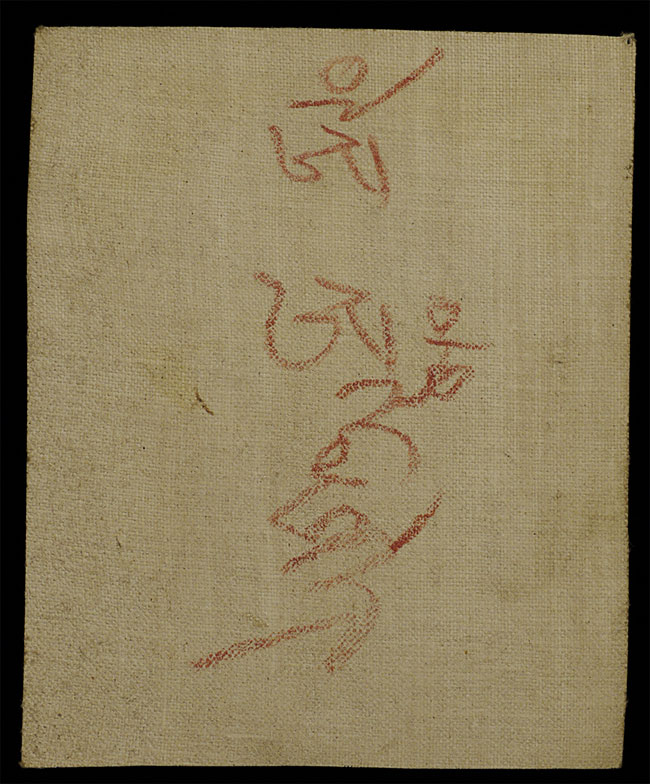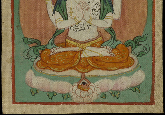 This charming antique Mongolian thangka, measuring 4 5/8" x 3", features a delicately rendered deity seated in serene meditation upon a lotus throne. The soft yet vibrant palette—warm ochres, gentle greens, and subtle pinks—creates a harmonious composition characteristic of Mongolian devotional painting. Finely detailed lotus petals and the deity’s elegantly folded hands convey both grace and spiritual refinement. Light, age-related wear enhances the work’s authenticity while preserving its clarity and beauty. Intimate in scale yet rich in symbolism, this thangka is an appealing acquisition for collectors seeking early Mongolian Buddhist art with strong aesthetic presence and contemplative charm.