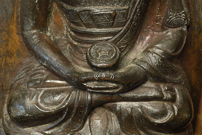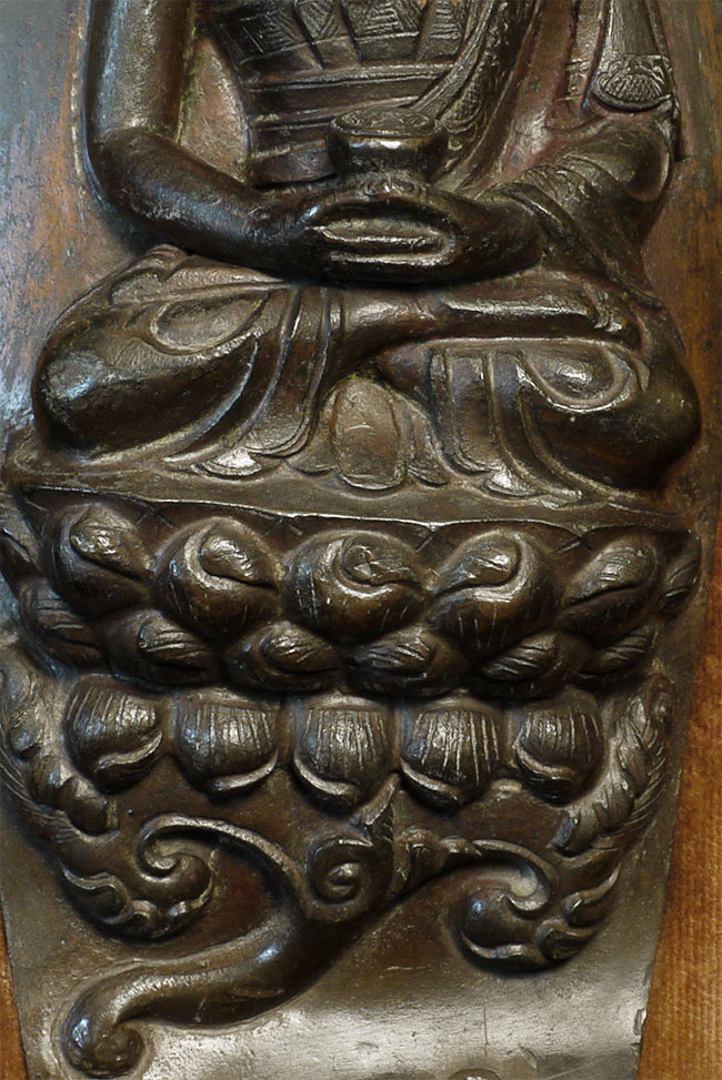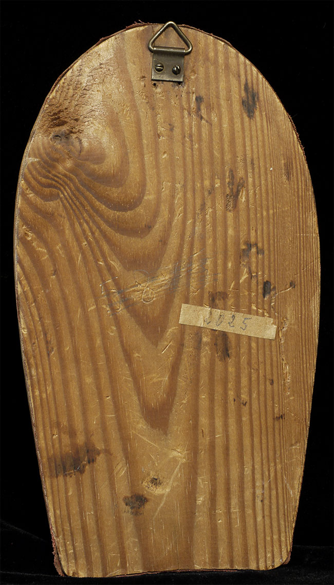 18thC Tibetan Buddha. Copper plaque stands 6.5" tall x 2" wide, mounted on a Victorian era fabric covered wooden back that is approximately 8.5" x 5"