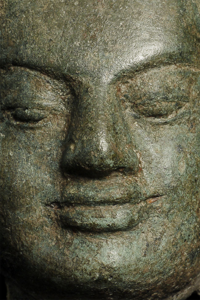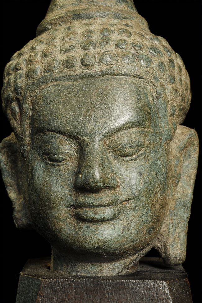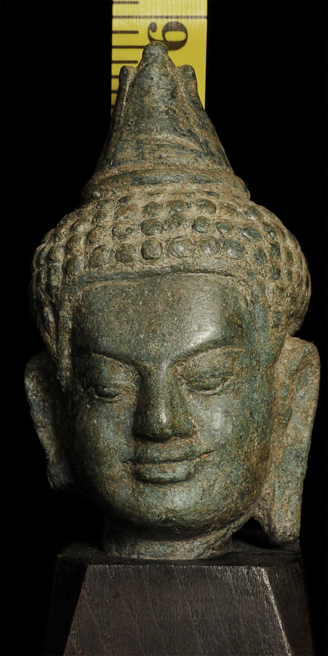 Excellent 13thC Thai Buddha in the Lopbori or Bayon style. Rare type. Has strong Khmer influence, as this is a transitional style from Khmer period to Utong period in Thailand. Sits happily at 3/8" tall; 6" with attached base. Loss to one ear